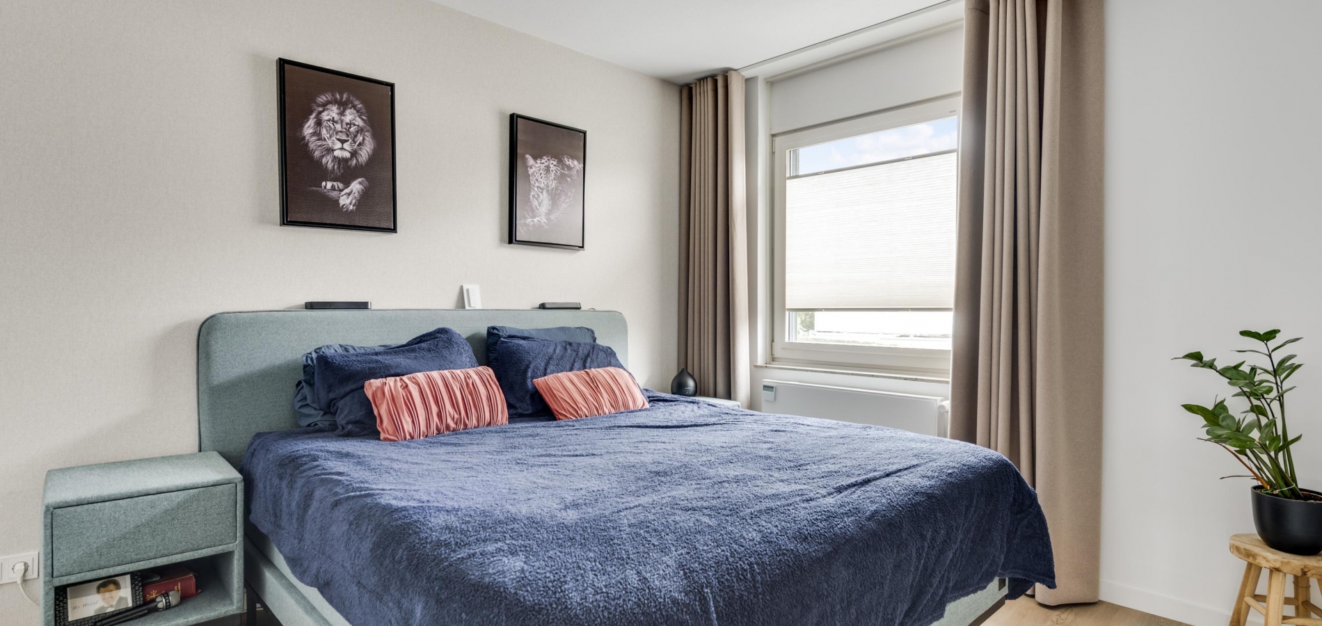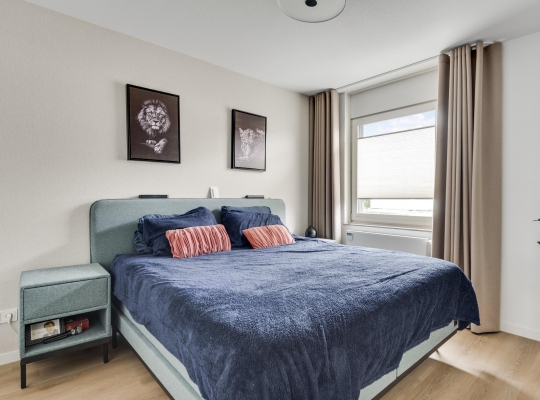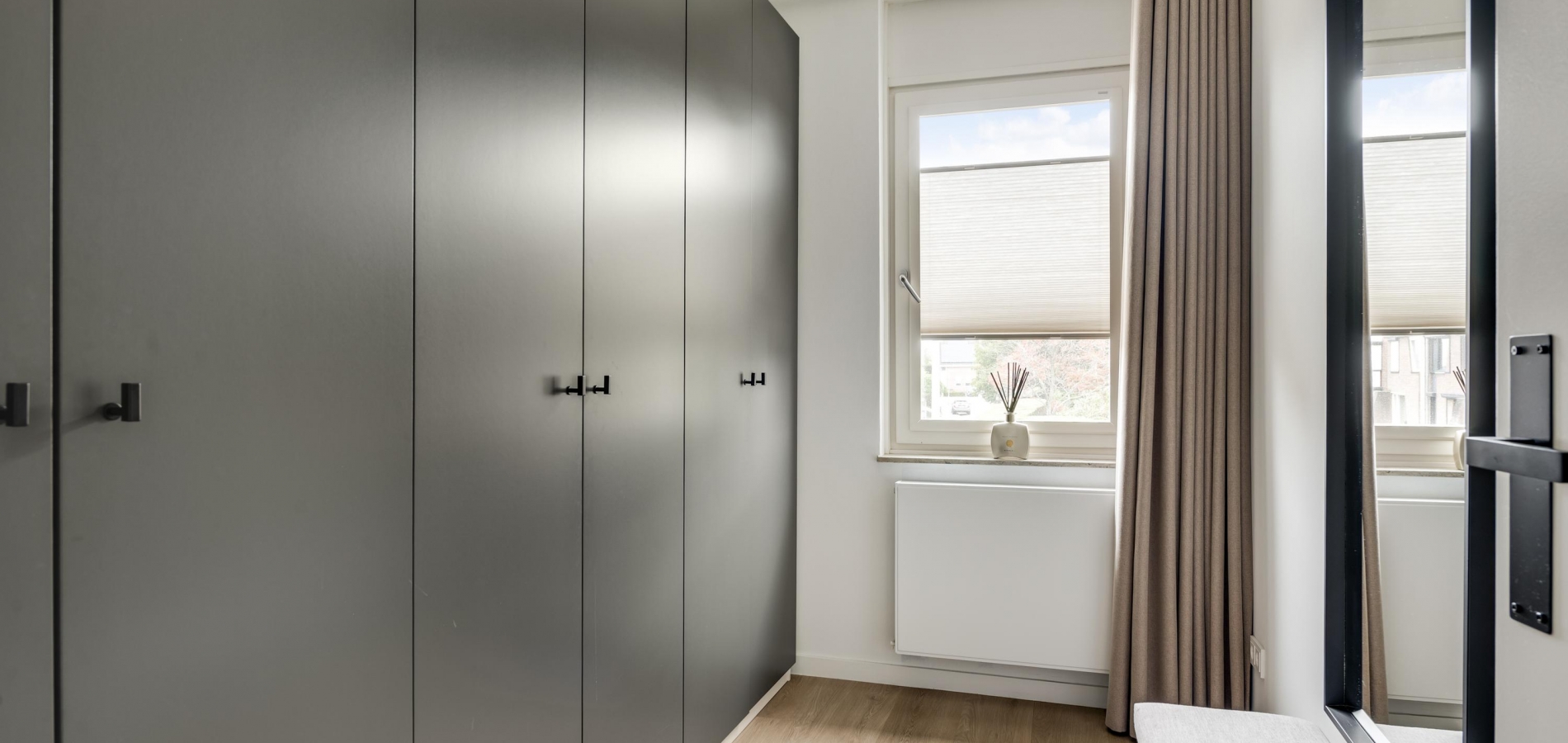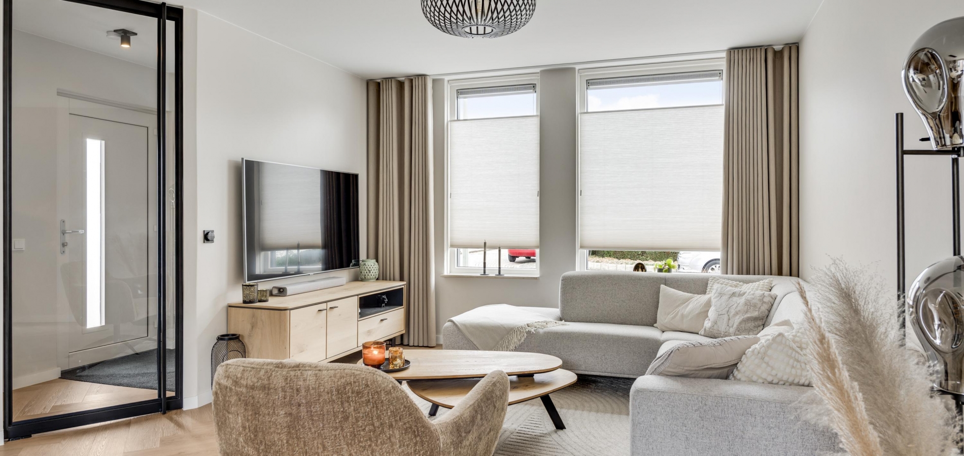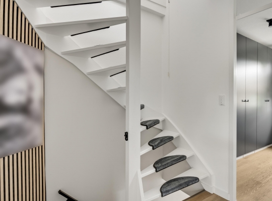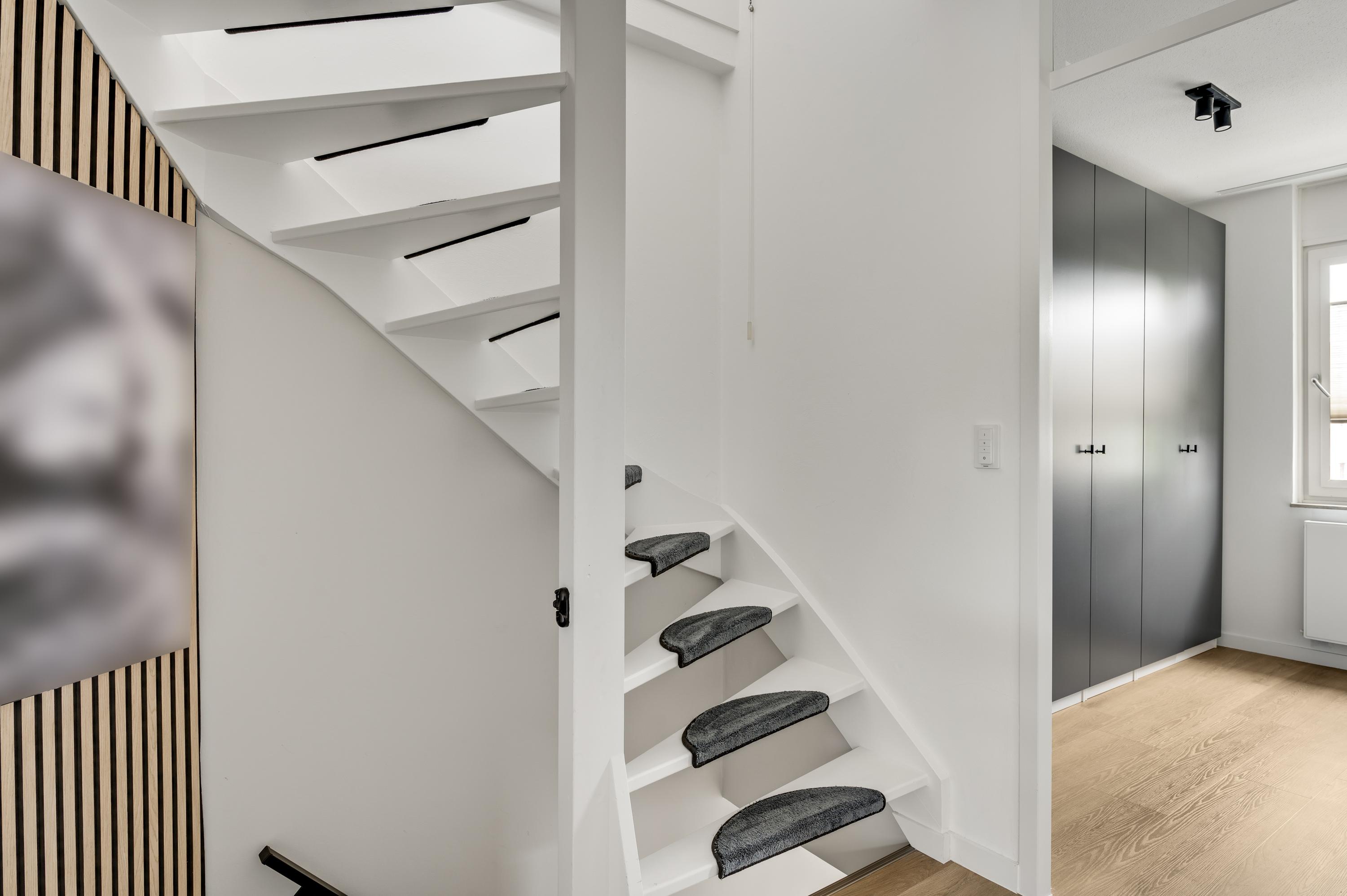 Niet alleen op de begane grond, maar ook op de eerste verdieping is dit huis helemaal af. Op bijna de hele verdieping ligt een houtlook pvc-vloer en de wanden zijn voorzien van behang. Op de overloop, bij de trap, is een trendy lattenwand geplaatst en de zwarte leuning maakt het geheel af.