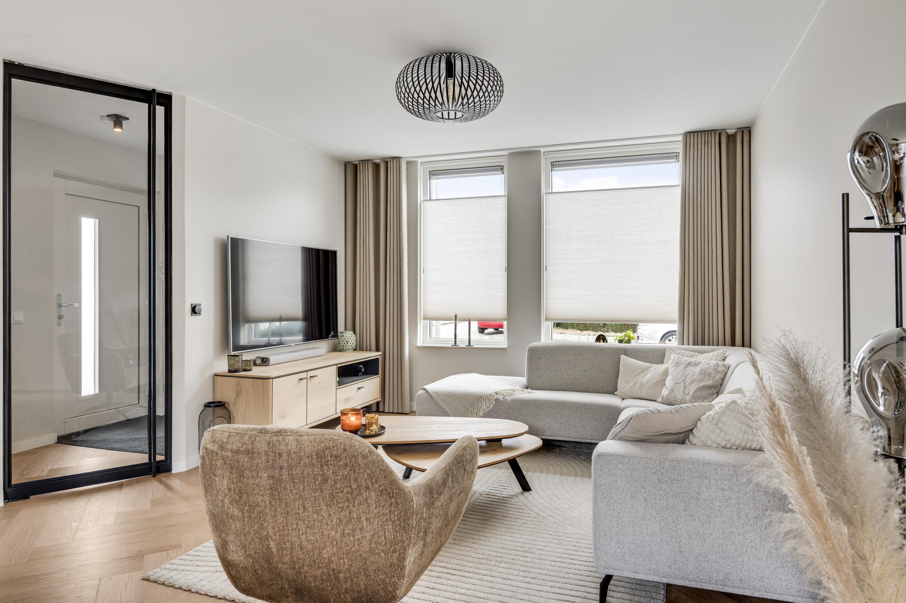 Wow! Wat een fraaie uitstraling heeft deze instapklare woning! Aan de rechterzijde, naast de garage, is de entree van dit droomhuis. In de hal ligt, net als in de woonkamer en keuken, een stijlvolle visgraatvloer. Verder ziet u mooi tapijt op de trap en een trendy zwarte taatsdeur met glas. Vanuit de hal heeft u onder andere toegang tot de fraaie toiletruimte met fonteintje.