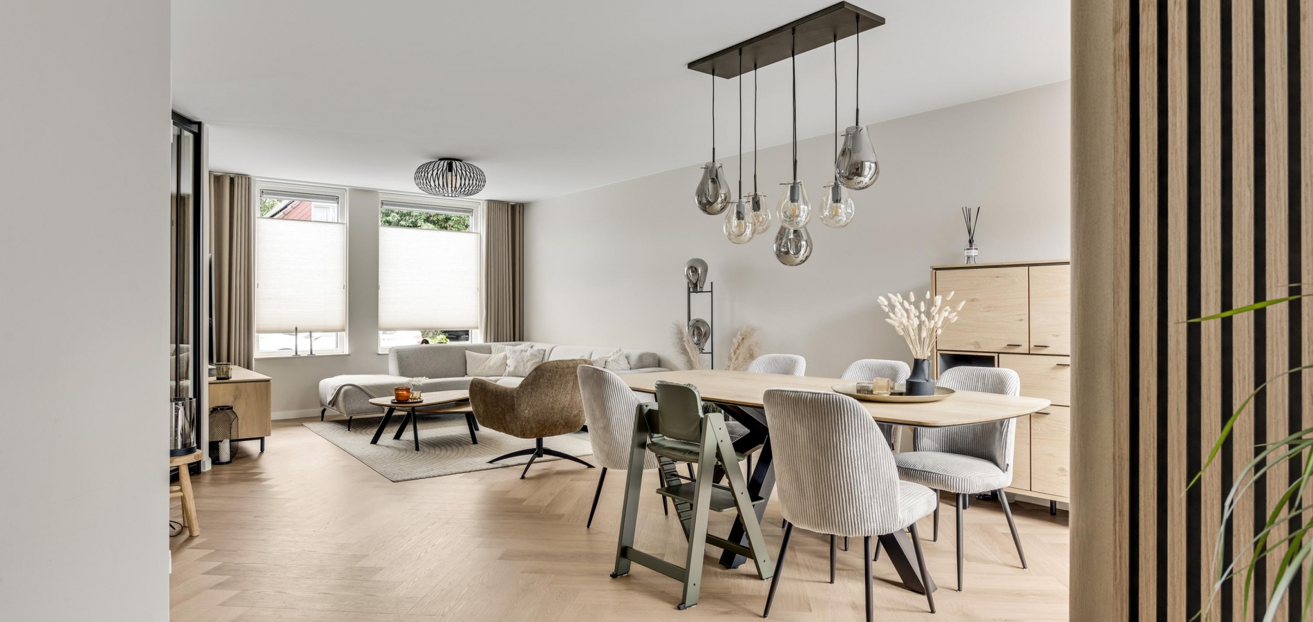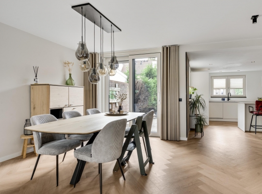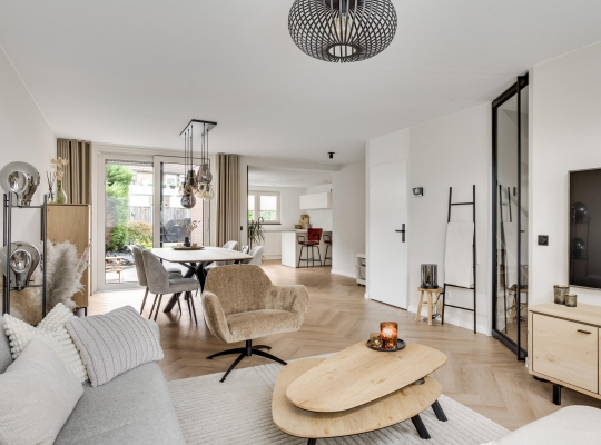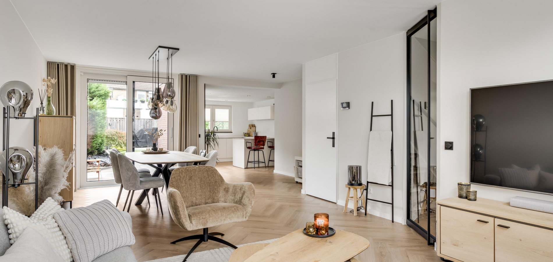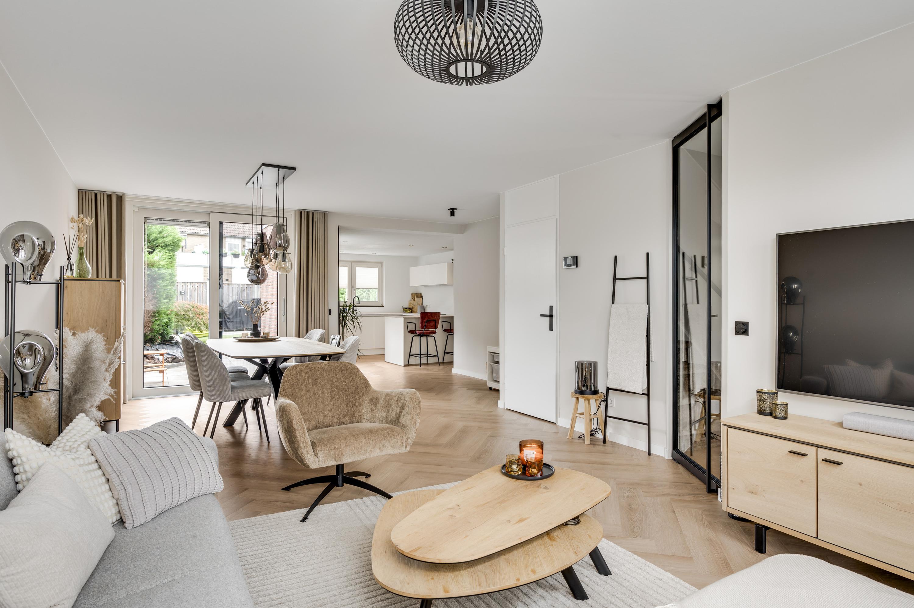 De woon-/eetkamer heeft een oppervlakte van circa 33 m2, met het zitgedeelte aan de voorzijde en het eetgedeelte aan de achterzijde. Onder de trap is een bergkast en de schuifpui zorgt voor een fraaie verbinding met de tuin.
