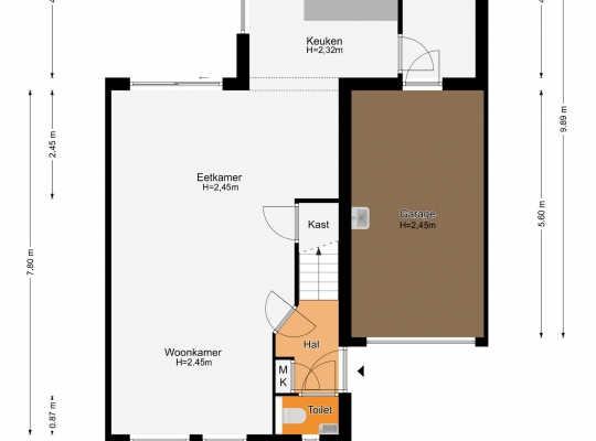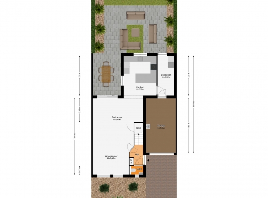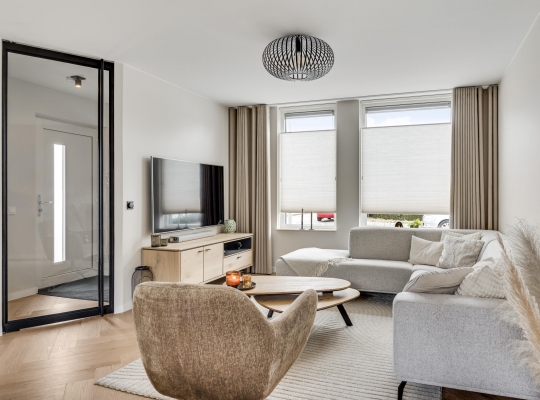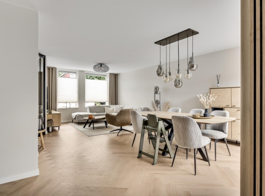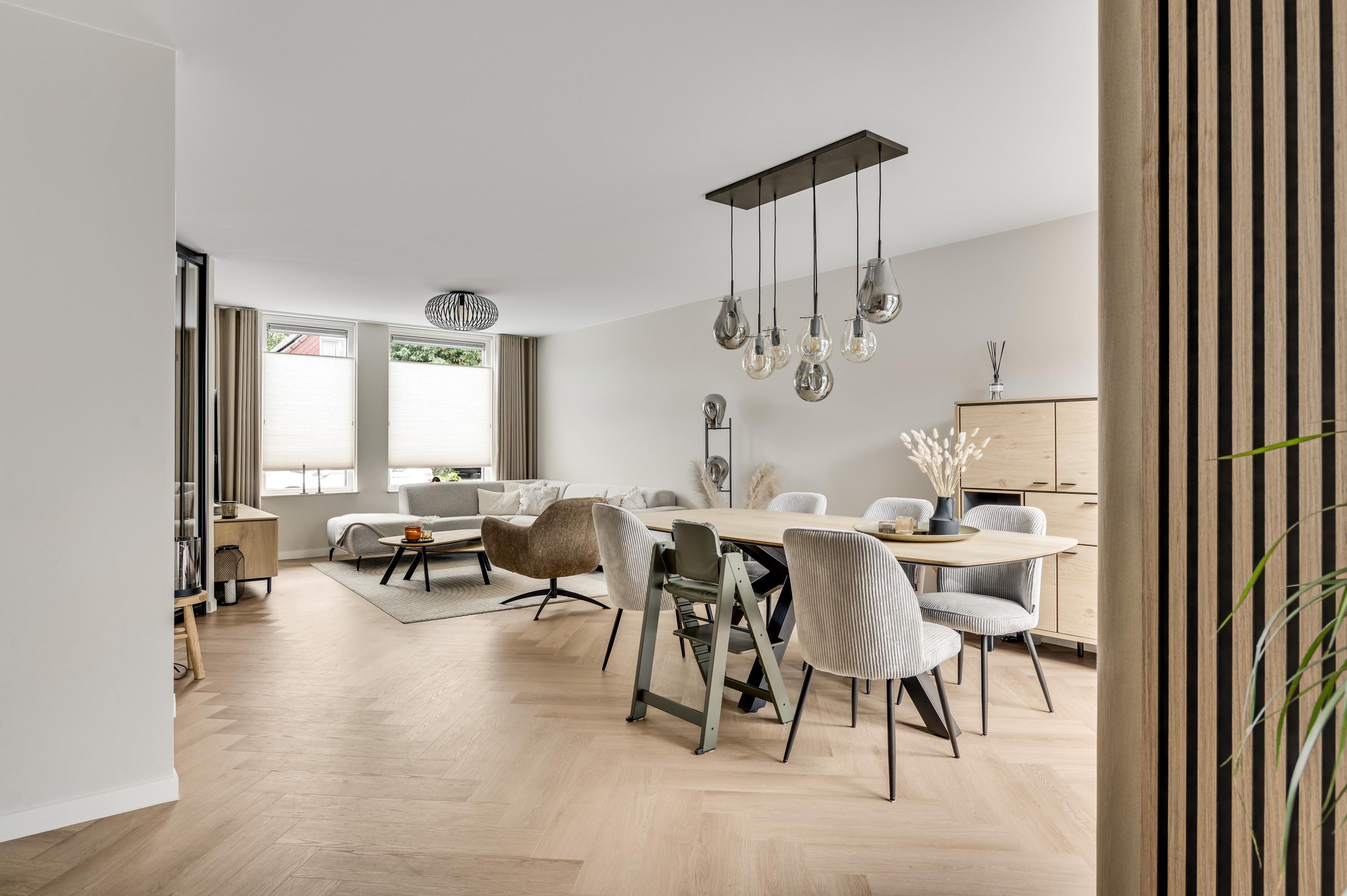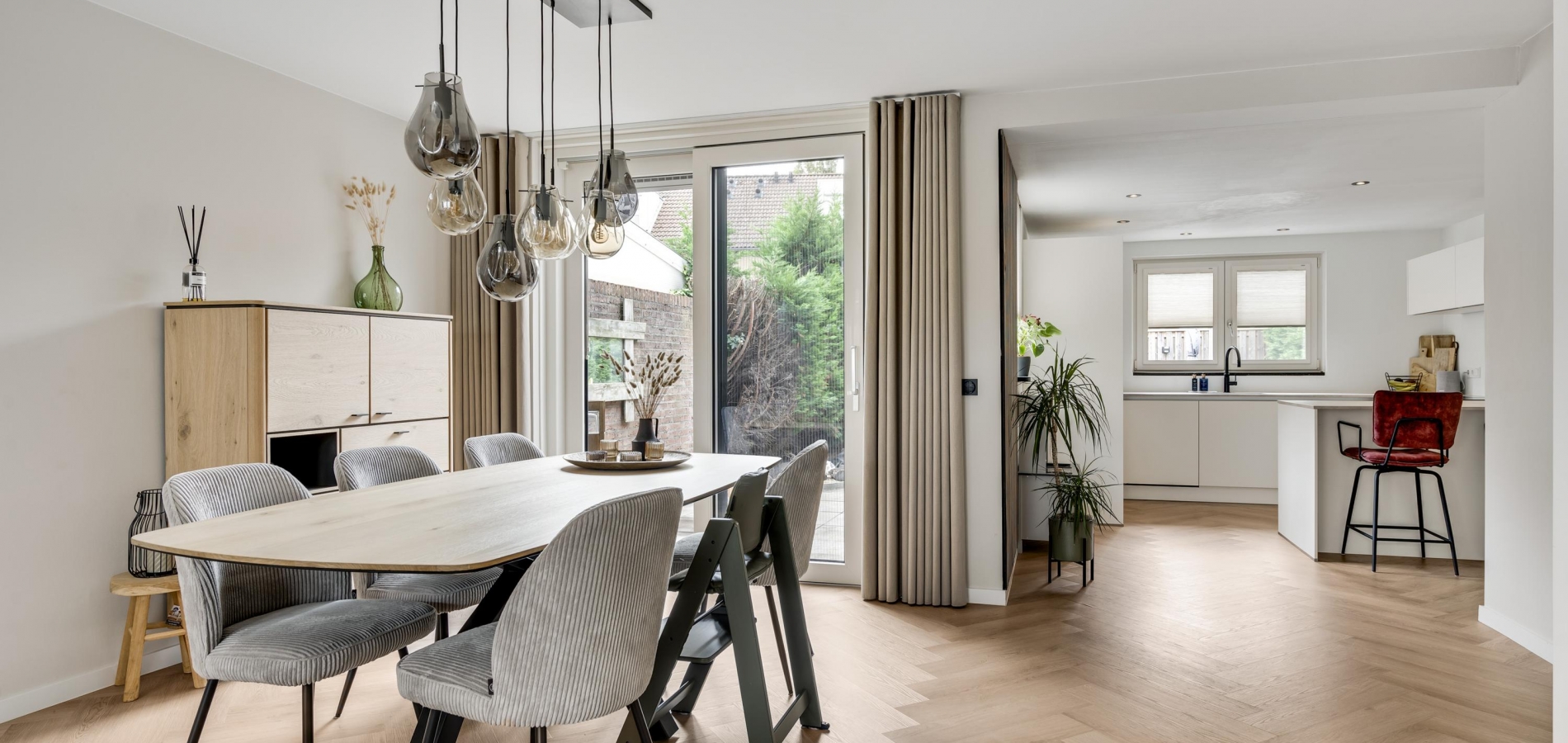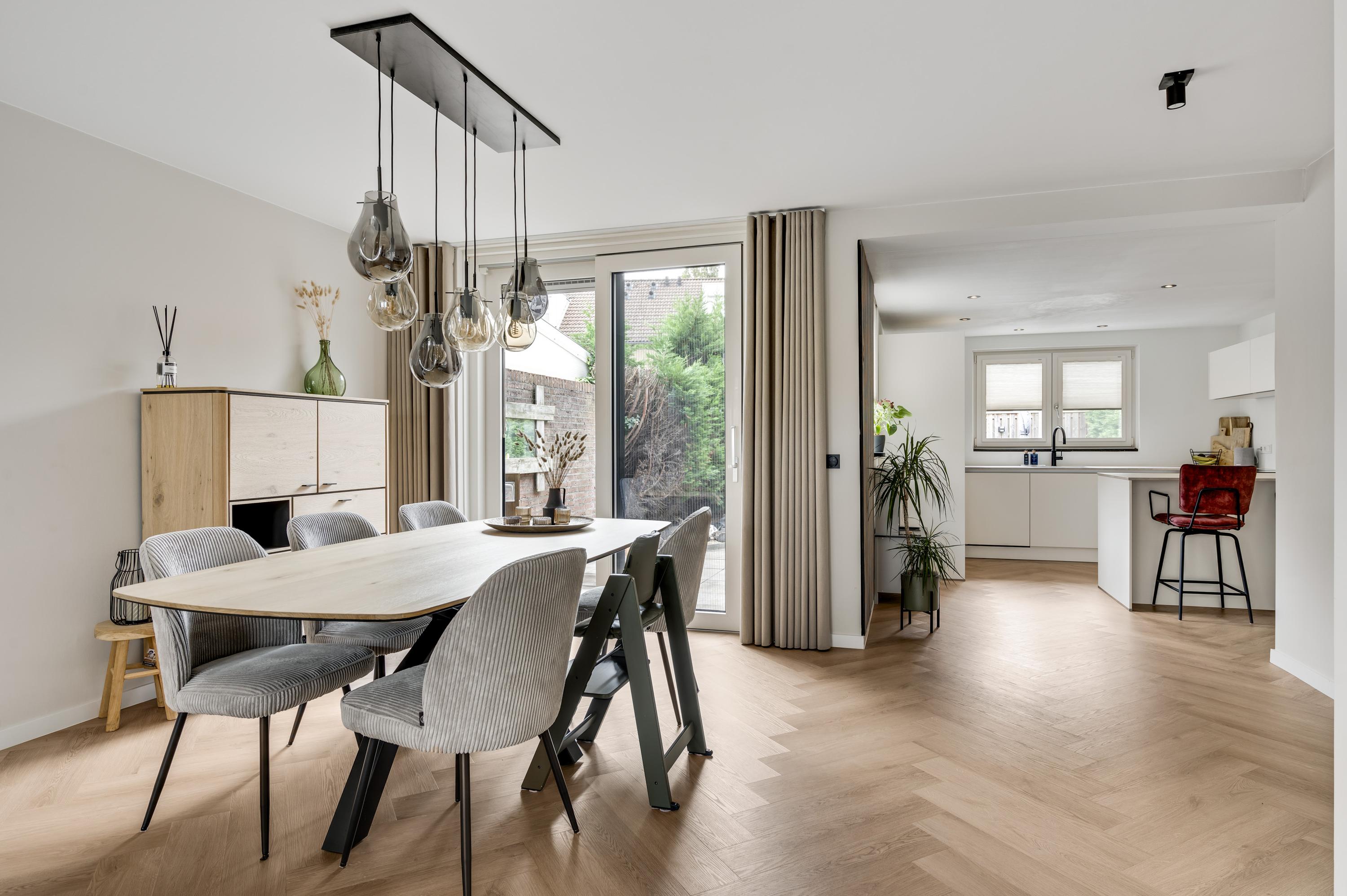 De woon-/eetkamer heeft een oppervlakte van circa 33 m2, met het zitgedeelte aan de voorzijde en het eetgedeelte aan de achterzijde. Onder de trap is een bergkast en de schuifpui zorgt voor een fraaie verbinding met de tuin.
