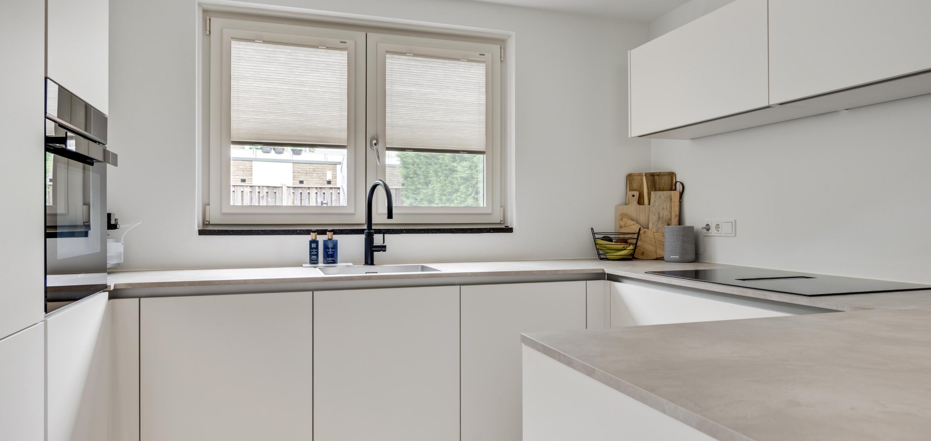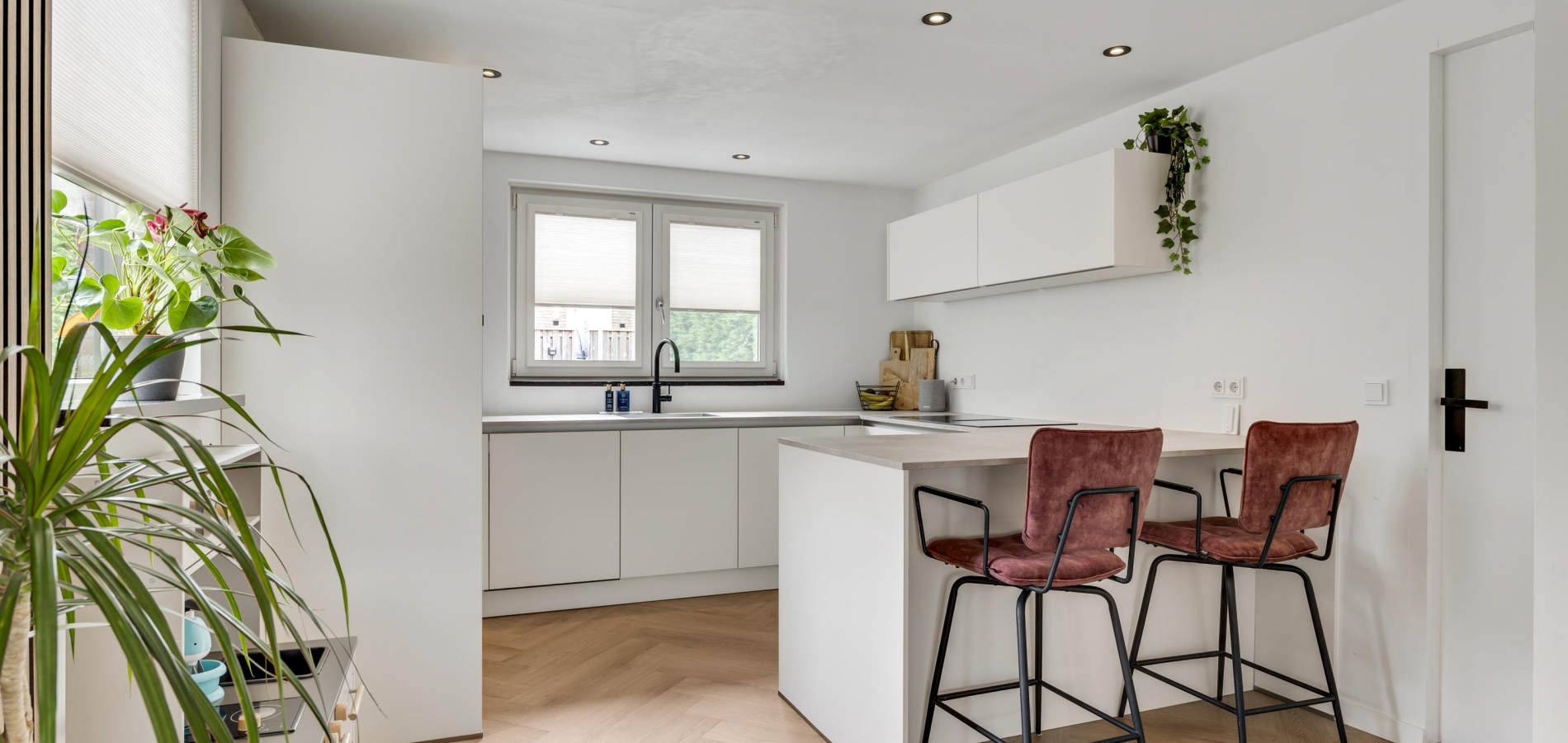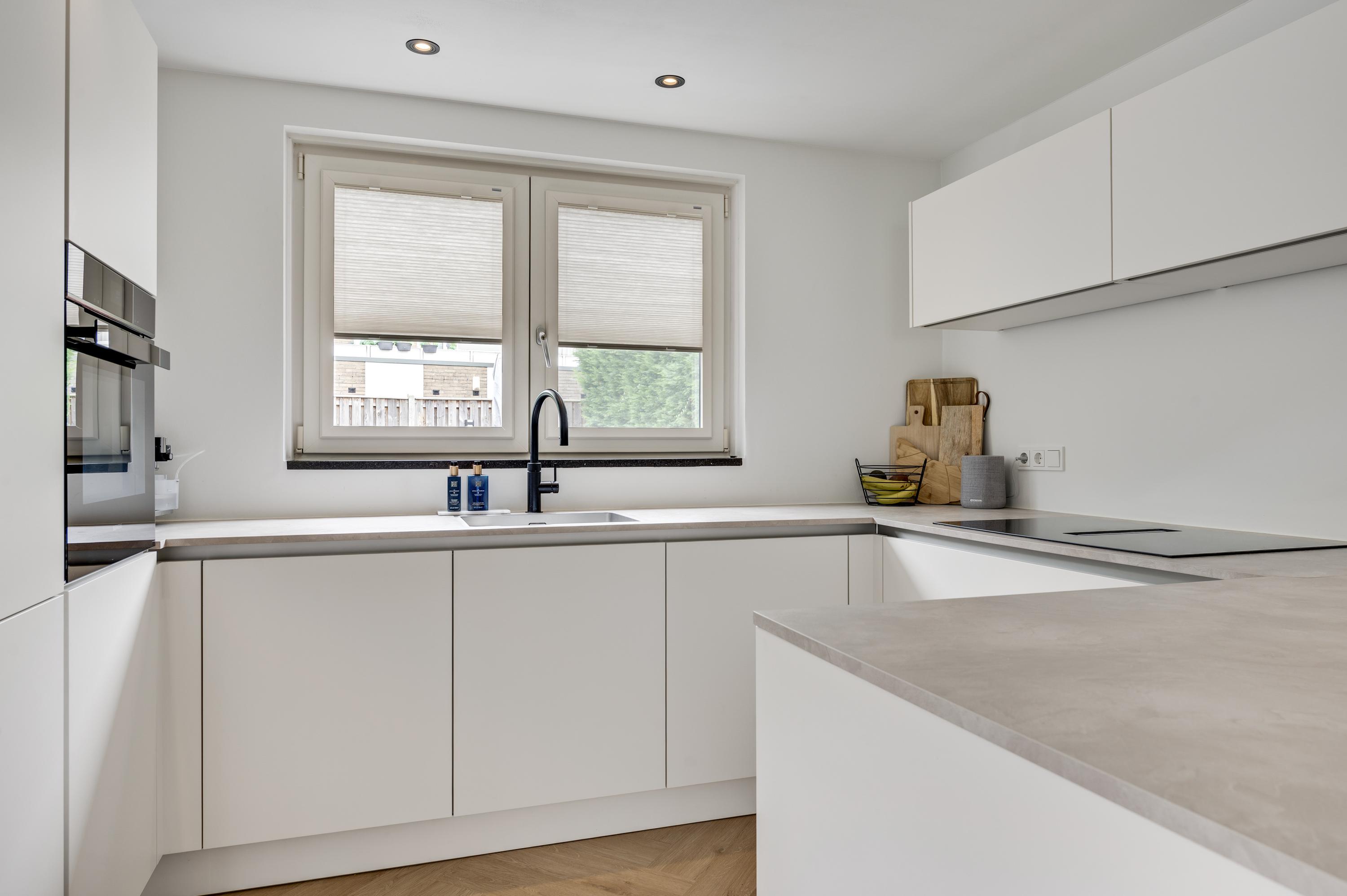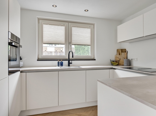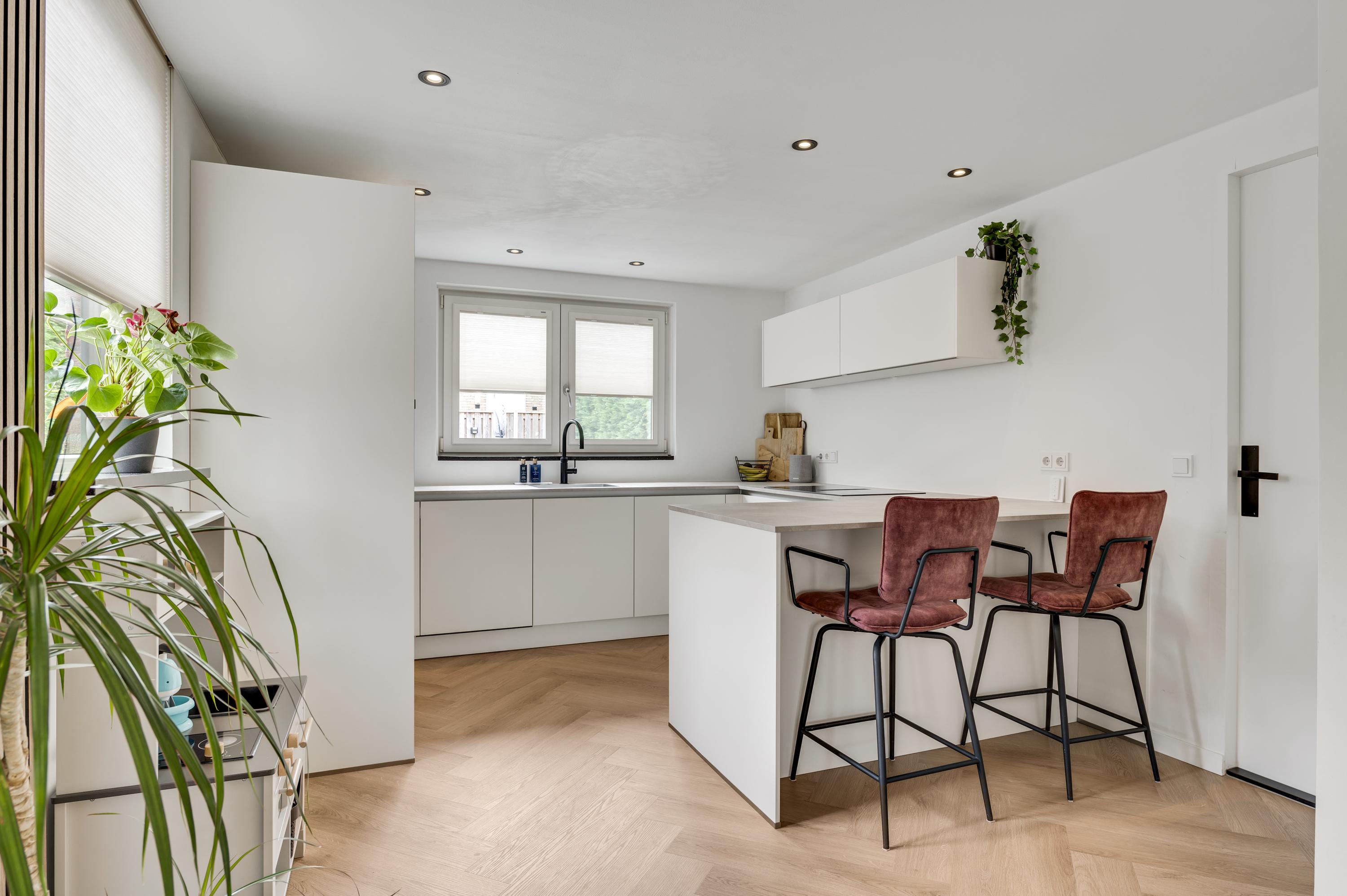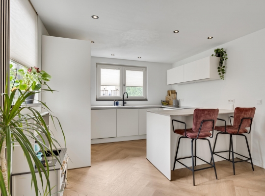 Vanuit de woon-/eetkamer kijkt u naar de luxe keuken (circa 4,00 x 3,36), met lichtinval aan twee zijden en inbouwverlichting in het plafond. De keukenopstelling (2023/2024) biedt volop bergruimte en alle benodigde apparatuur is ingebouwd: een inductie kookplaat met afzuiging, een Quooker, grote combi-oven, vaatwasser en een koelkast.