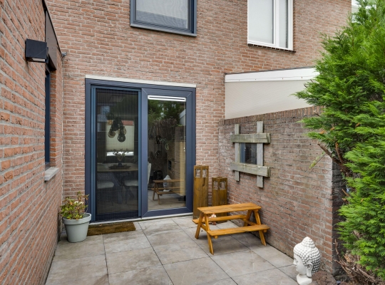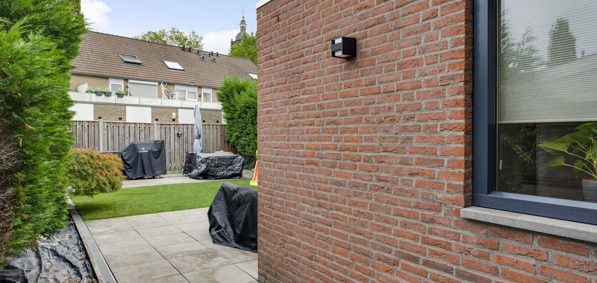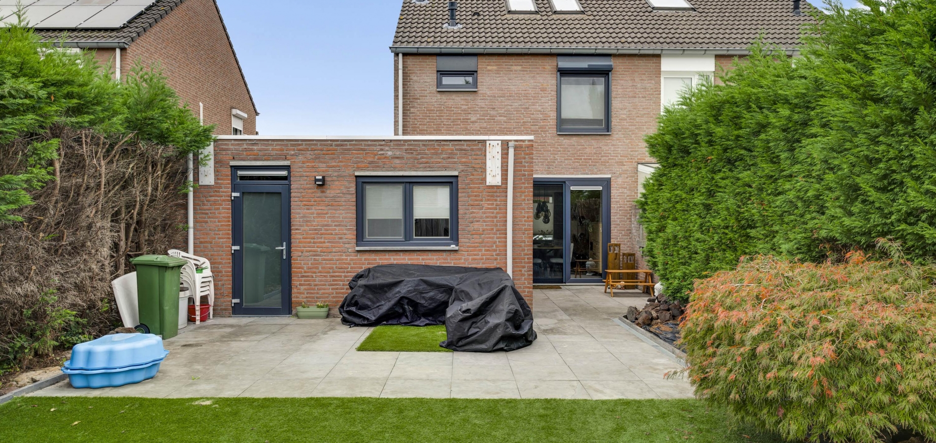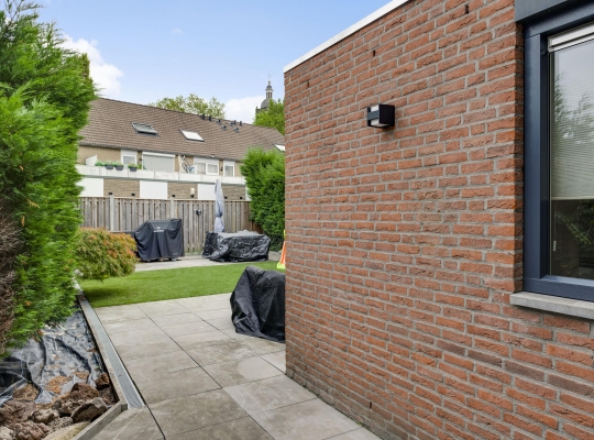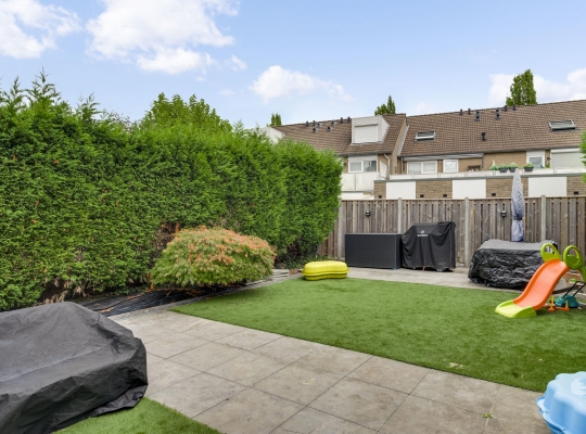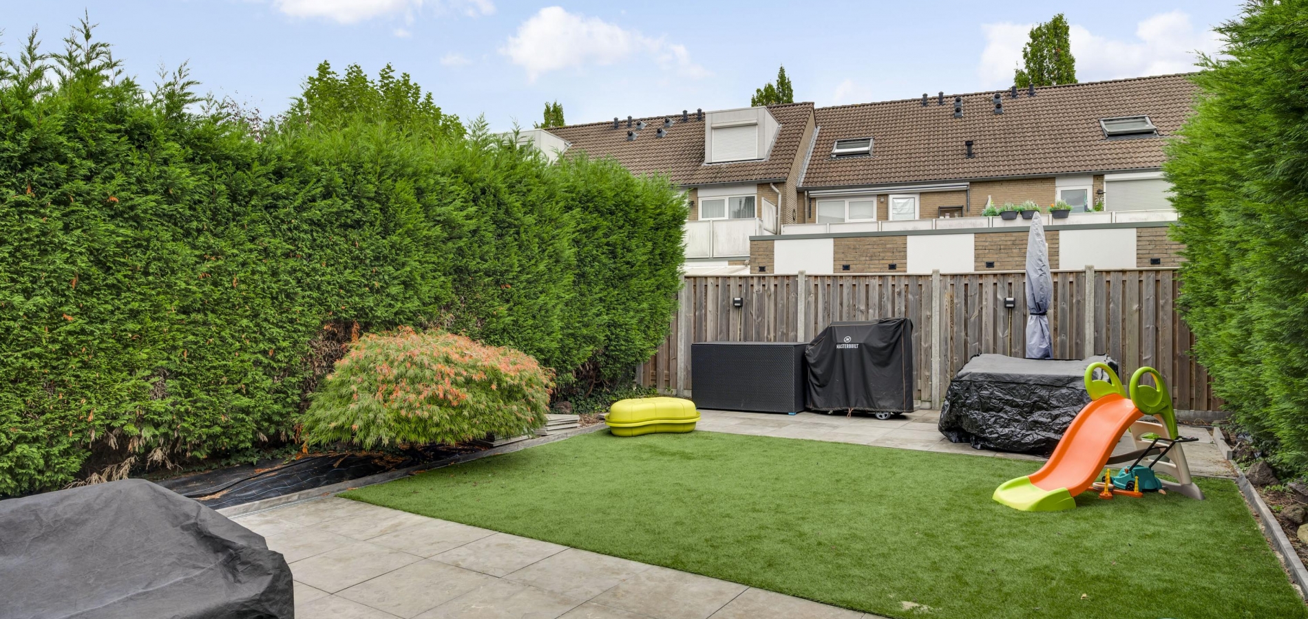 Zowel de voortuin (west) als de achtertuin (oost) zijn heel onderhoudsvriendelijk aangelegd. In de achtertuin zijn grote tuintegels gecombineerd met kunstgras en aan twee kanten staat een hoge coniferenhaag.