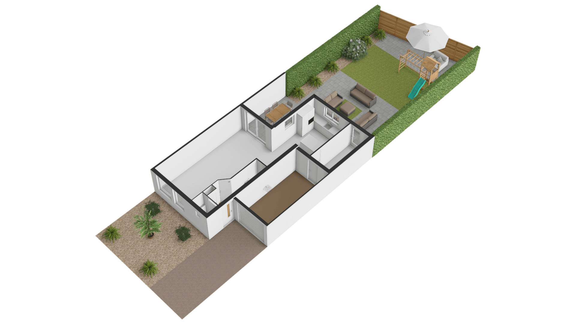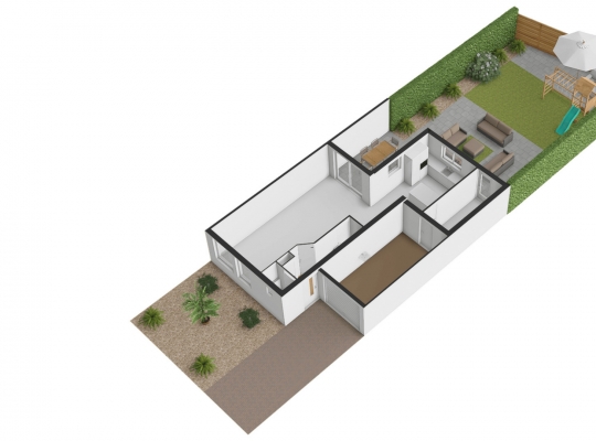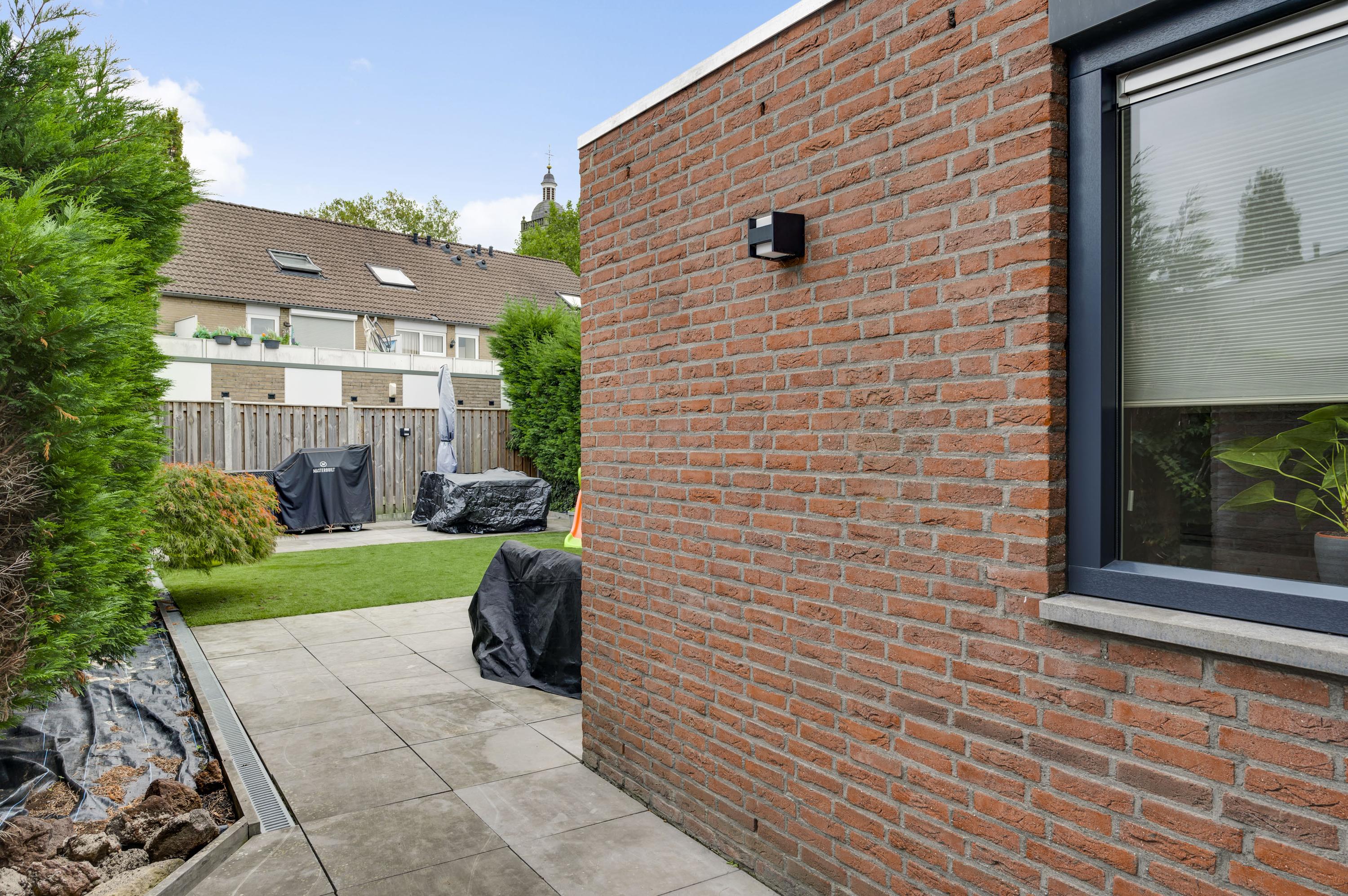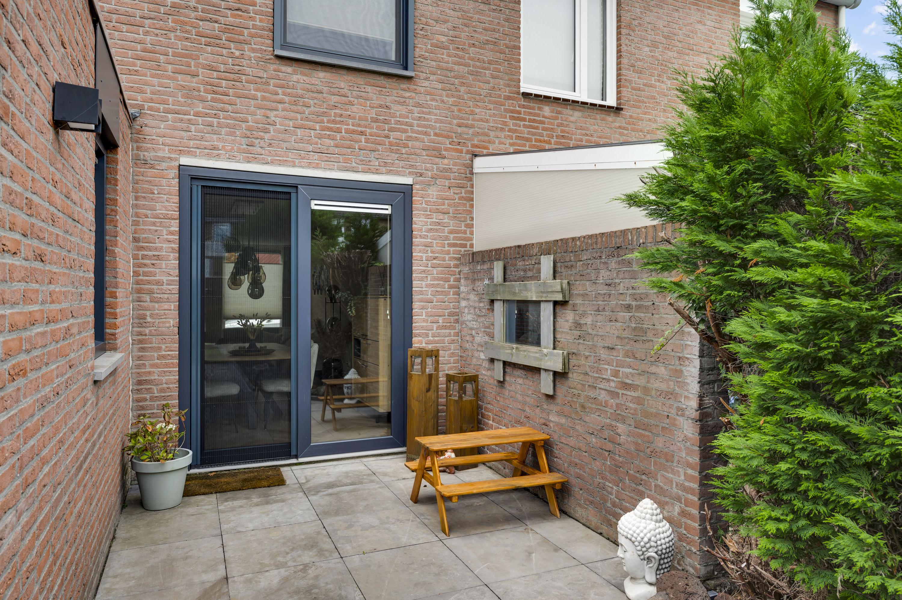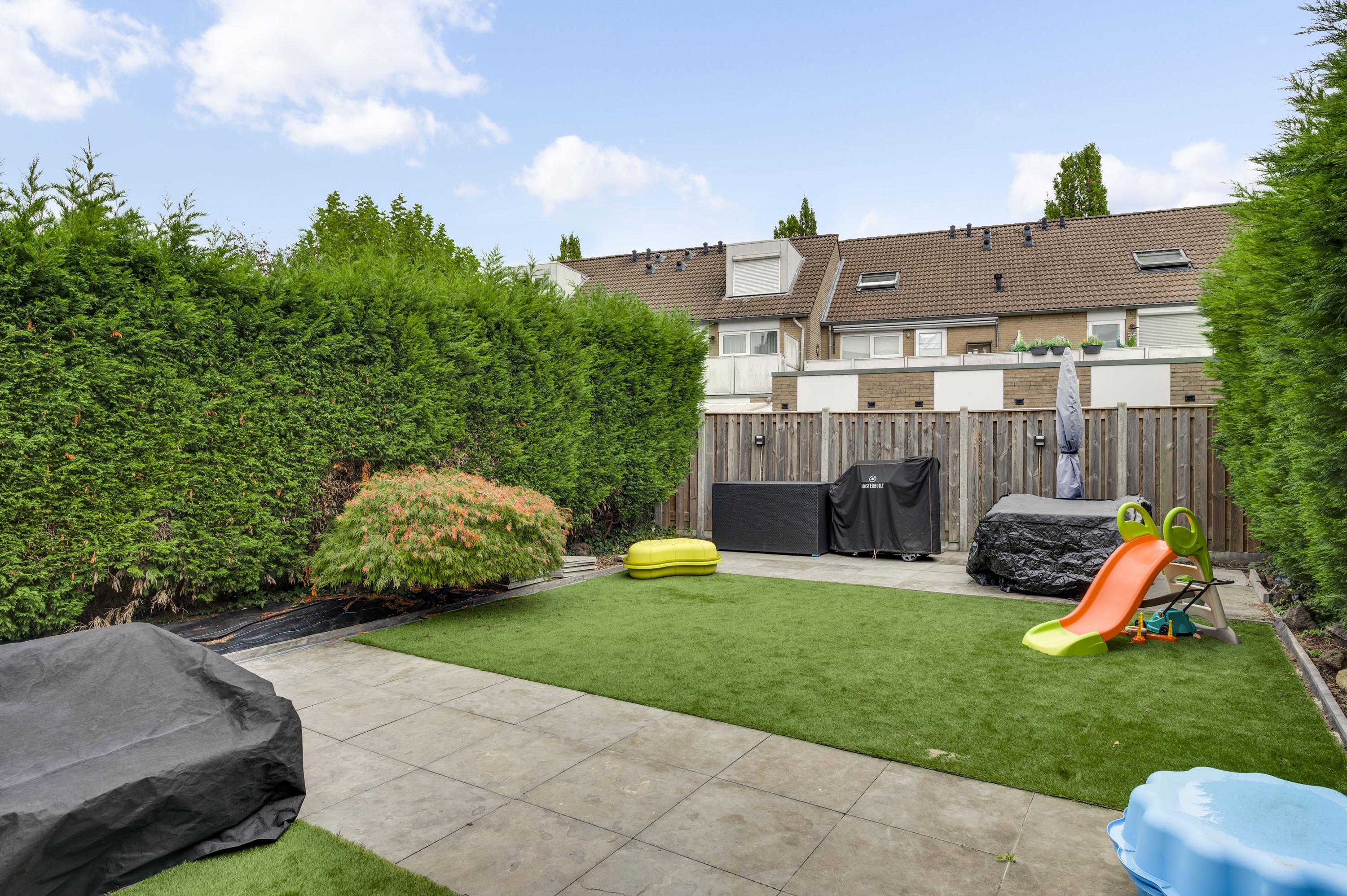 Zowel de voortuin (west) als de achtertuin (oost) zijn heel onderhoudsvriendelijk aangelegd. In de achtertuin zijn grote tuintegels gecombineerd met kunstgras en aan twee kanten staat een hoge coniferenhaag.