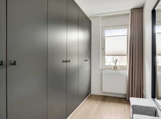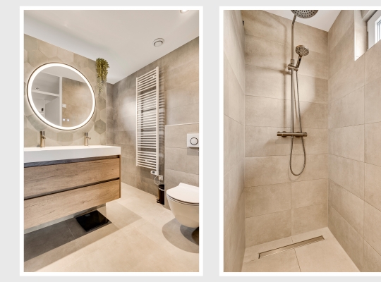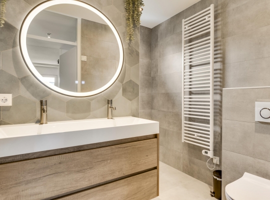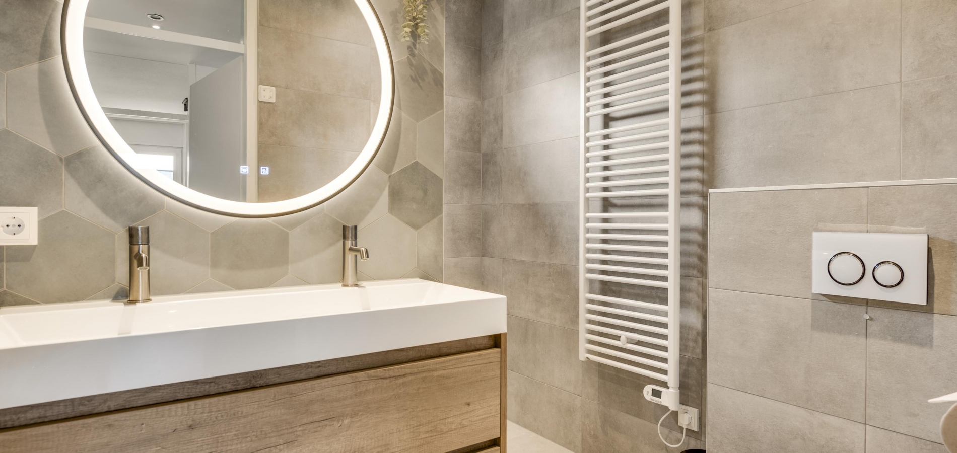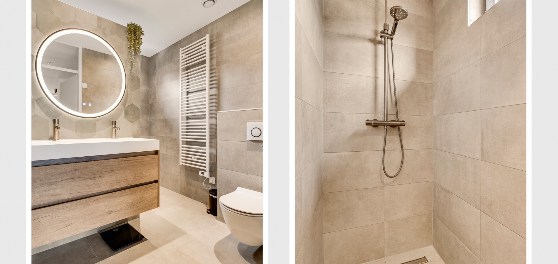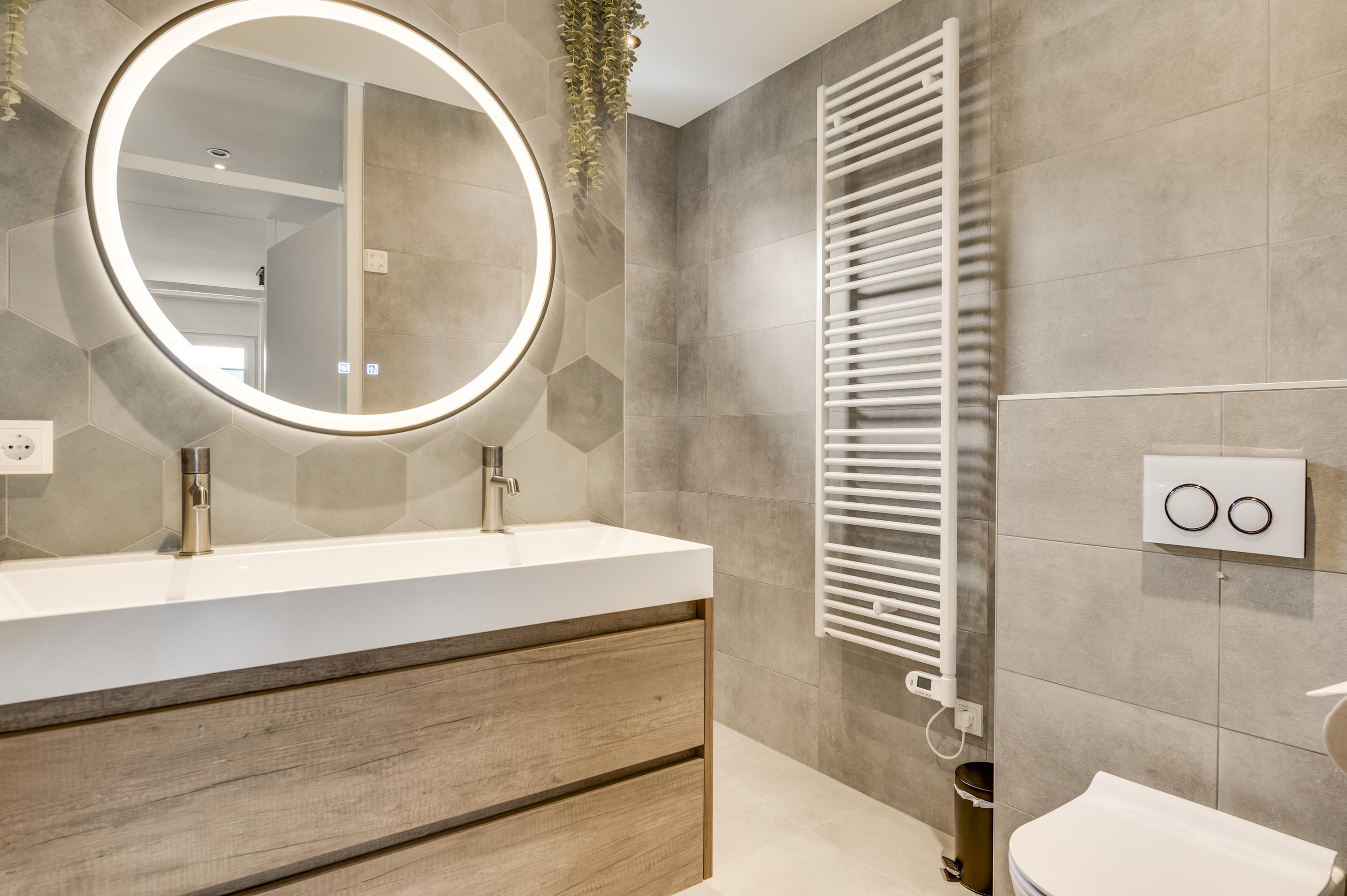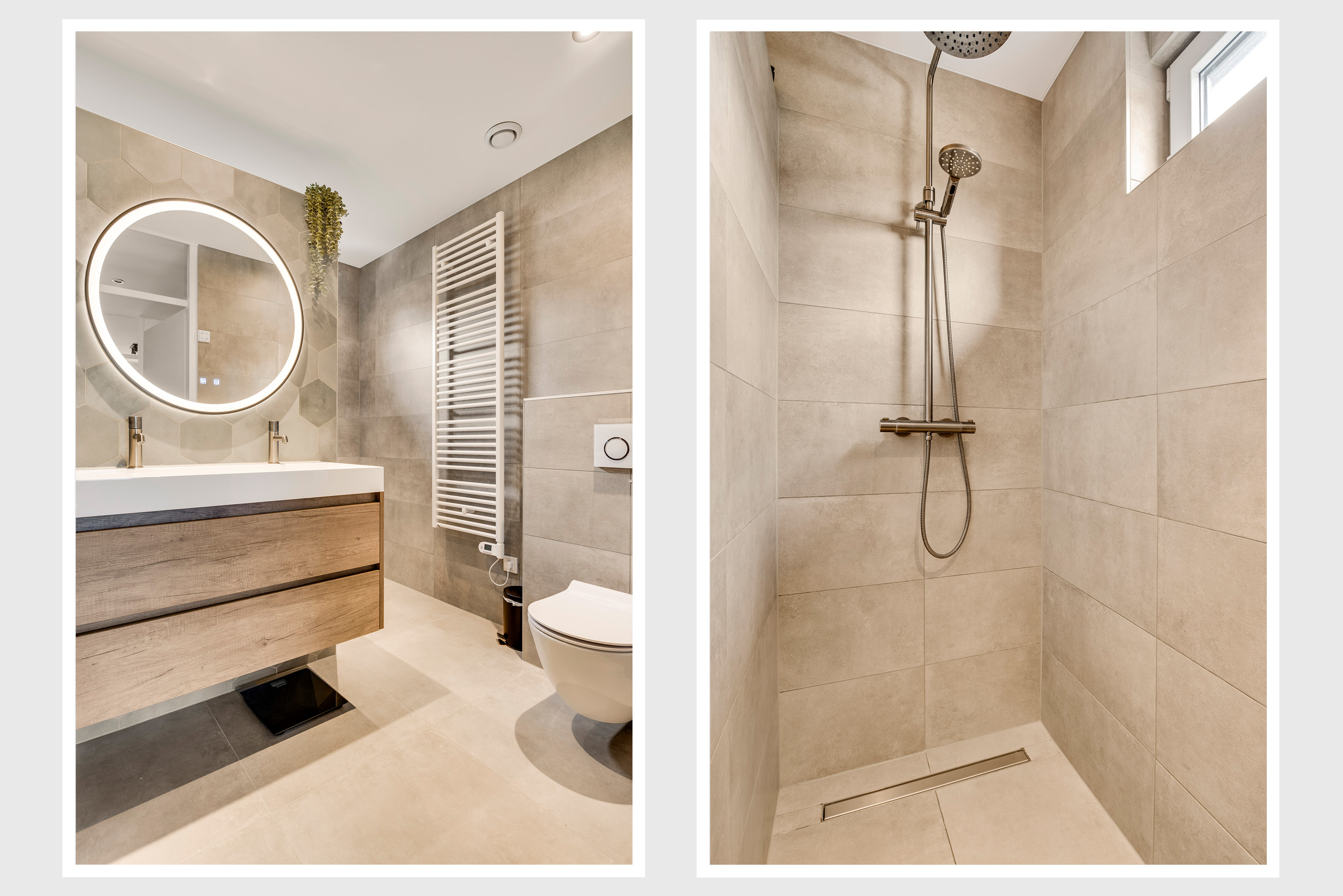 De stijlvolle badkamer (circa 2,42 x 2,07) heeft de wow-factor. U heeft de beschikking over een grote inloopdouche, tweede toilet, een elektrische handdoekenradiator en een breed wastafelmeubel met ronde spiegel. Alles klopt, van de kranen tot het tegelwerk.