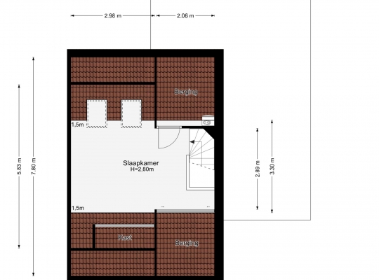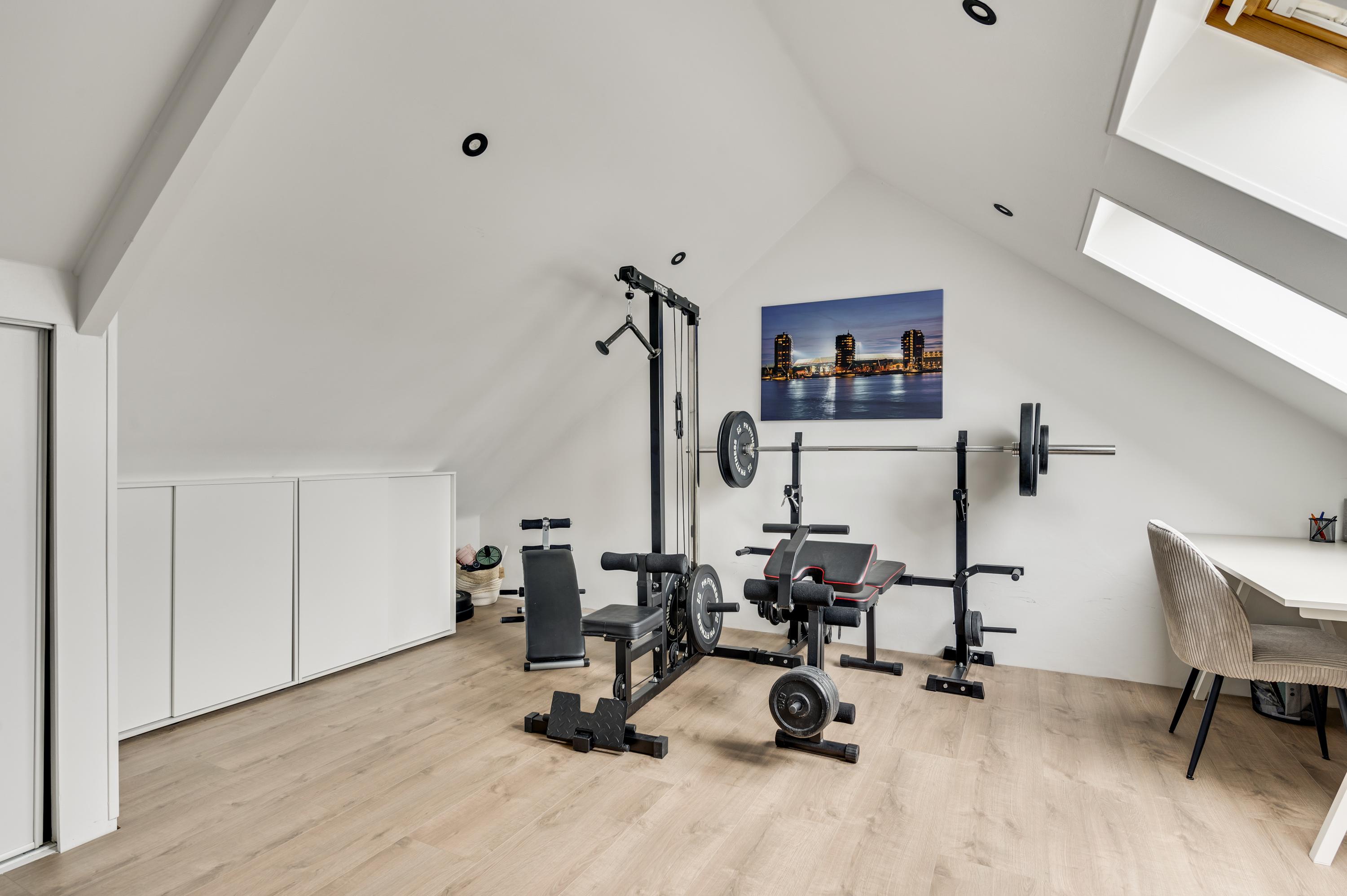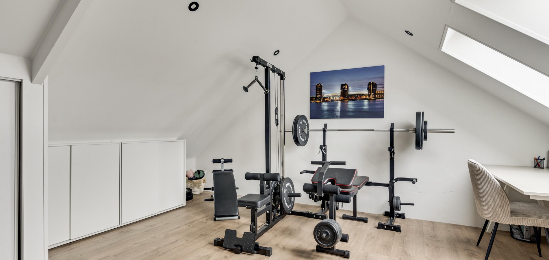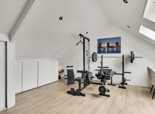 Slaapkamer IV (circa 5,11 x 5,83 inclusief bergingen) is een zeer royale en lichte ruimte, die nu als sportruimte wordt gebruikt. Twee dakramen zorgen voor veel lichtinval en in het schuine dak is verlichting ingebouwd. Op deze verdieping ligt een mooie laminaatvloer, waardoor u al snel kunt beginnen met inrichten.
