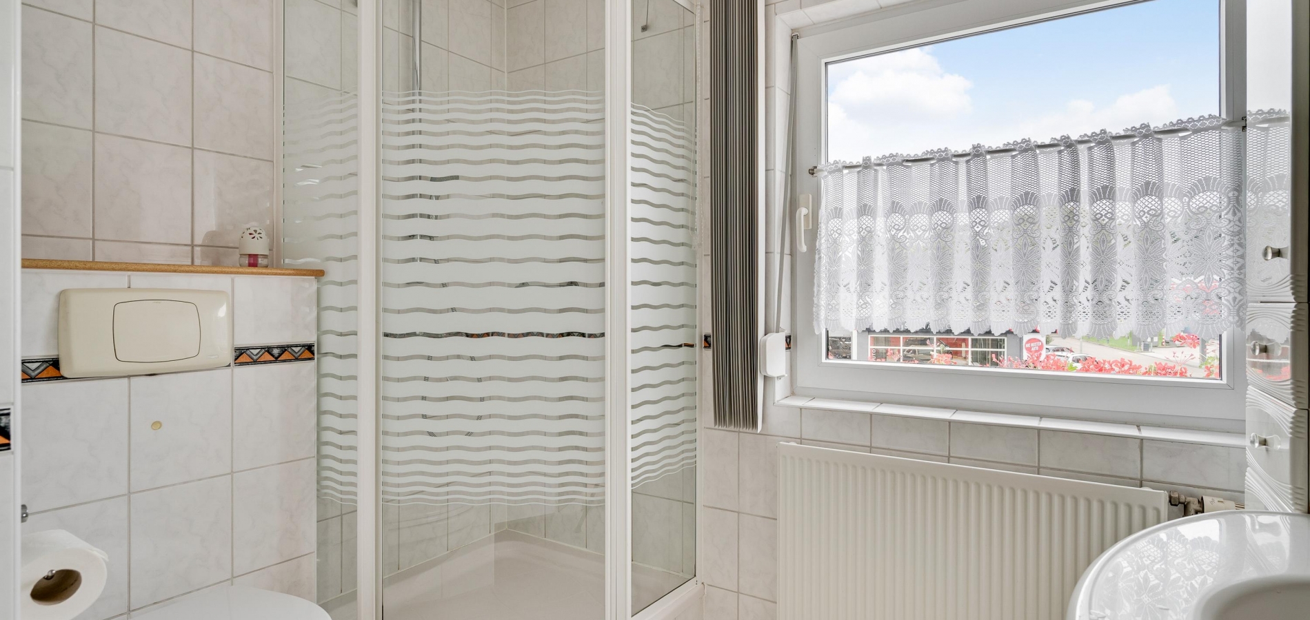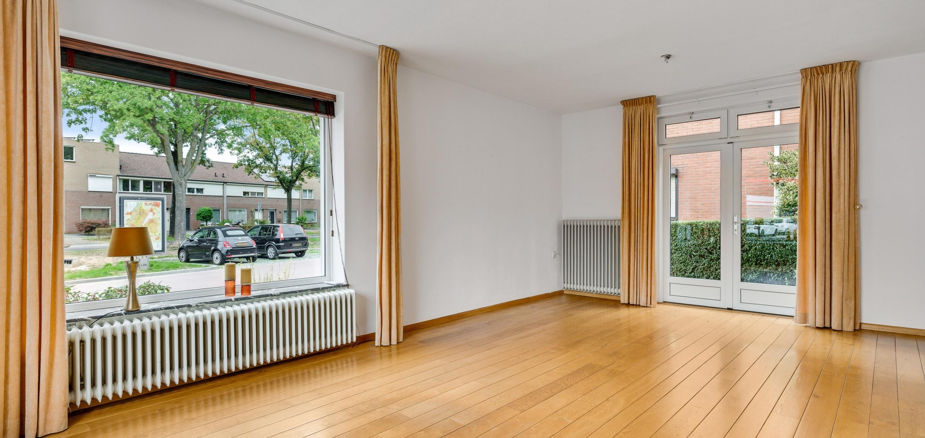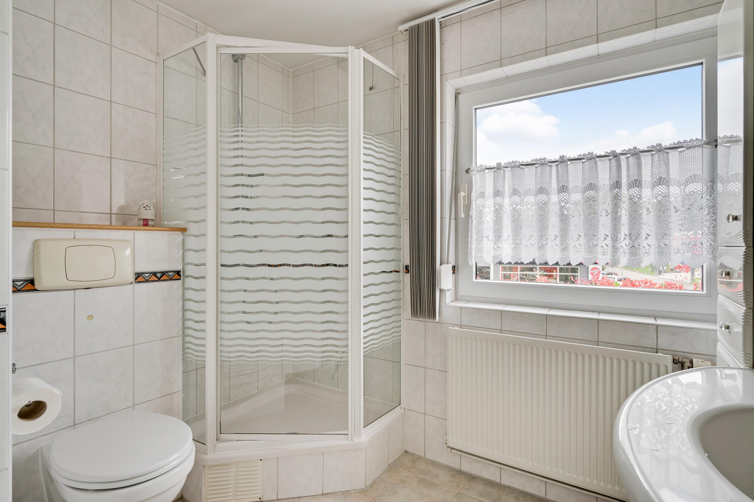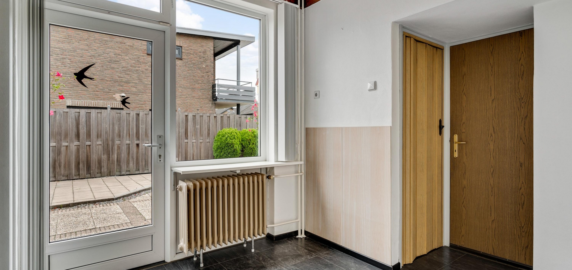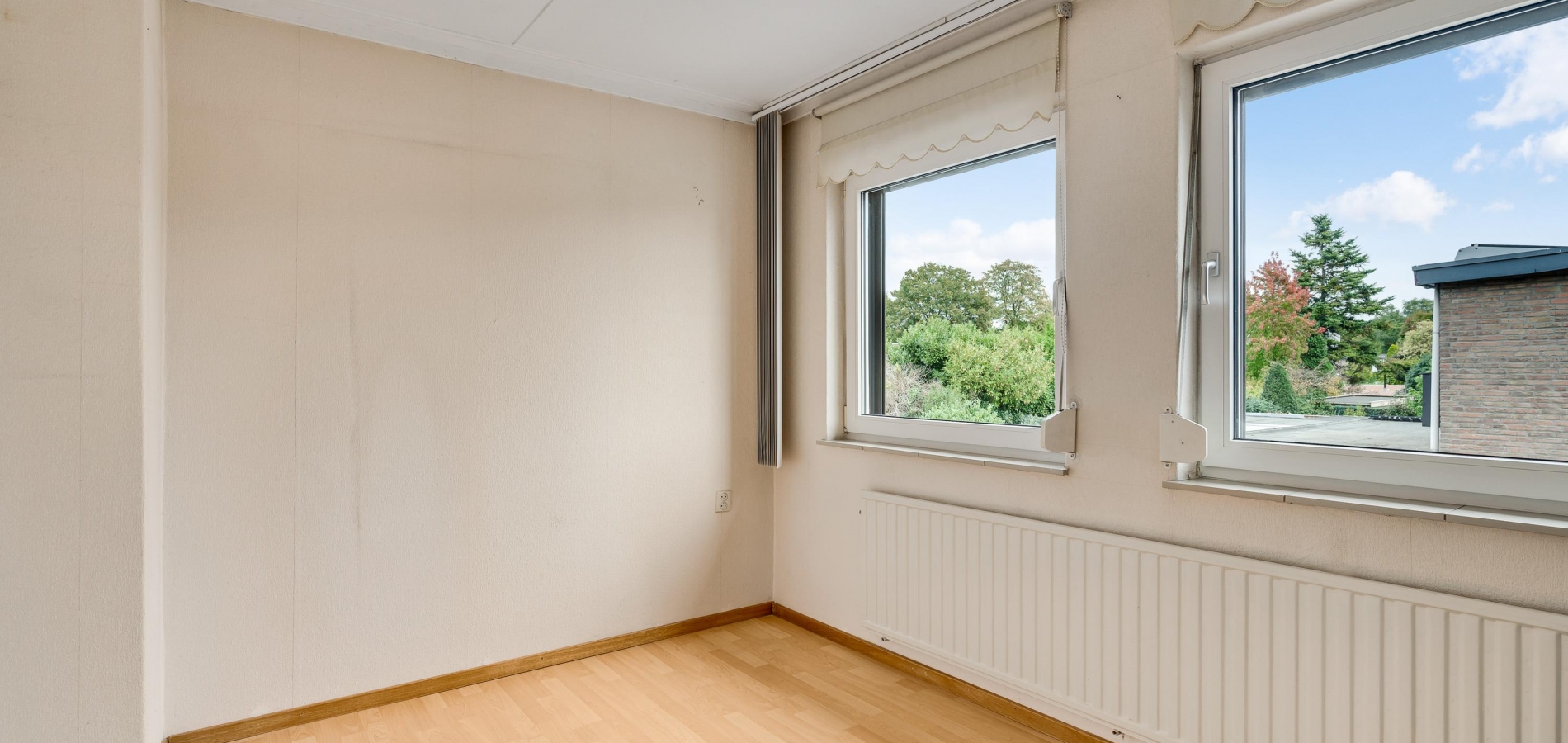 Meerdere screens (woonkamer), zonnescherm (keuken) en rolluiken (woonkamer en eerste verdieping)