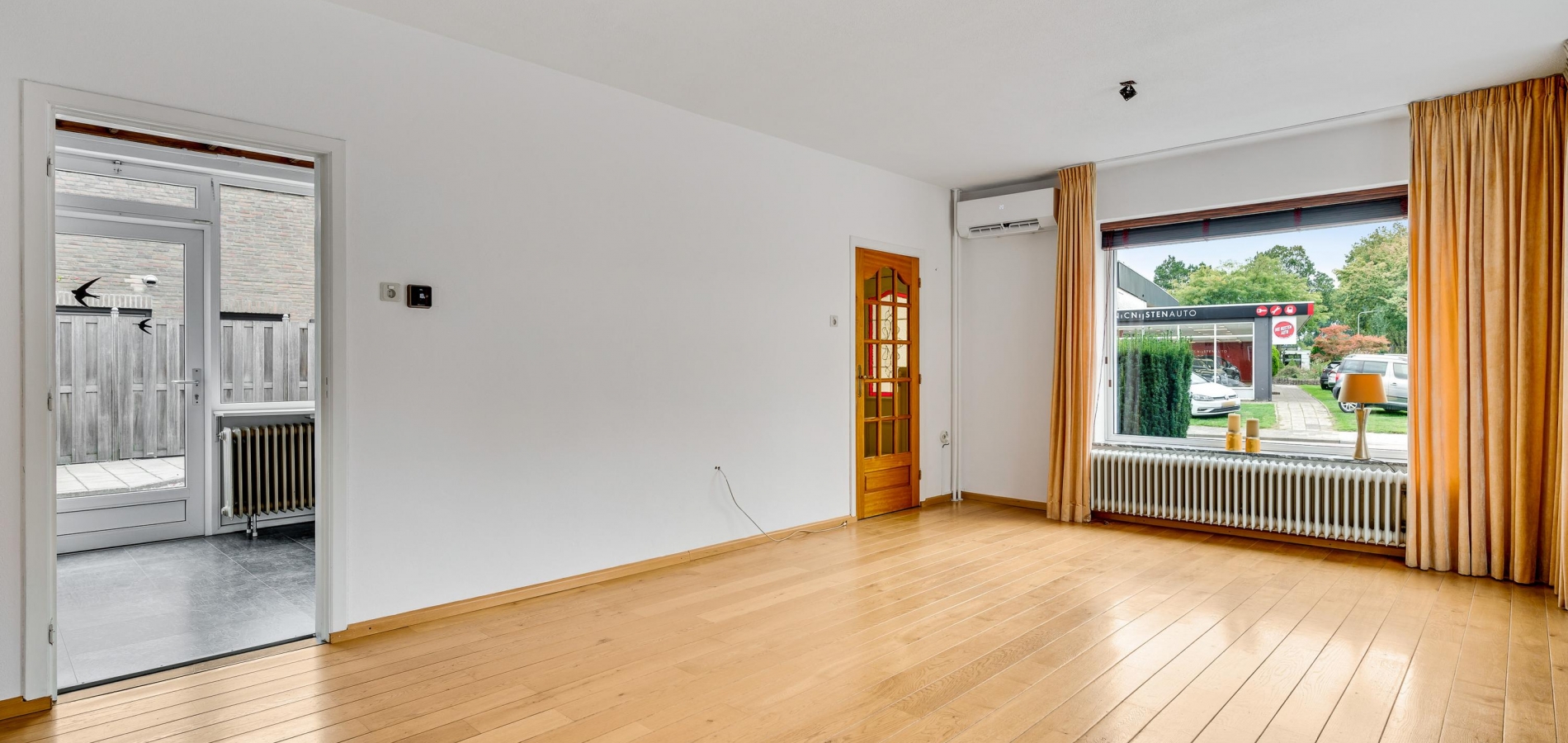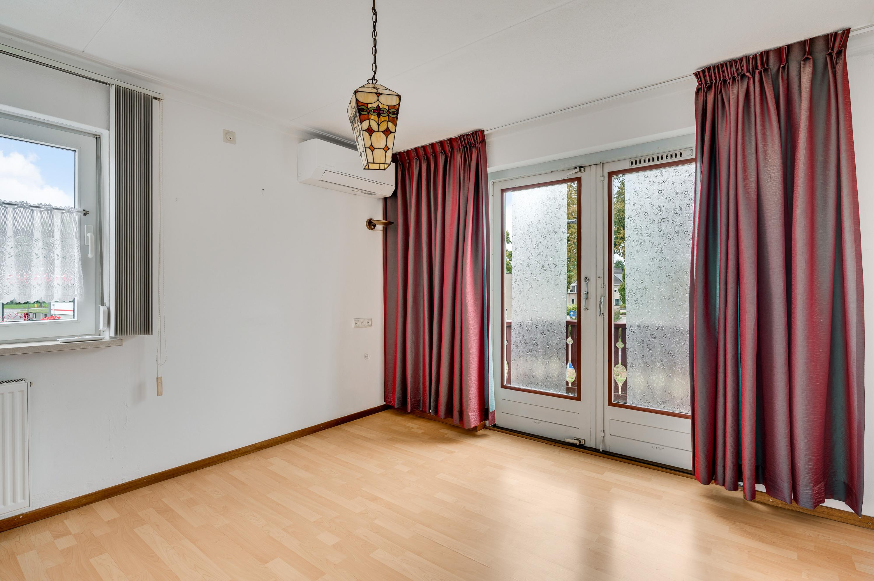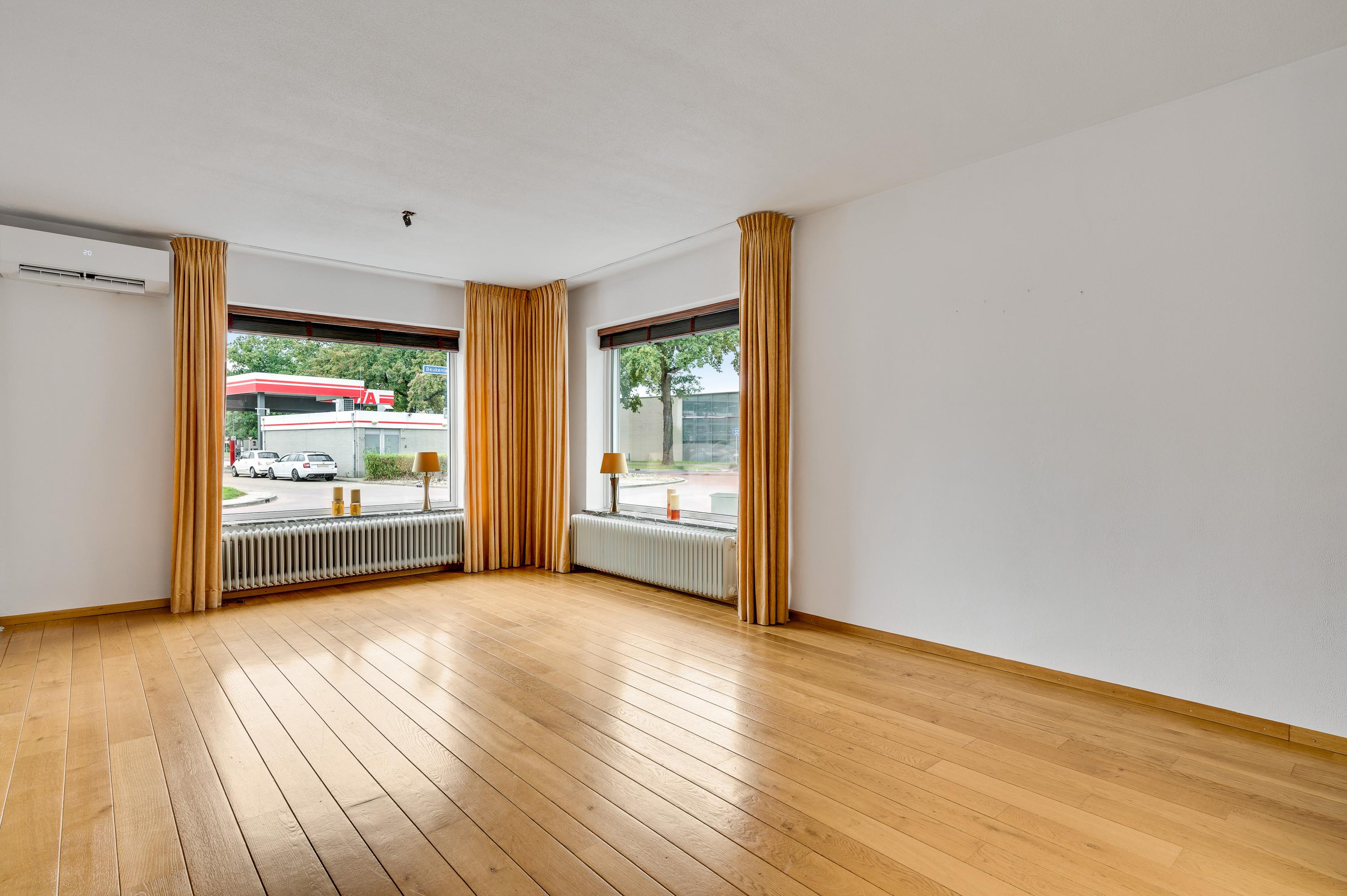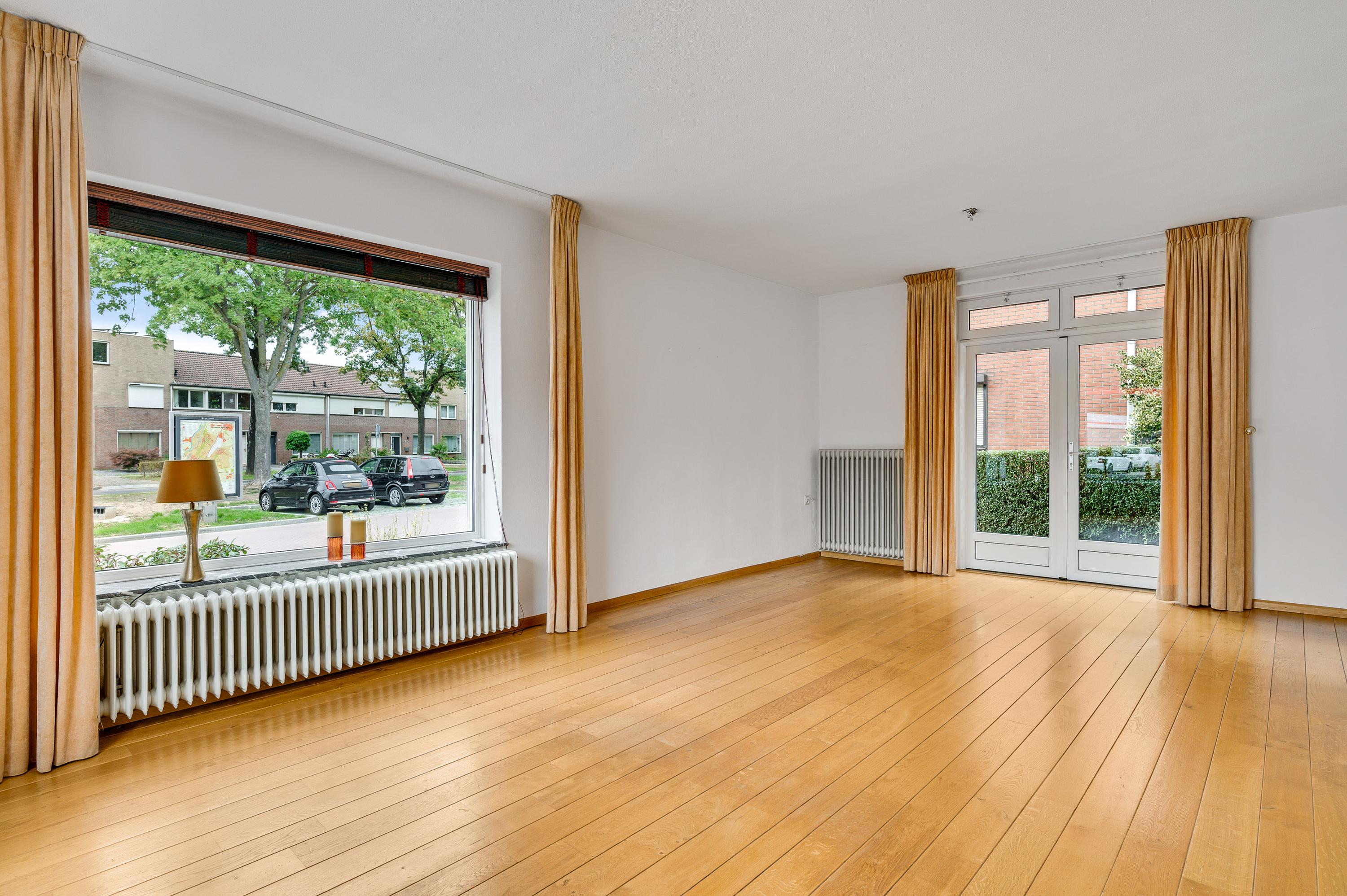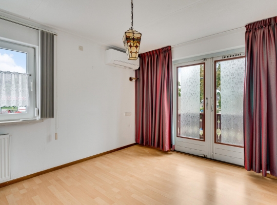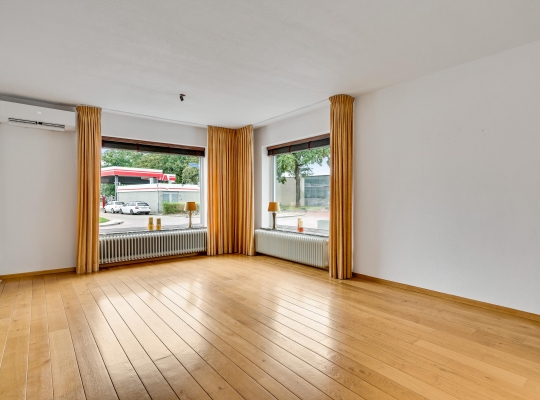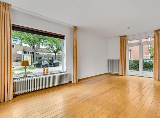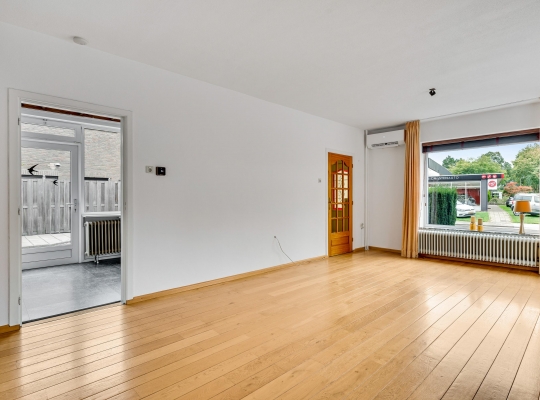 De woonkamer (circa 6,62 x 4,04) met eiken vloer heeft ramen aan twee zijden (zuid en west) en dubbele deuren naar de oprit. Dit is een fijne leefruimte, met leuk en levendig uitzicht naar de Maastrichterlaan. Er is een airco-unit geplaatst, die de ruimte kan koelen en verwarmen.