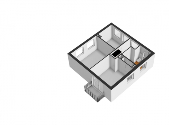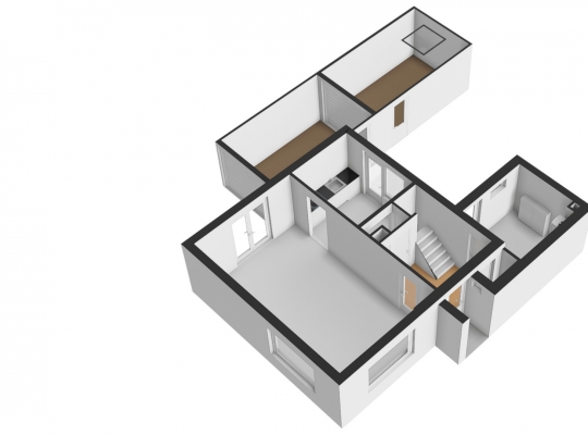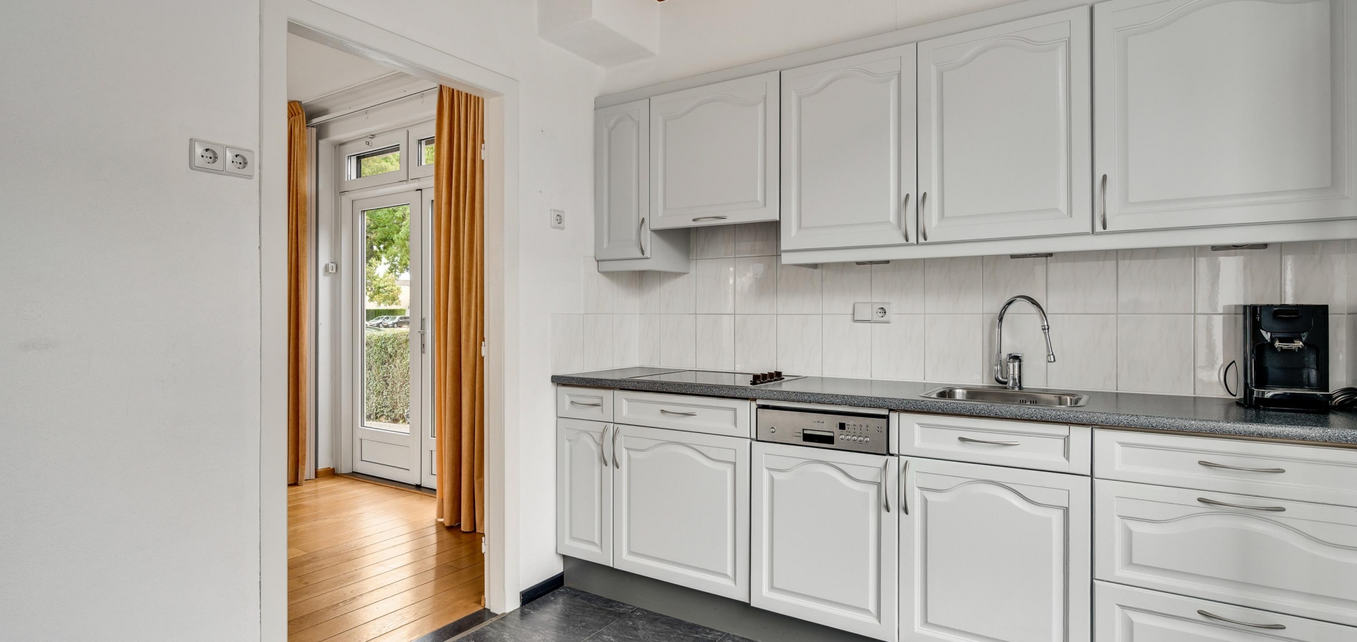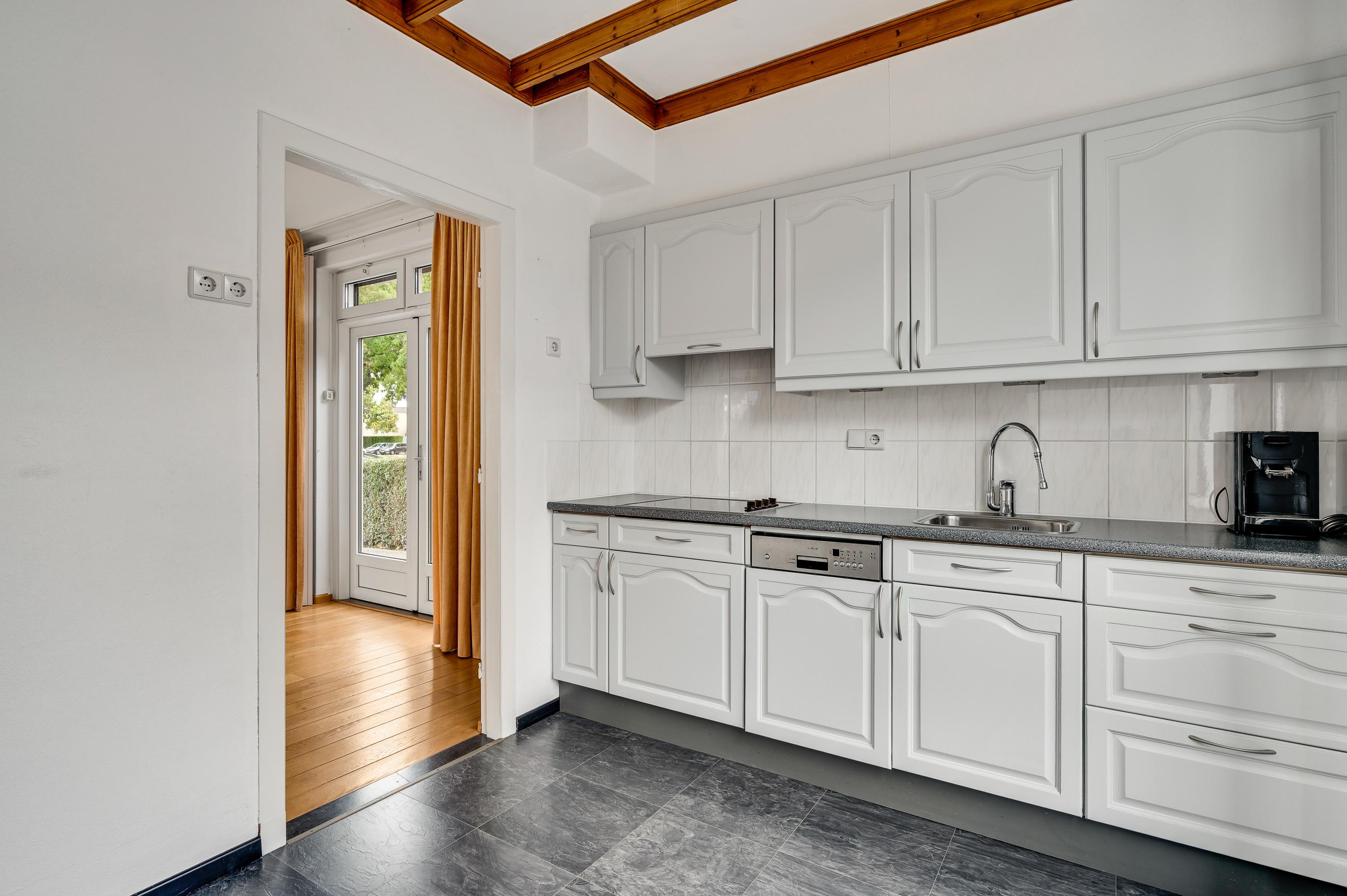 Naast de woonkamer is de keuken (circa 3,12 x 2,66), die toegang tot de achtertuin biedt. Er ligt een donkere pvc-vloer met tegelmotief, die goed past bij de keukenopstelling met een grijs aanrechtblad. De elektrische kookplaat en afzuigkap zijn ingebouwd.