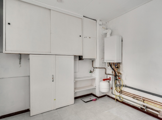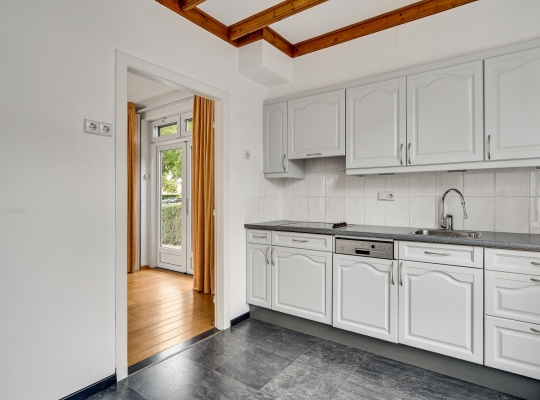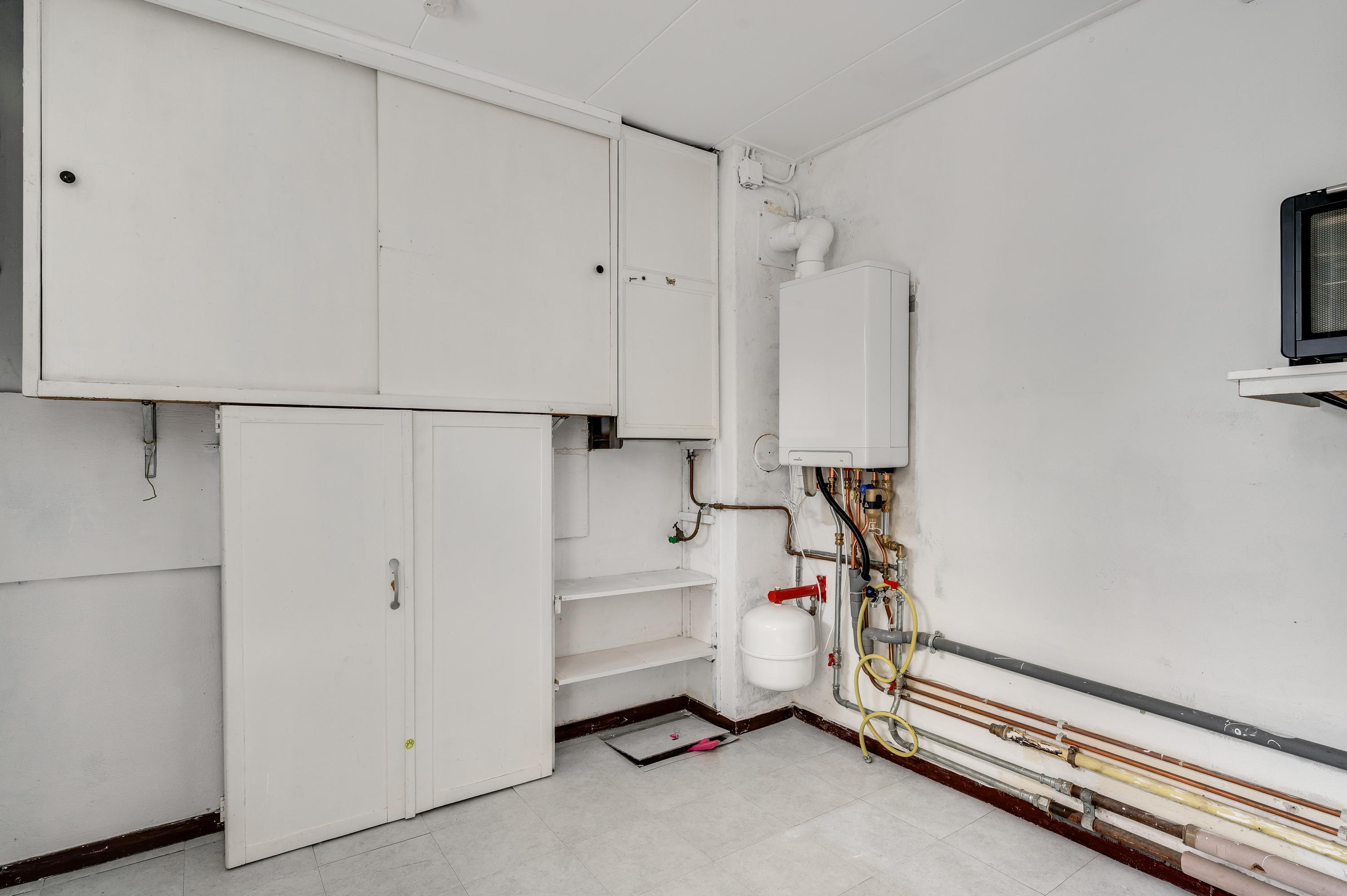 Naast de keuken zijn een provisiekast en een deur naar de bijkeuken. De aanbouw aan de achterzijde biedt ruimte aan de bijkeuken (circa 2,99 x 2,59) met de opstelling van de HR-ketel en meerdere, deels originele kasten.