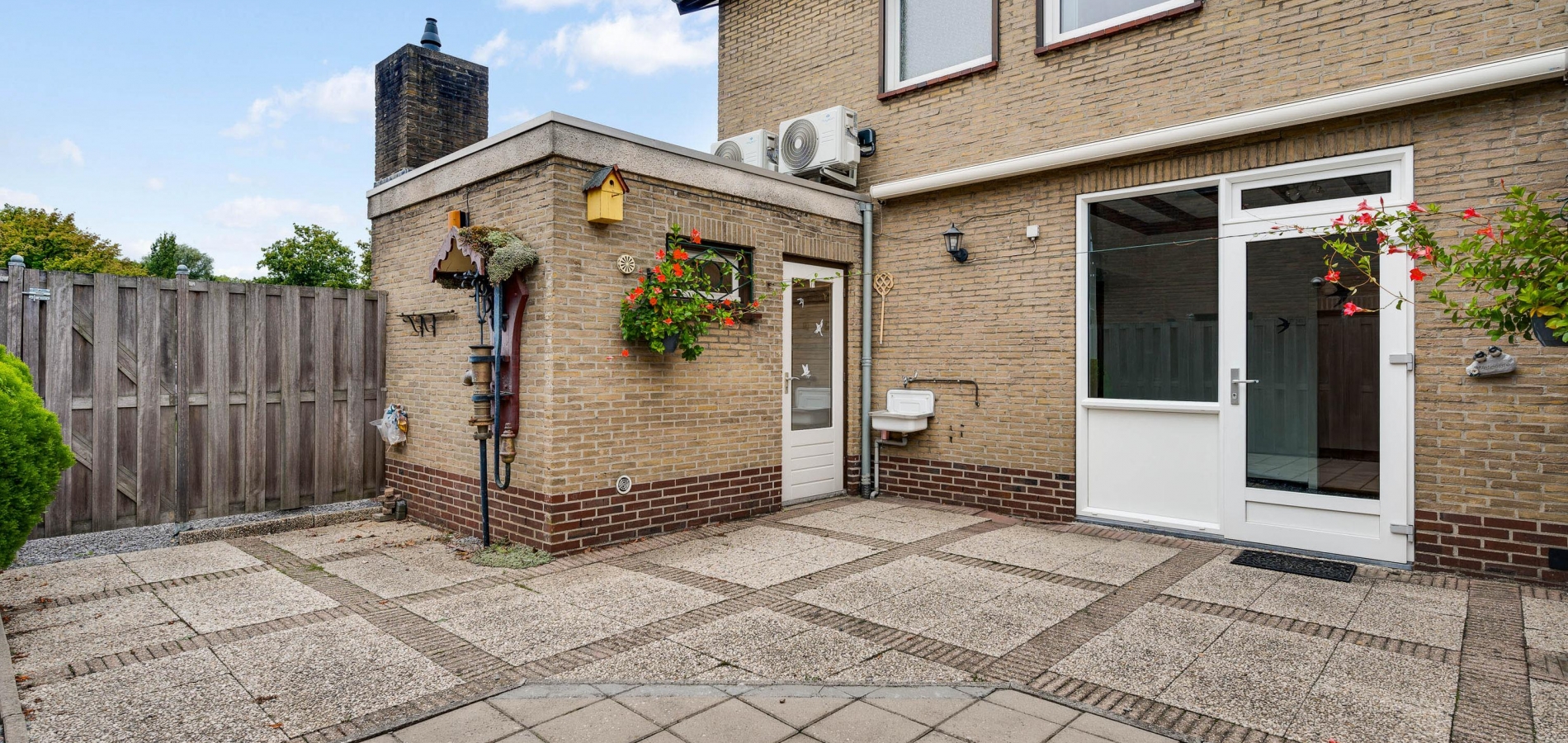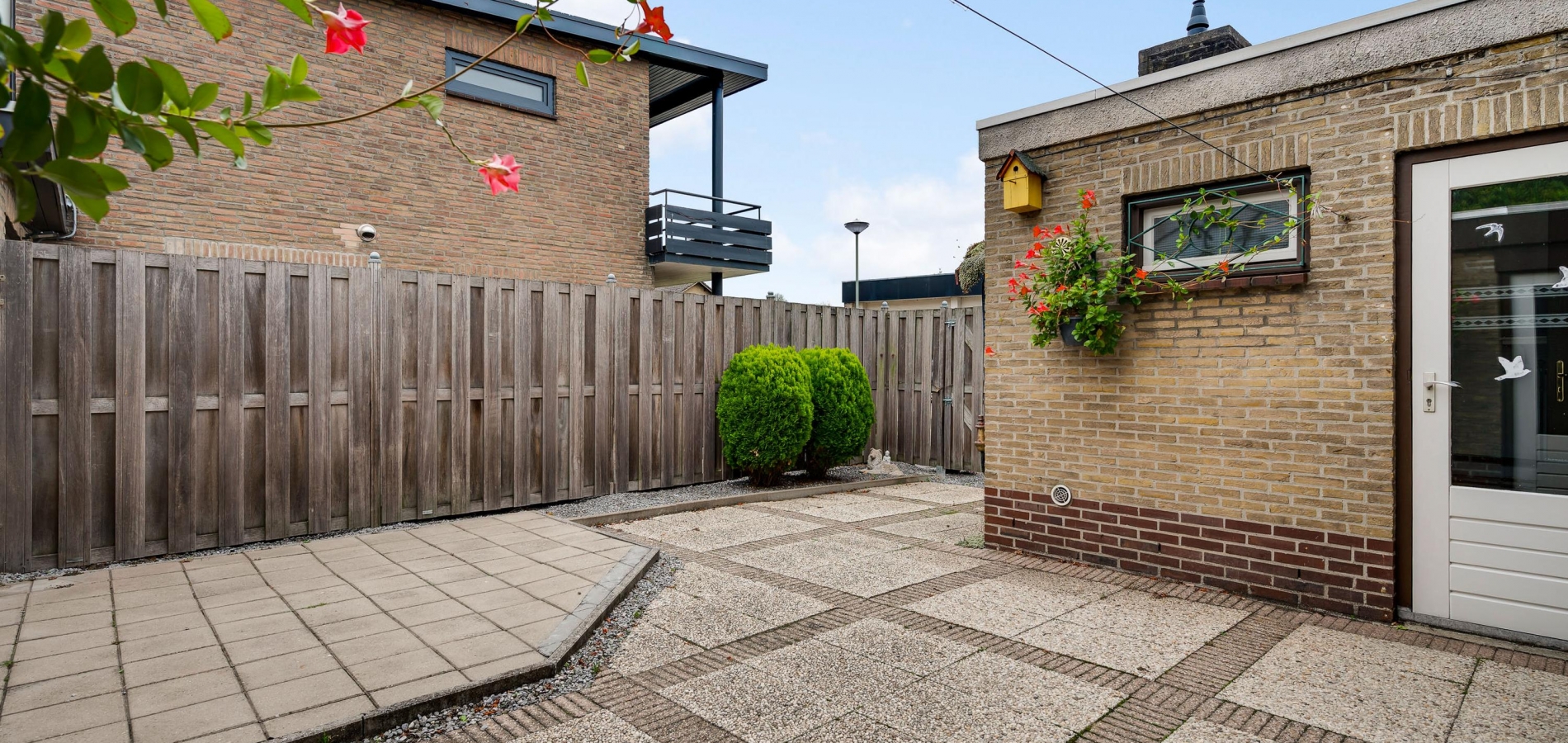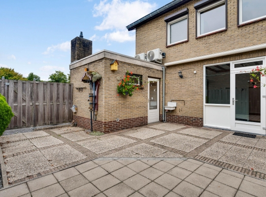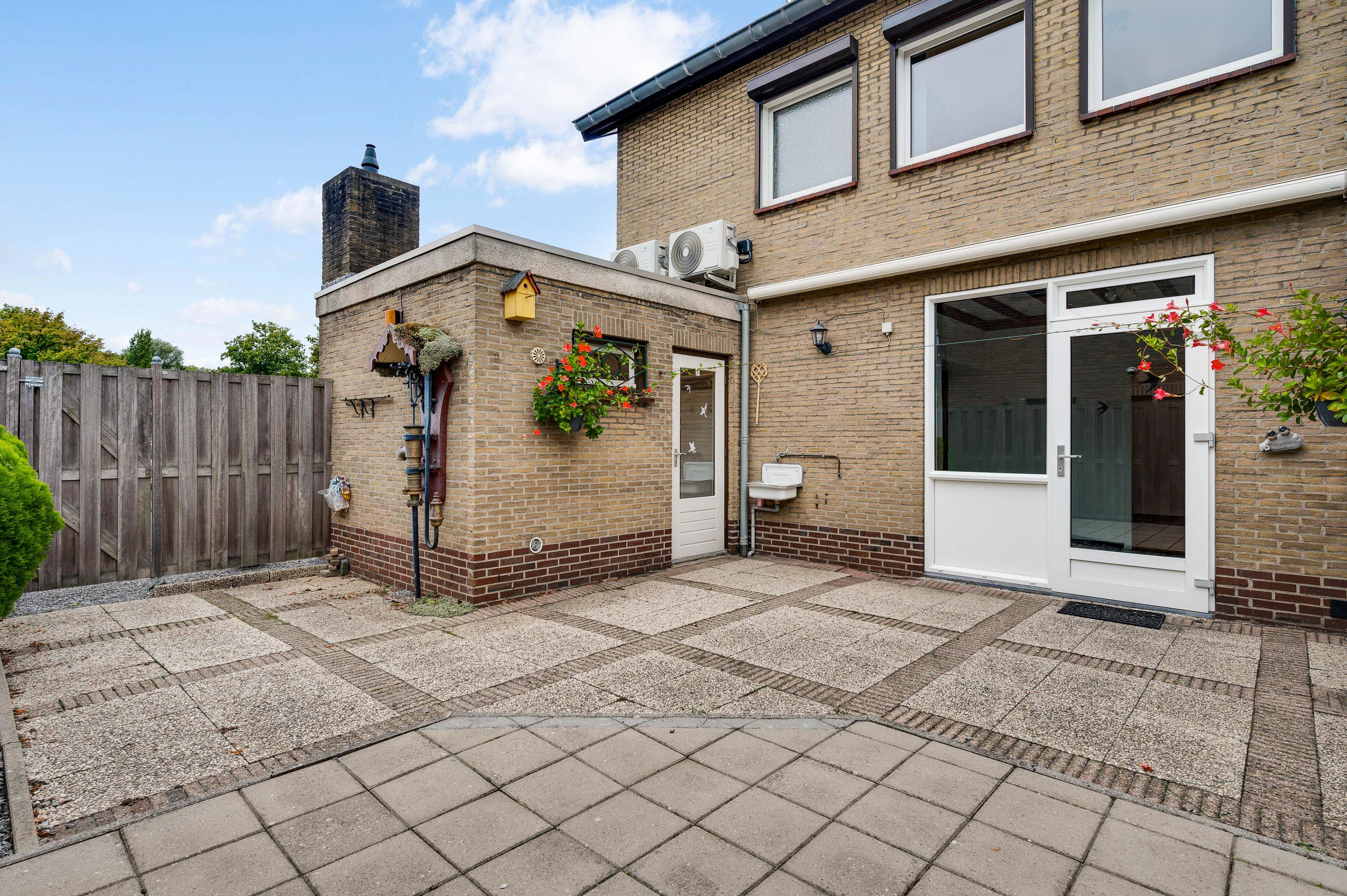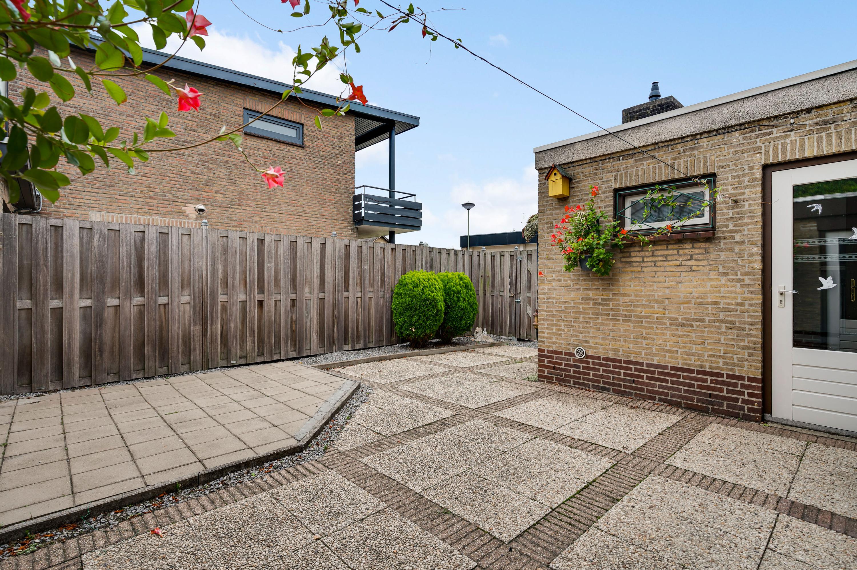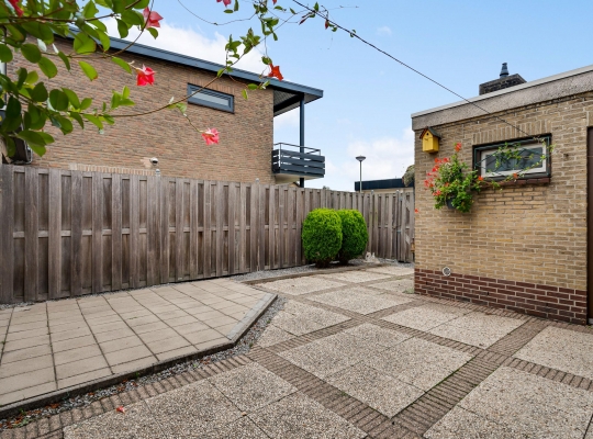 Vanuit de keuken en bijkeuken is de onderhoudsvriendelijke achtertuin op het oosten te bereiken, met houten schuttingen als erfafscheiding en een eigen achterom. Ook de zijtuin, op het zonnige zuiden, en de voortuin op het westen vergen weinig onderhoud. Aan de noordkant is de oprit, waar twee auto’s kunnen staan.