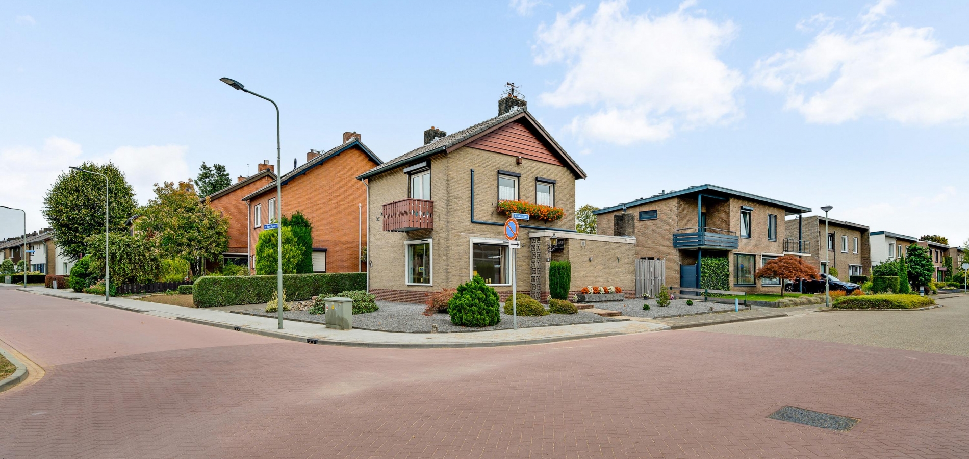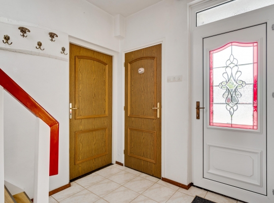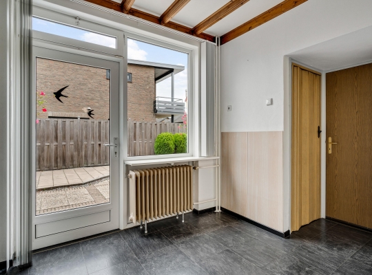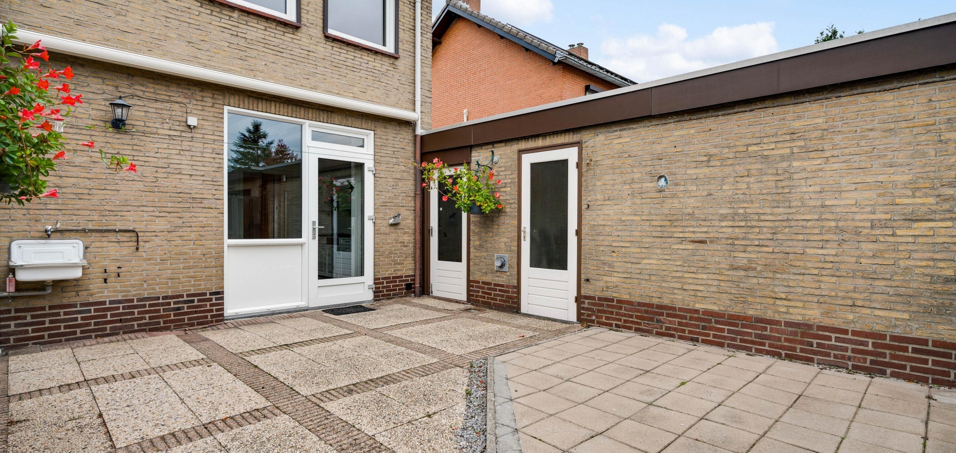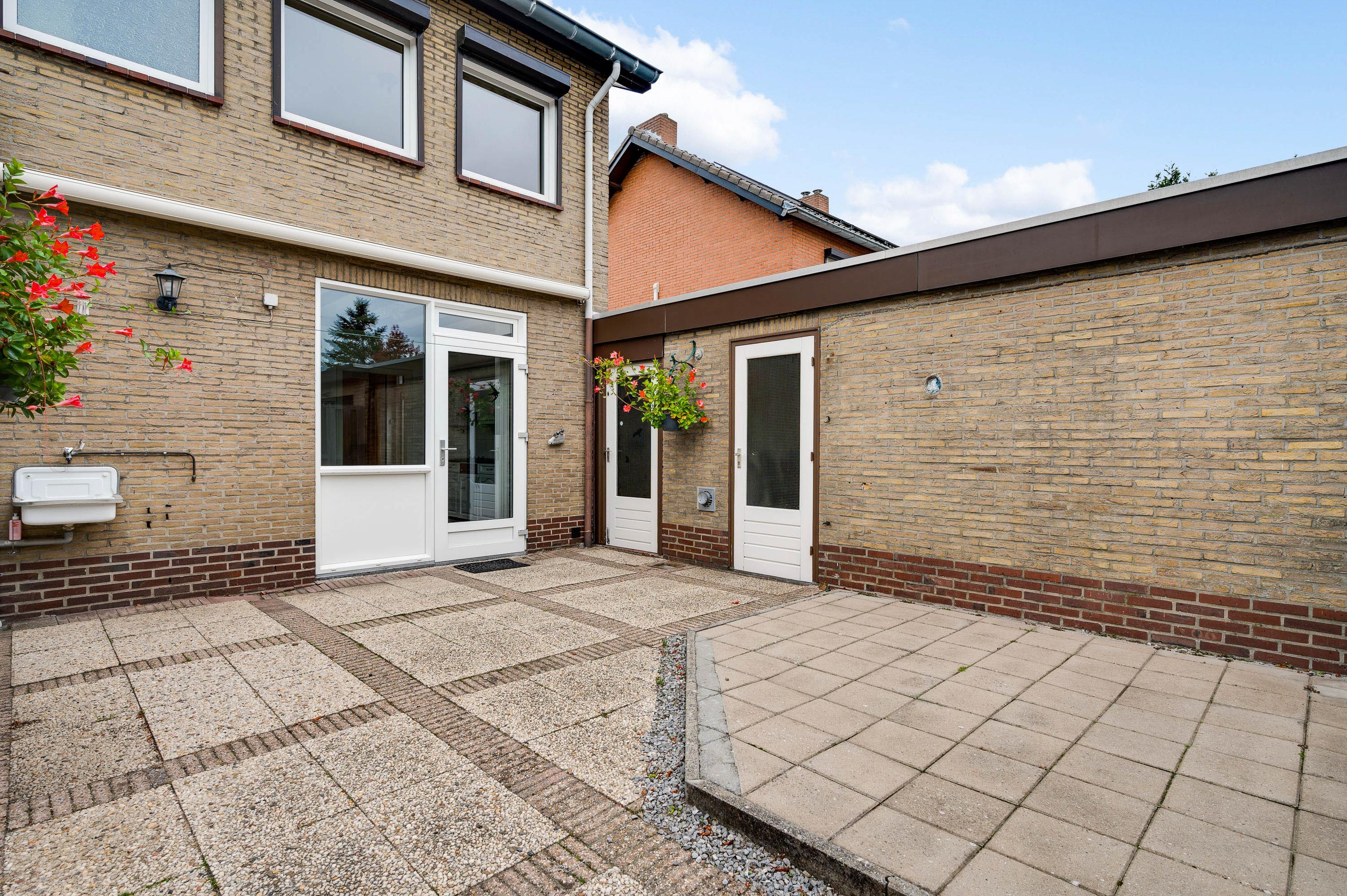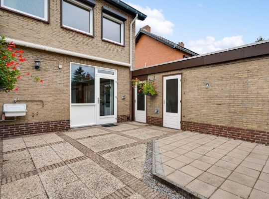 Vanuit de keuken en bijkeuken is de onderhoudsvriendelijke achtertuin op het oosten te bereiken, met houten schuttingen als erfafscheiding en een eigen achterom. Ook de zijtuin, op het zonnige zuiden, en de voortuin op het westen vergen weinig onderhoud. Aan de noordkant is de oprit, waar twee auto’s kunnen staan.