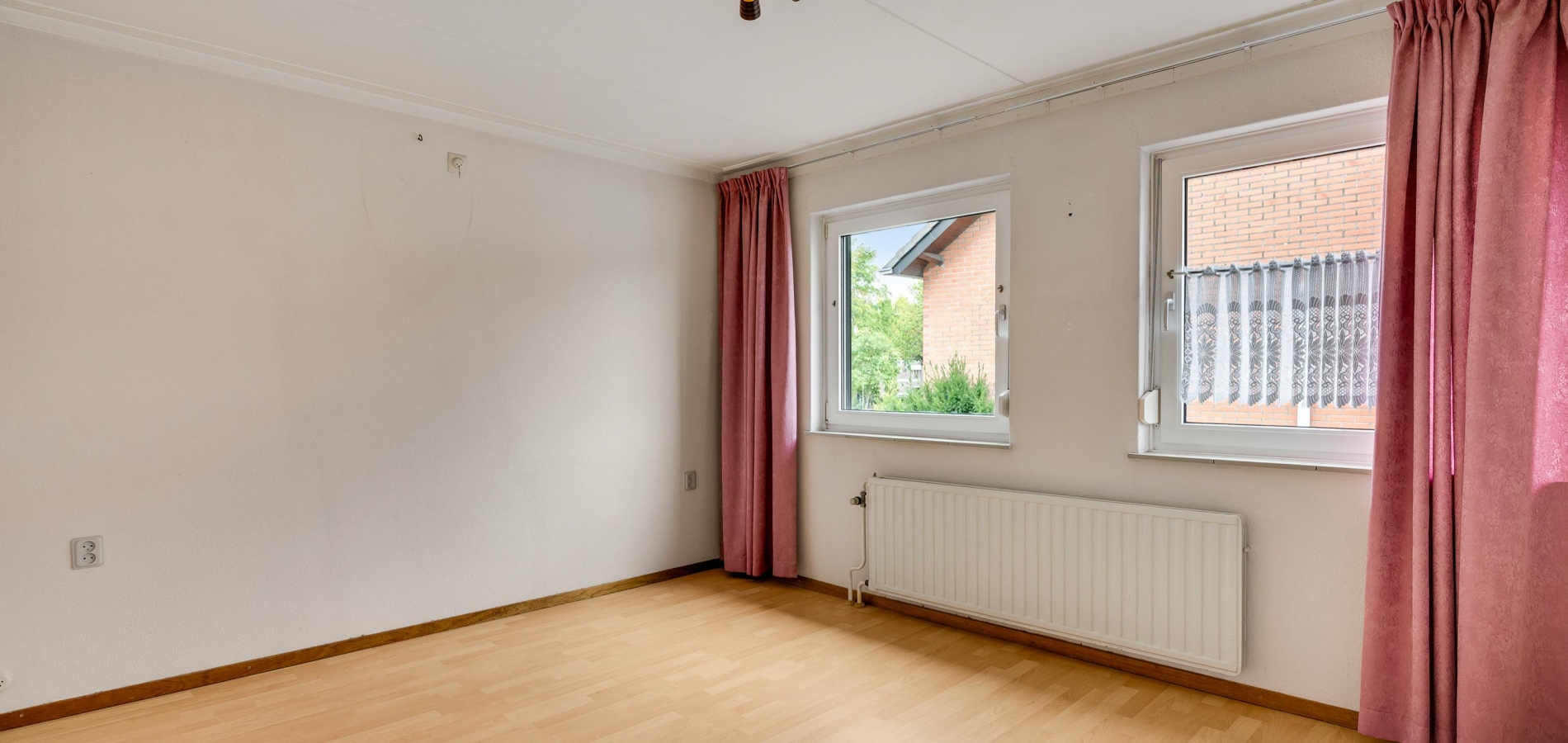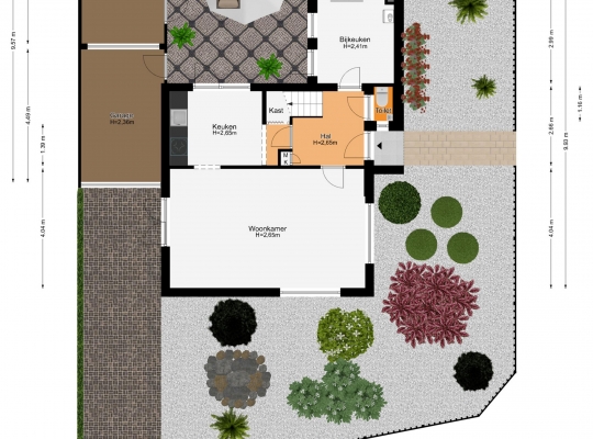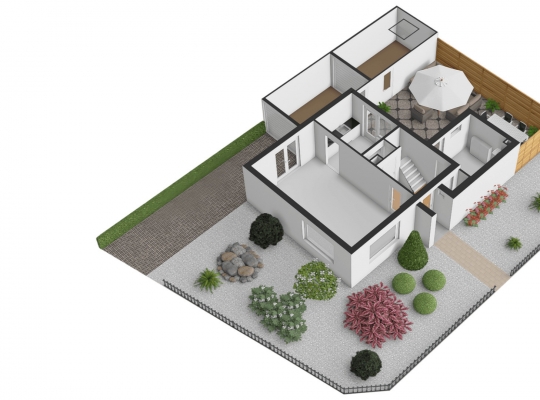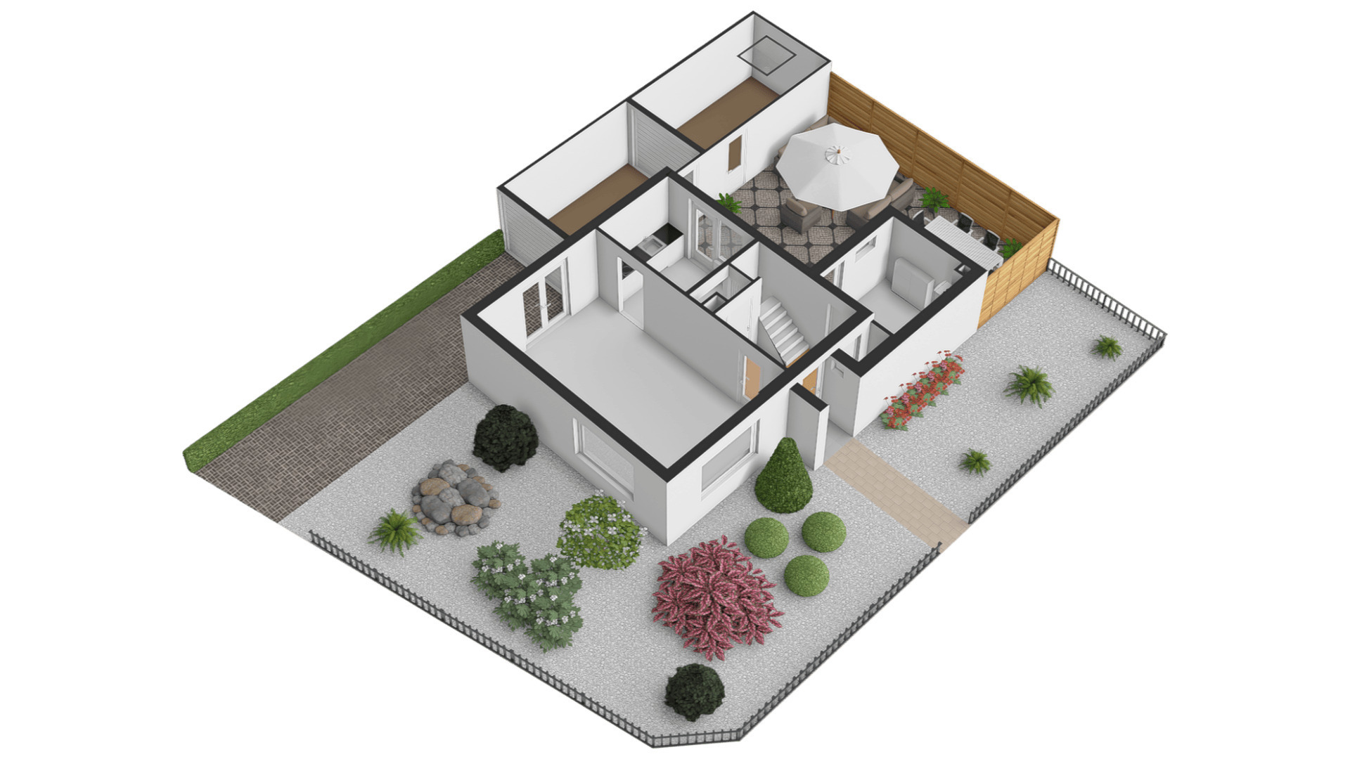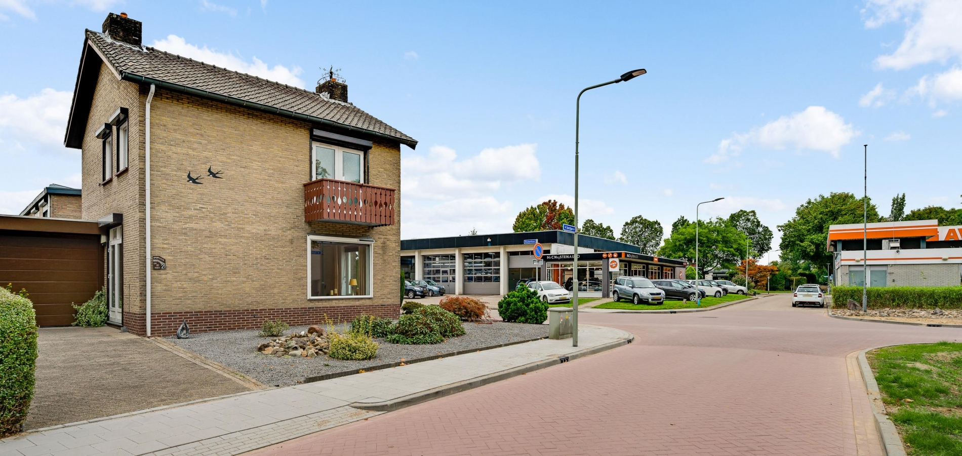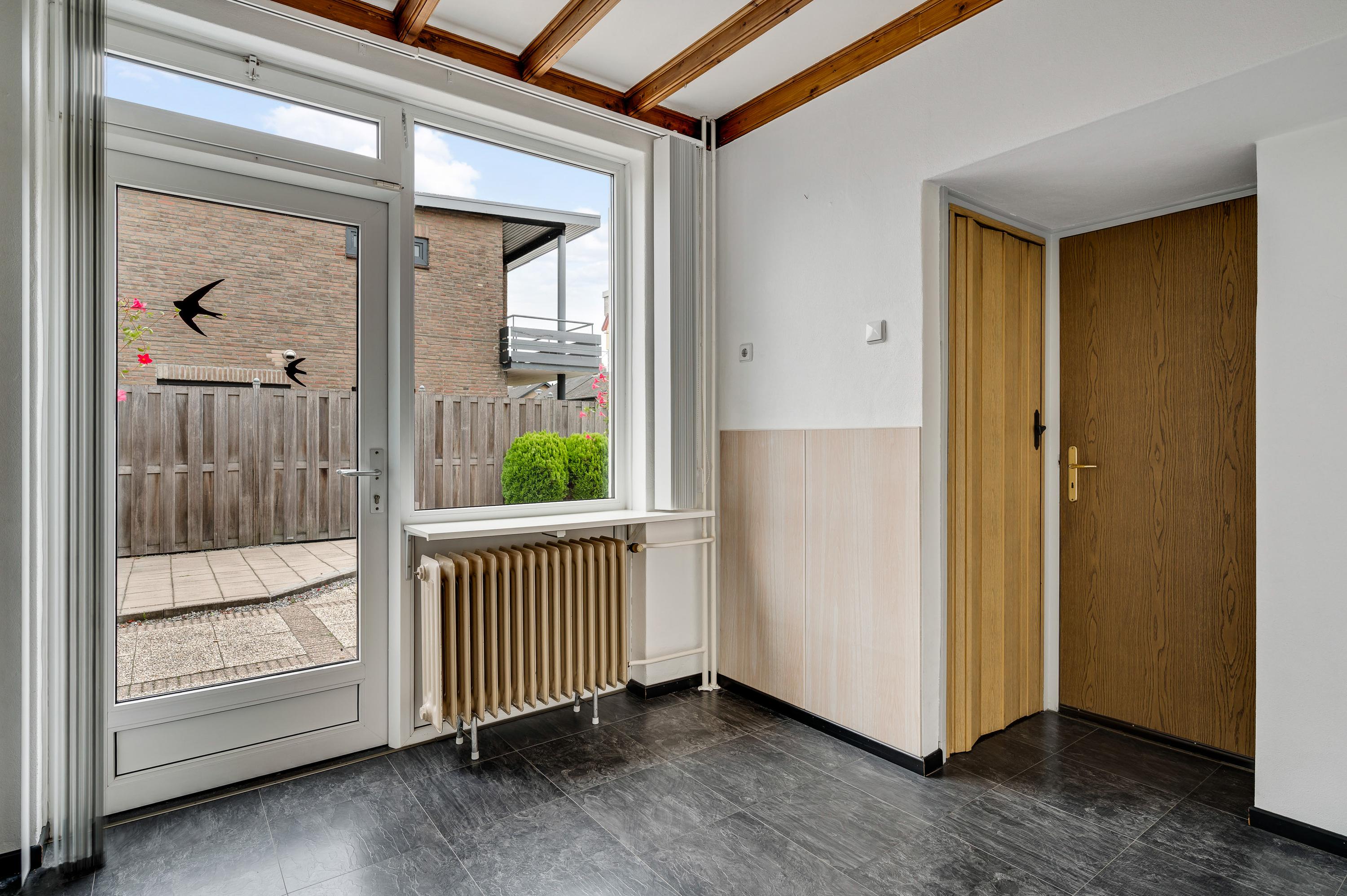 Vanuit de keuken en bijkeuken is de onderhoudsvriendelijke achtertuin op het oosten te bereiken, met houten schuttingen als erfafscheiding en een eigen achterom. Ook de zijtuin, op het zonnige zuiden, en de voortuin op het westen vergen weinig onderhoud. Aan de noordkant is de oprit, waar twee auto’s kunnen staan.