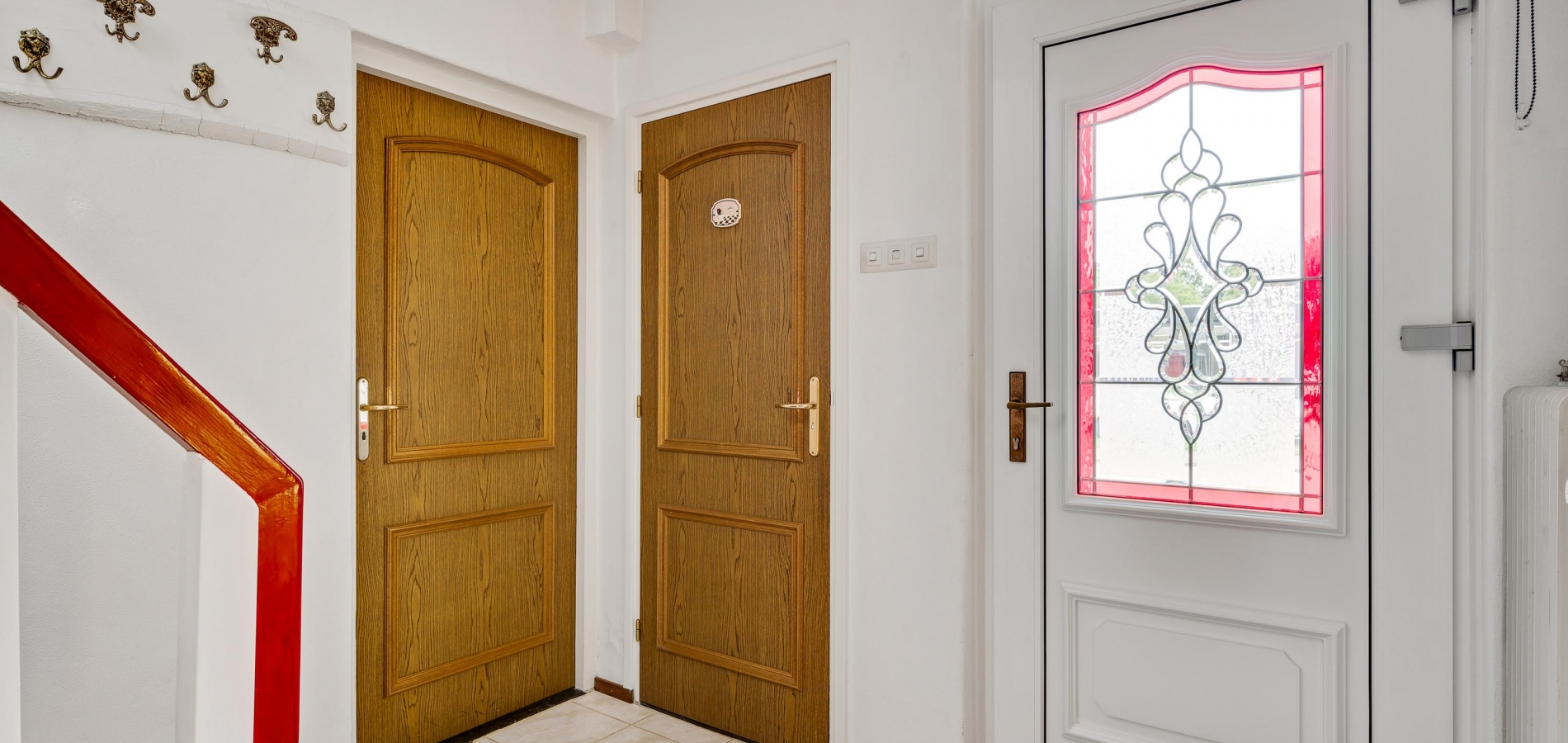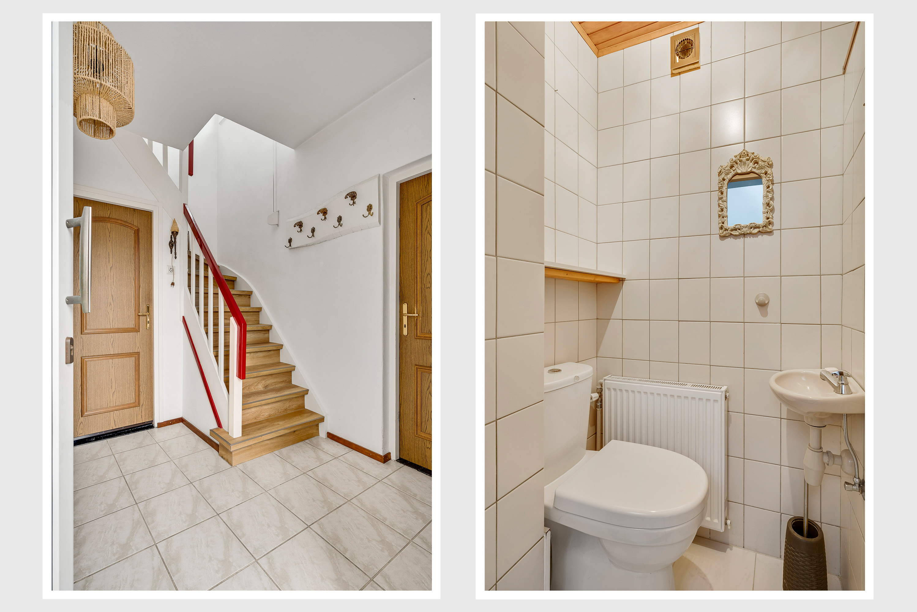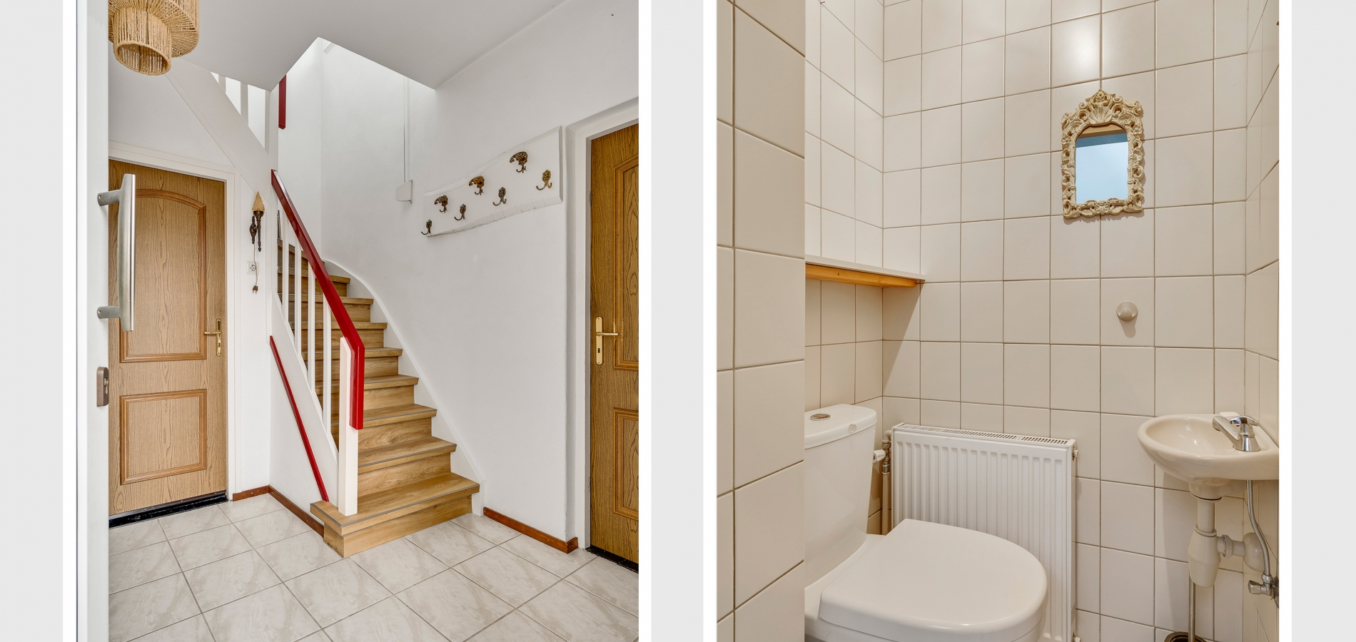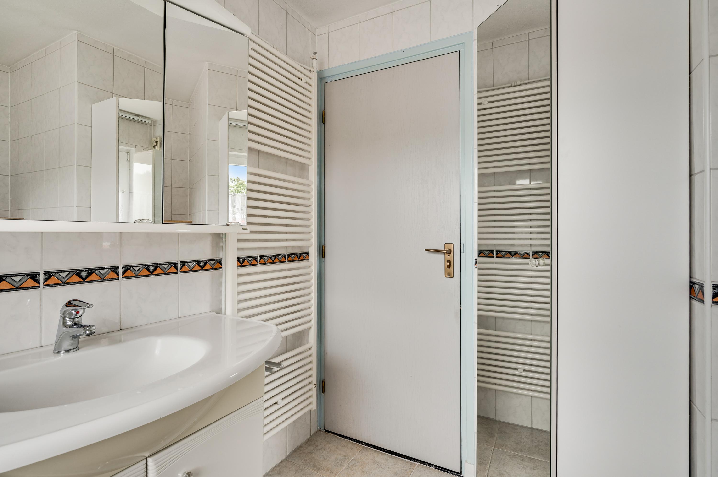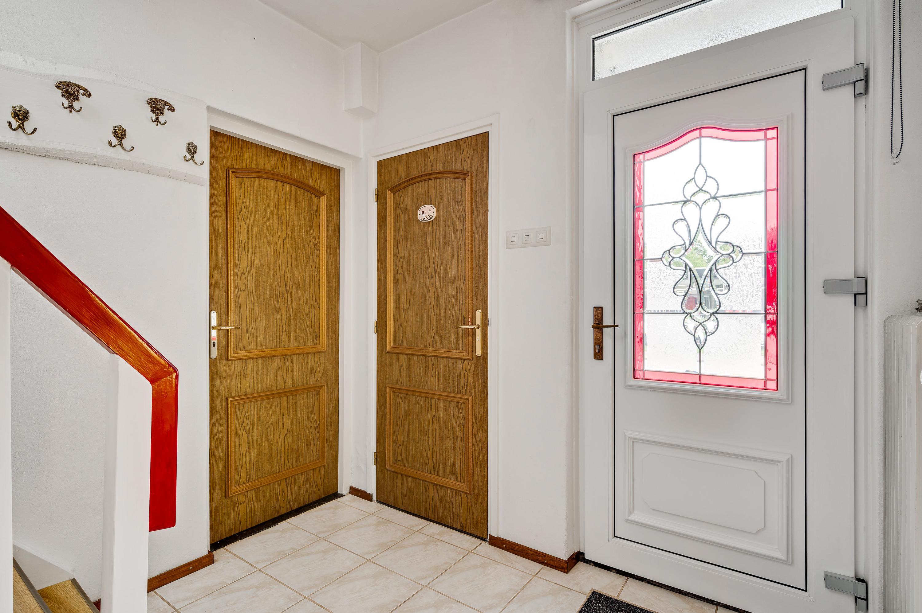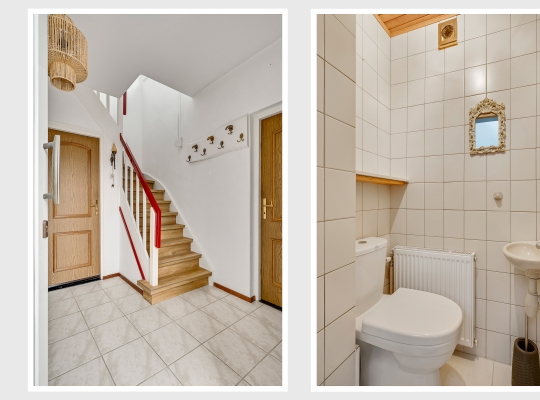 Aan de kant van de Beukenlaan is de overdekte entree van deze lichte, vrijstaande woning. In de hal (circa 3,31 x 2,66) zijn de meterkast en de trap naar de eerste verdieping. Vlak naast de voordeur is de toiletruimte met fonteintje, uitgevoerd in lichte kleuren.