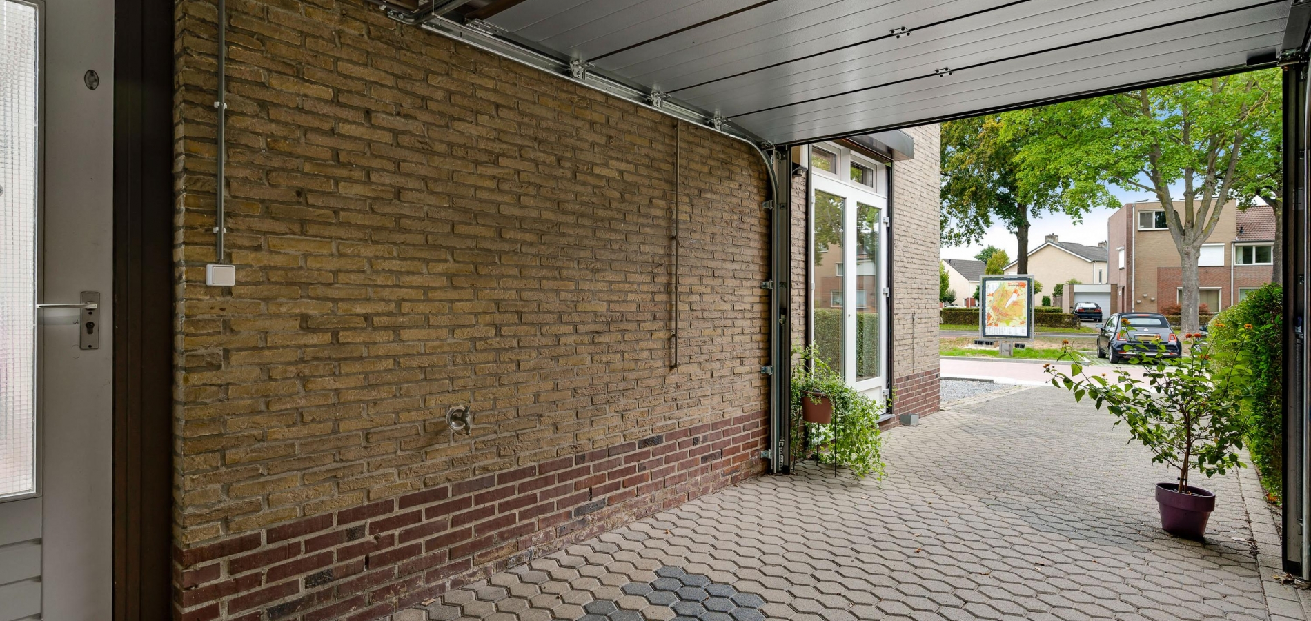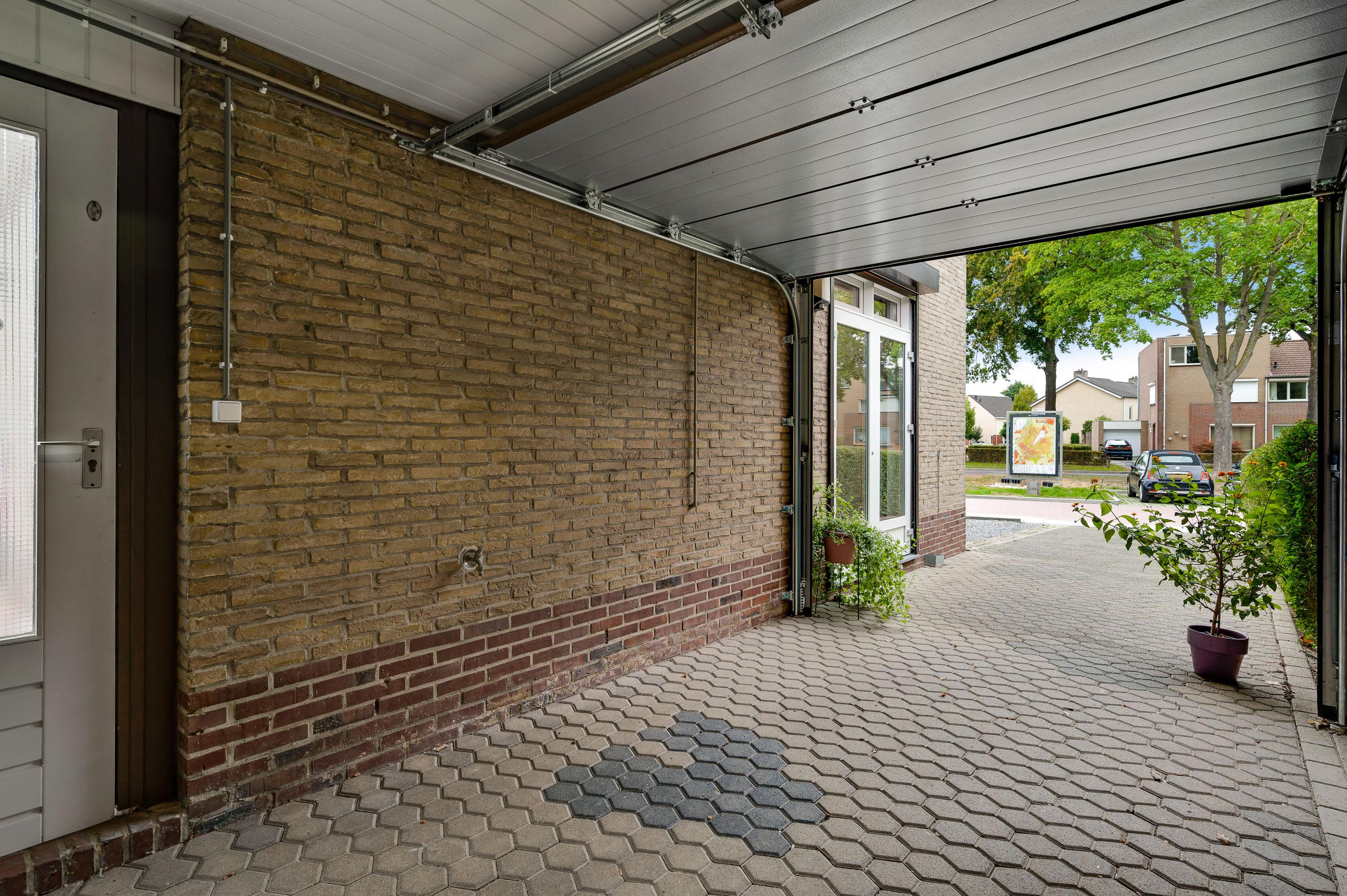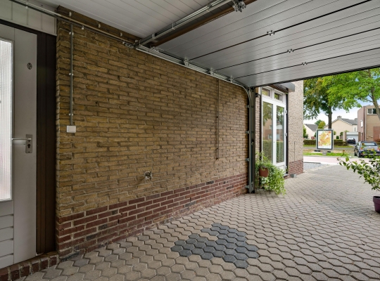 De oprit geeft toegang tot een carport (circa 4,49 x 2,71) met een sectionaalpoort naar de oprit. De carport geeft verder toegang tot de tuin en de garage/hobbyruimte (circa 4,88 x 2,80).