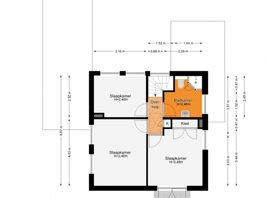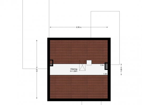 Vanaf de overloop is de zolder van circa 6,58 x 6,67 meter (vloeroppervlakte) te bereiken. Vanaf 1,50 meter hoogte is de oppervlakte circa 8,5 m2, met de mogelijkheid om na plaatsing van een dakkapel extra ruimte te creëren.