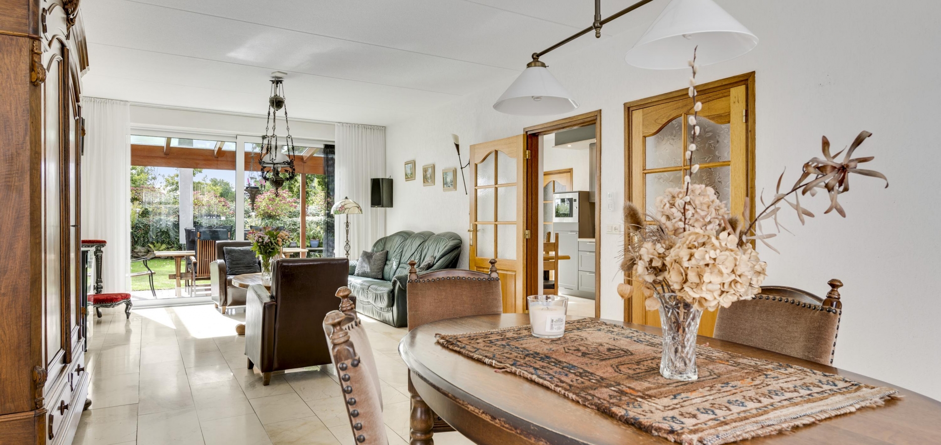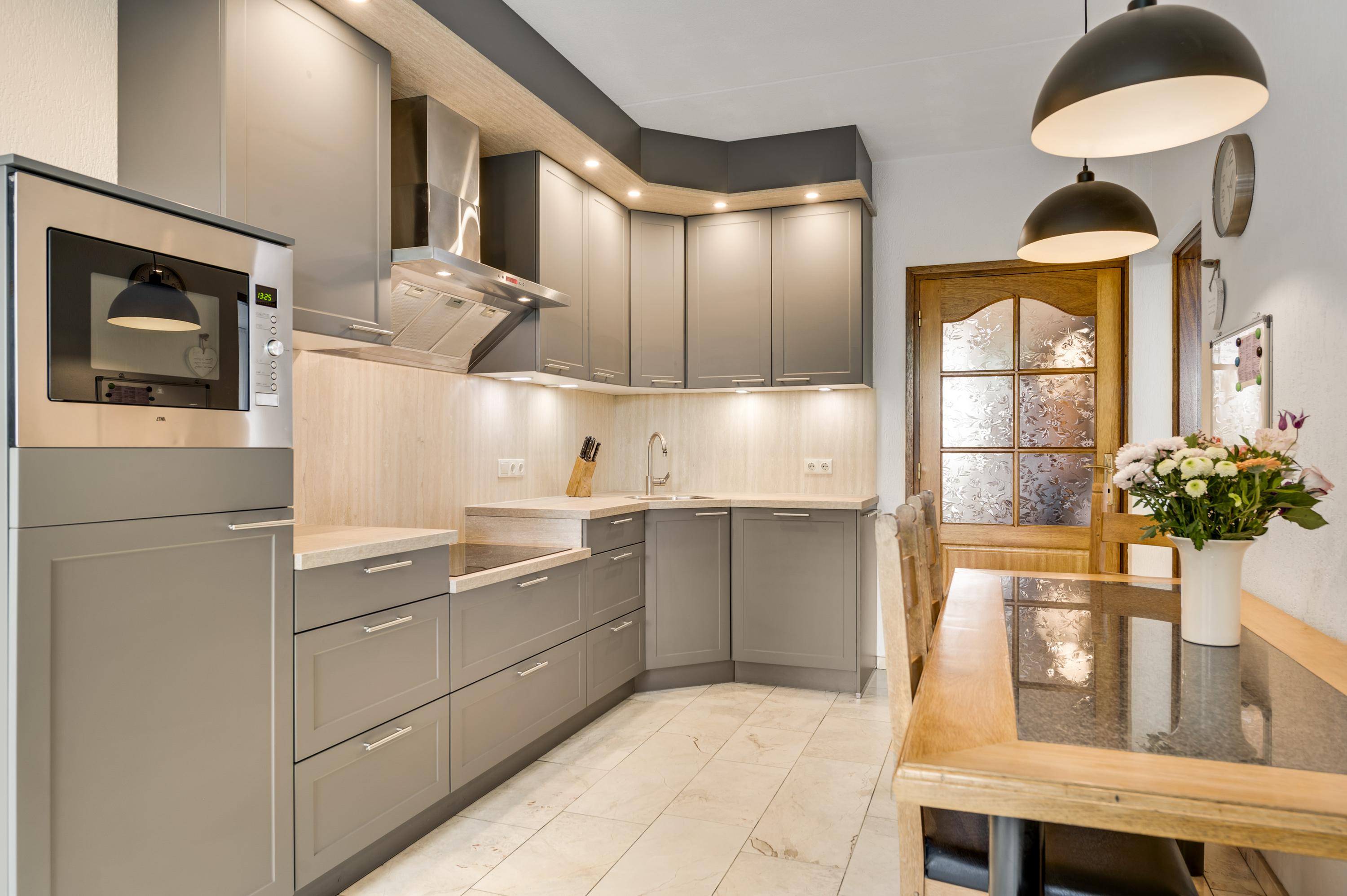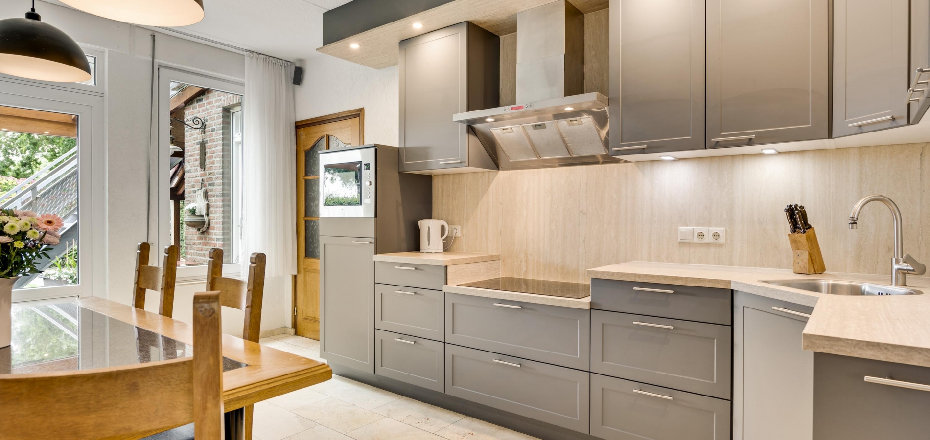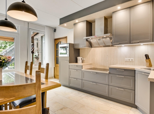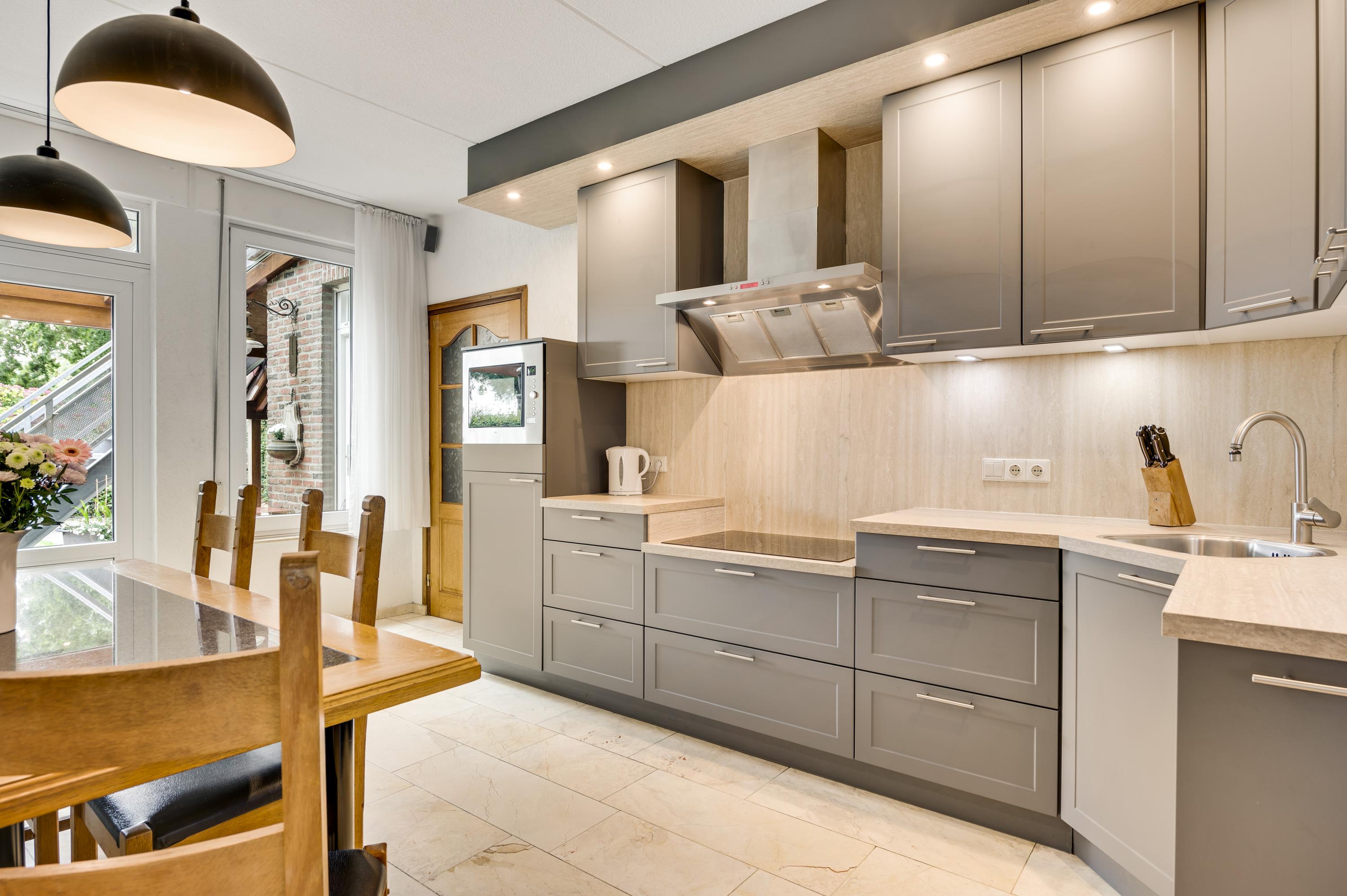 In het linkerdeel van het woonhuis is de woon-/eetkamer (circa 8,86 x 4,18), met een airco-unit en een schuifpui naar het overdekte terras. Nu is het eetgedeelte aan de voorzijde en het zitgedeelte aan de achterzijde, met prachtig uitzicht naar de tuin. Naast de woonkamer is de eetkeuken (circa 4,99 x 2,78), met toegang tot het overdekte terras en de garage. De hoogwaardige, grijze hoekopstelling heeft een ingebouwde inductie kookplaat, afzuigkap, combimagnetron, vaatwasser, close-in boiler en een koelkast.