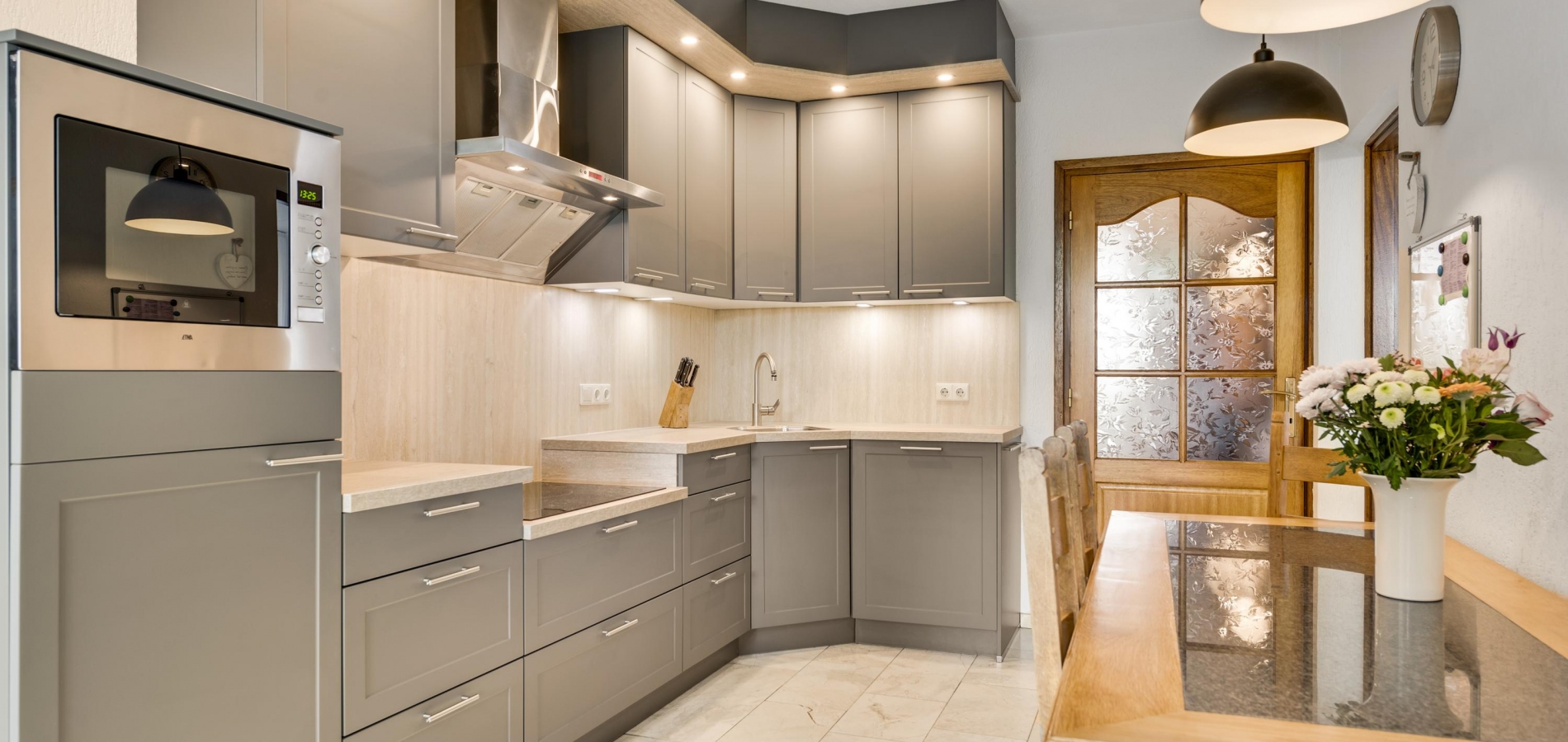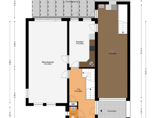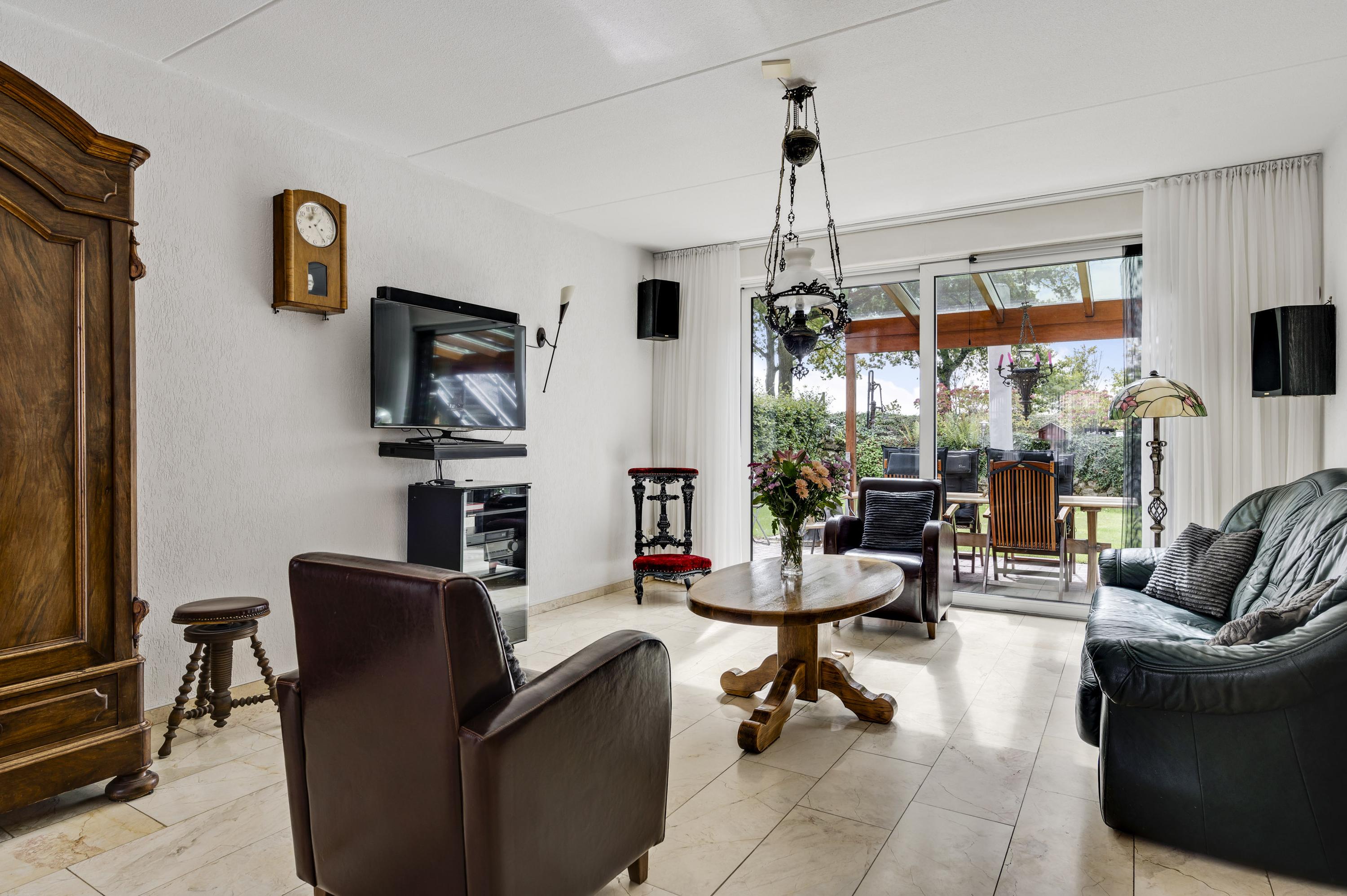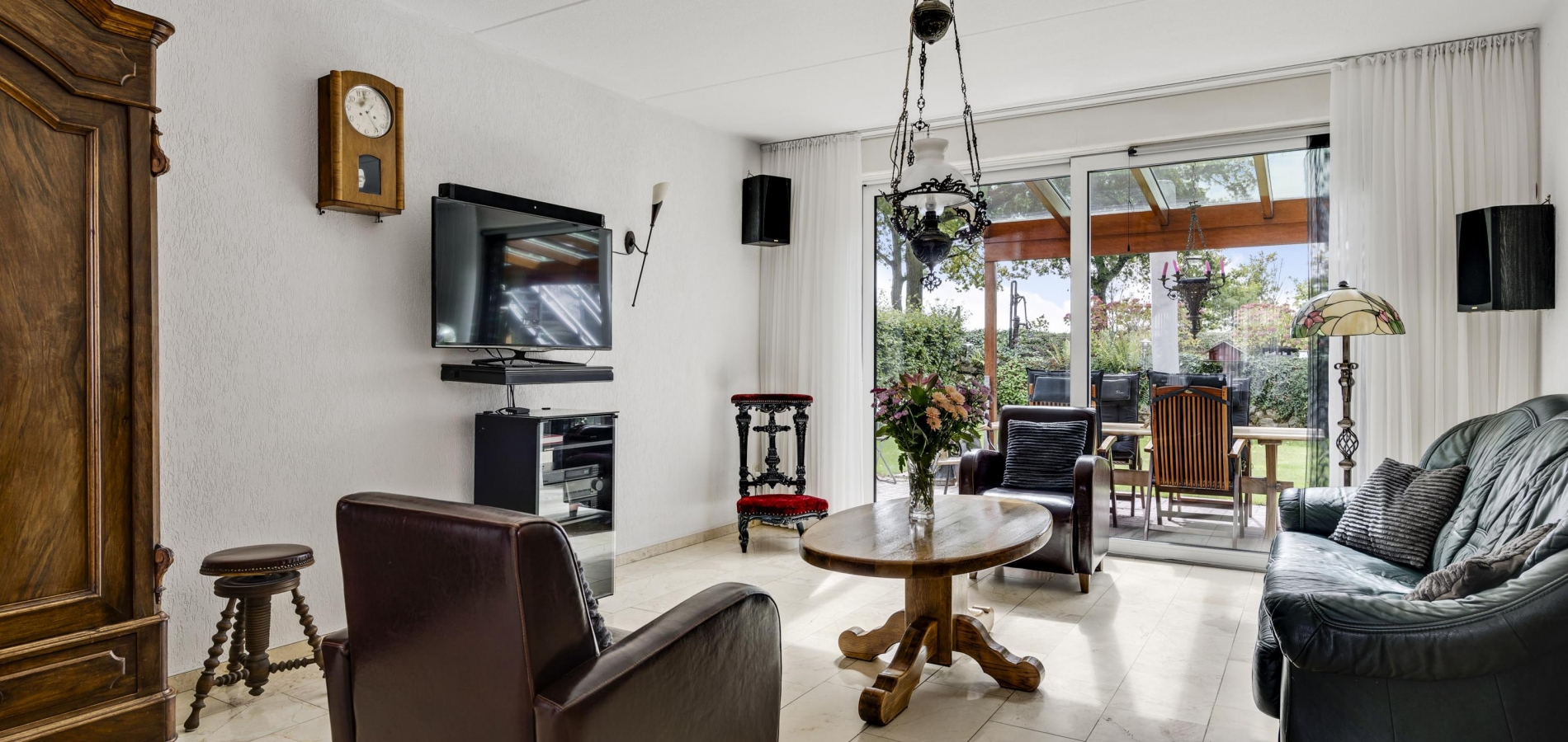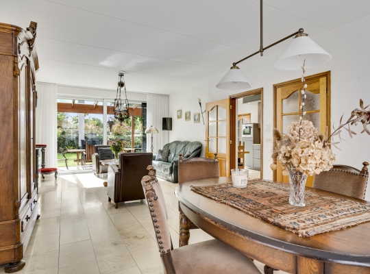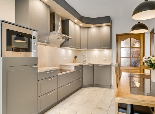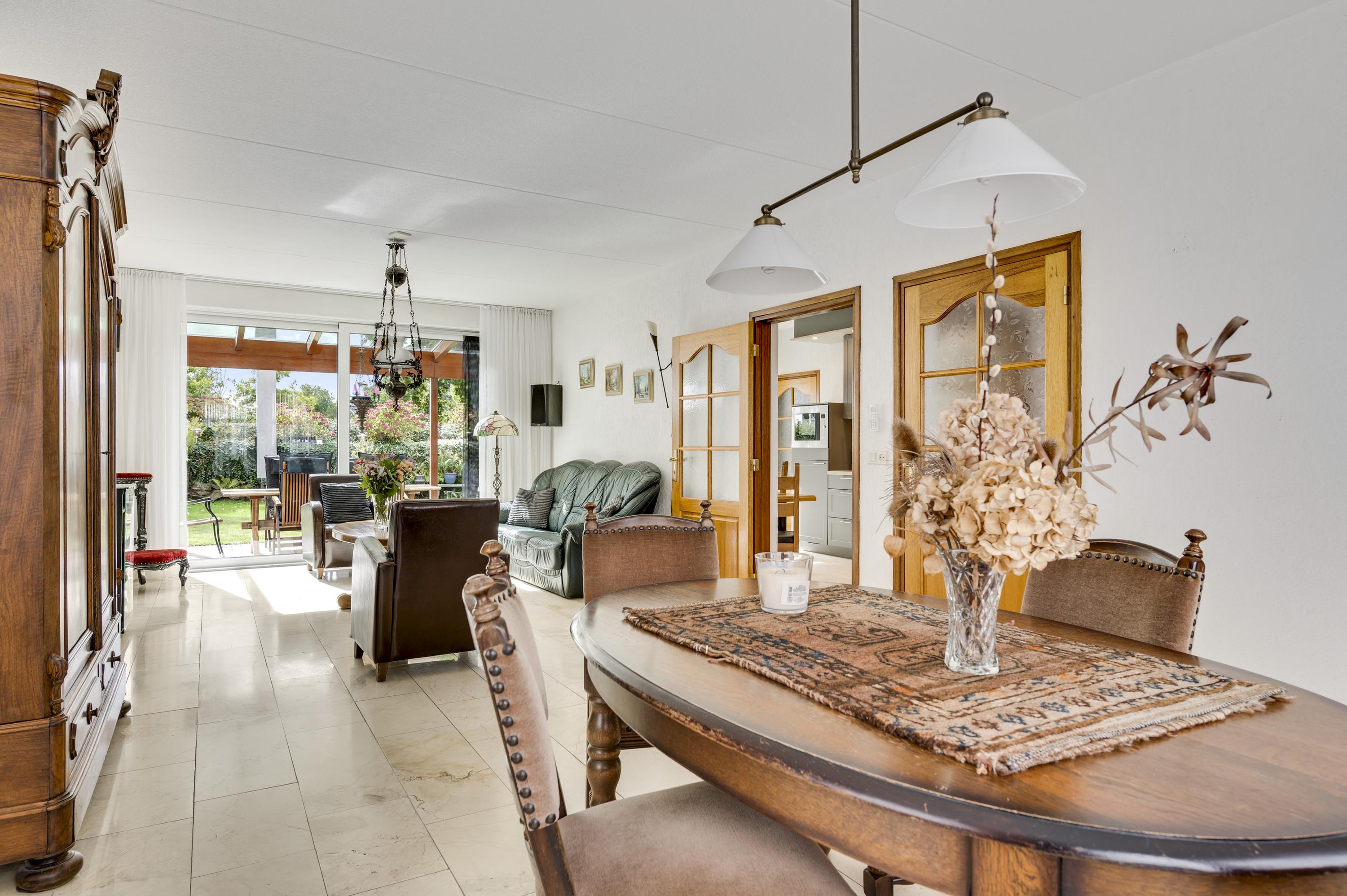 In het linkerdeel van het woonhuis is de woon-/eetkamer (circa 8,86 x 4,18), met een airco-unit en een schuifpui naar het overdekte terras. Nu is het eetgedeelte aan de voorzijde en het zitgedeelte aan de achterzijde, met prachtig uitzicht naar de tuin. Naast de woonkamer is de eetkeuken (circa 4,99 x 2,78), met toegang tot het overdekte terras en de garage. De hoogwaardige, grijze hoekopstelling heeft een ingebouwde inductie kookplaat, afzuigkap, combimagnetron, vaatwasser, close-in boiler en een koelkast.