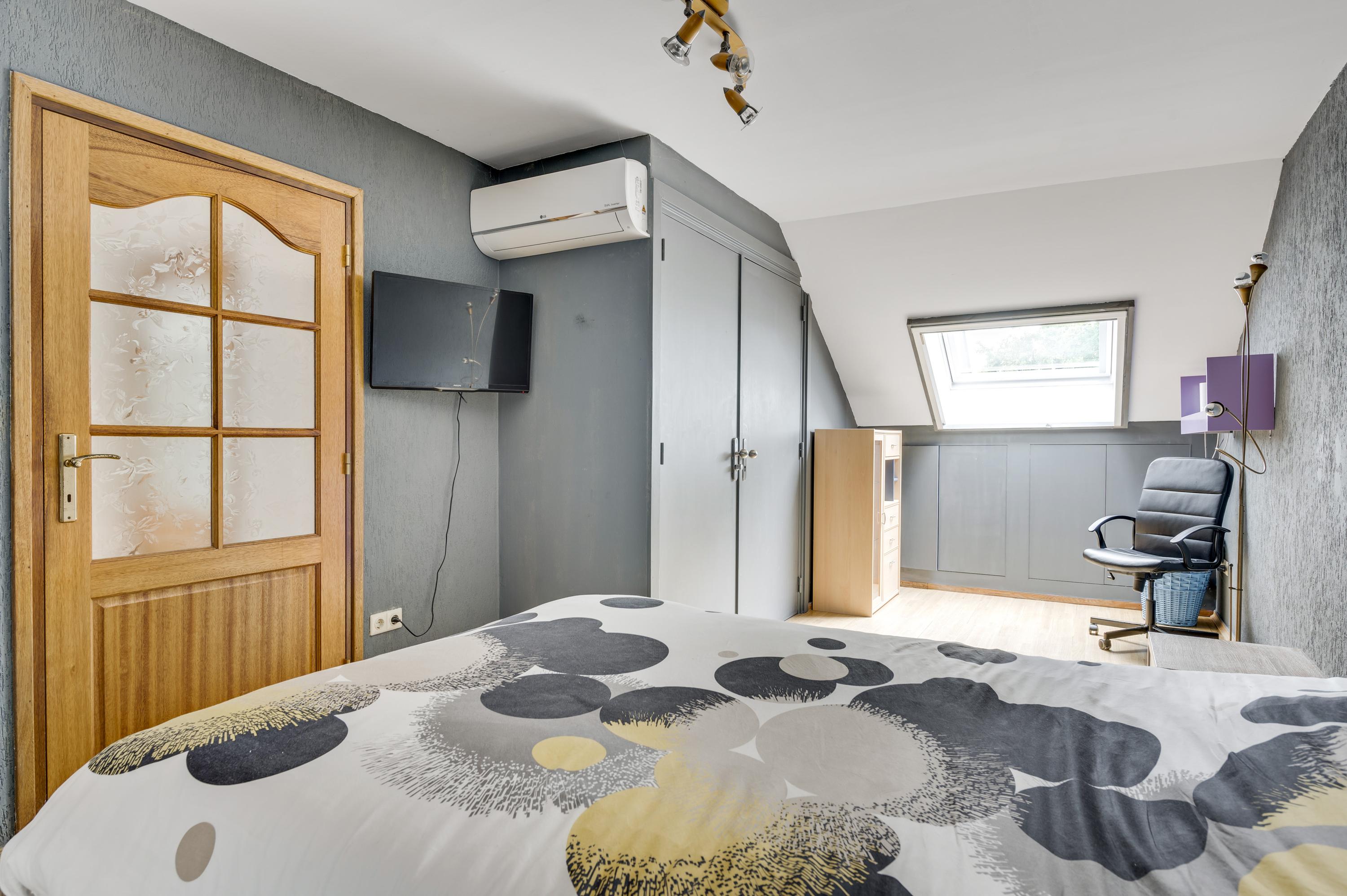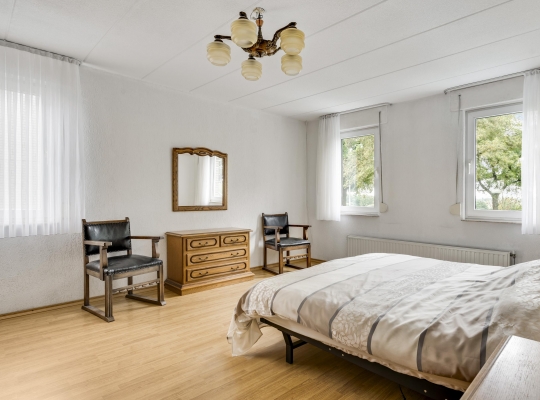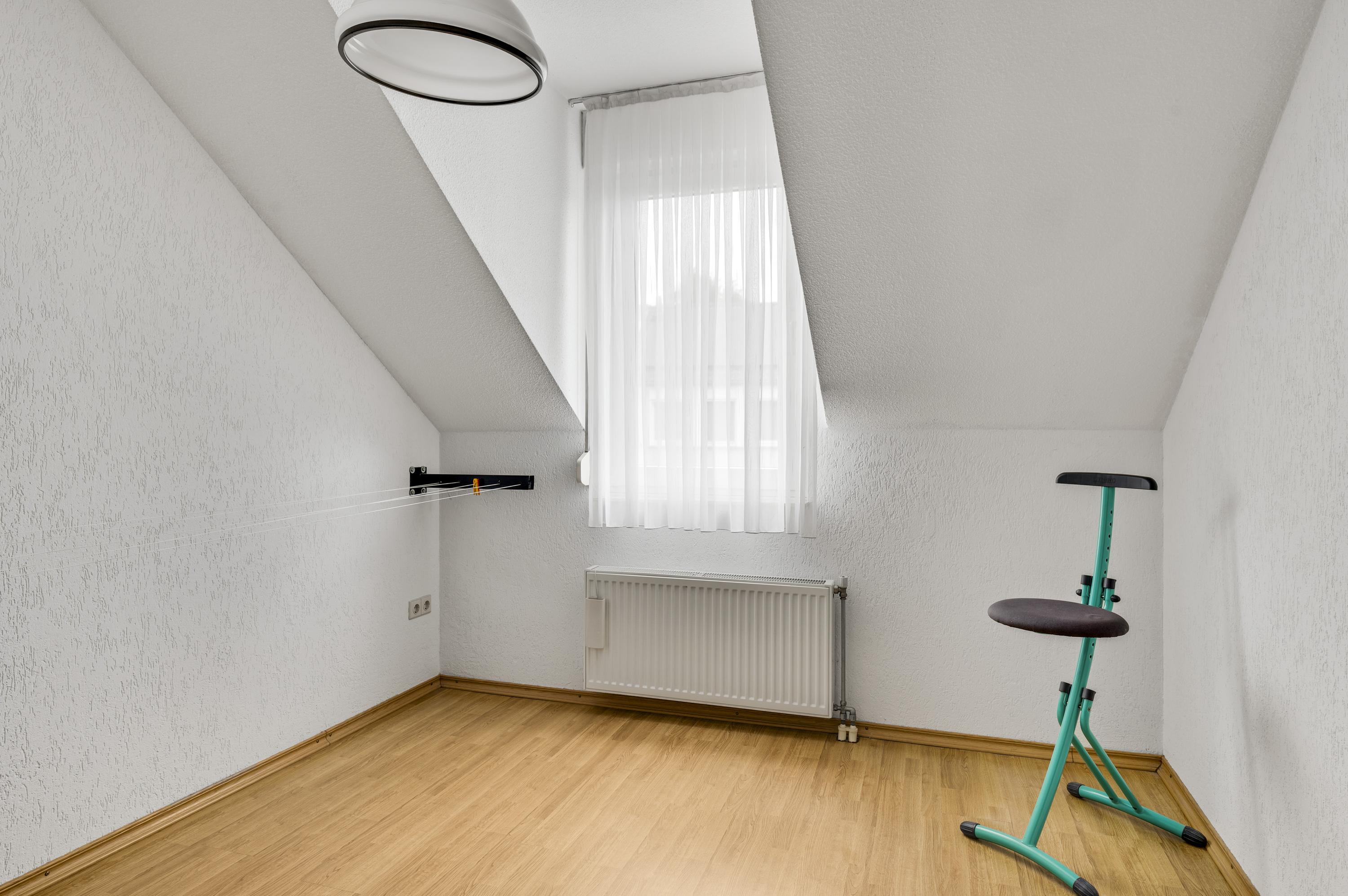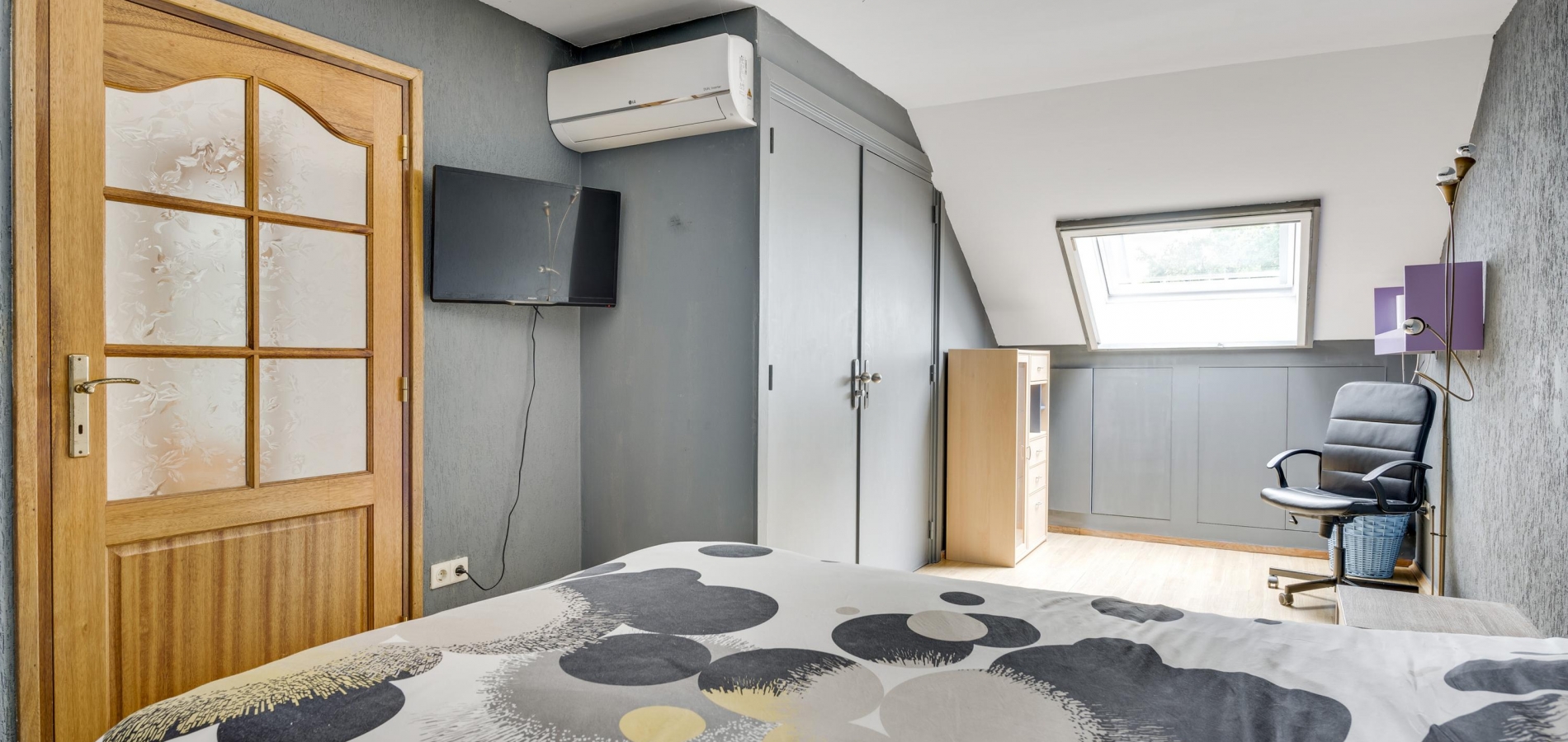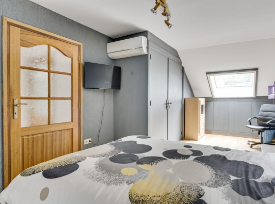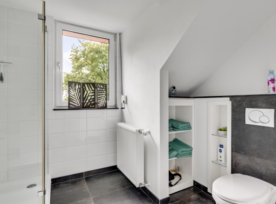 De slaapkamer (circa 2,40 x 2,78) heeft ramen aan twee zijden en, net als de woonkamer, een berging in de schuinte van het dak. Aan de andere zijde van de hal is de badkamer (circa 2,78 x 2,46) met een ruime douche, toilet en een wastafel.