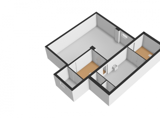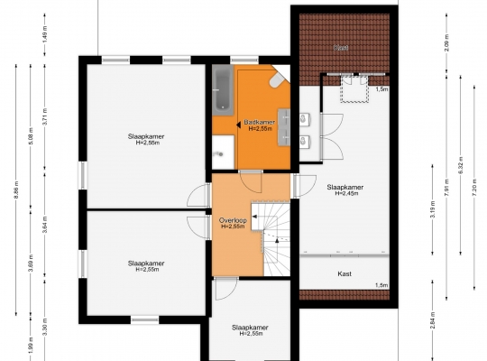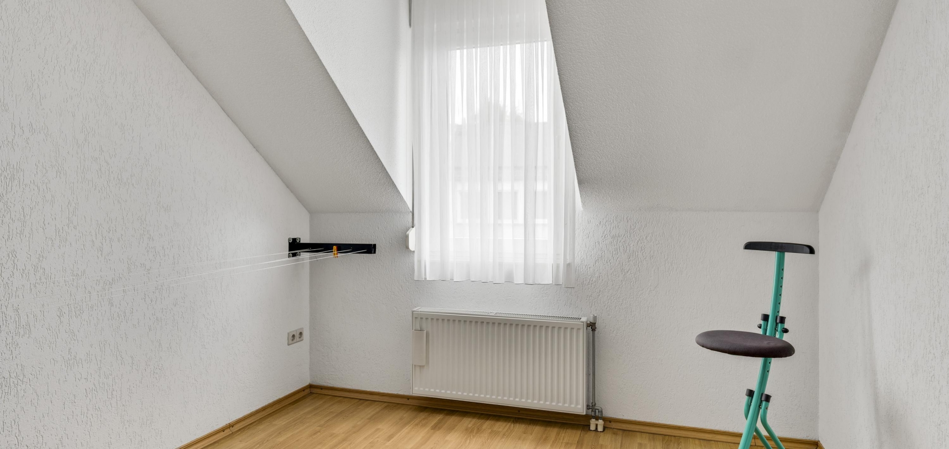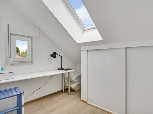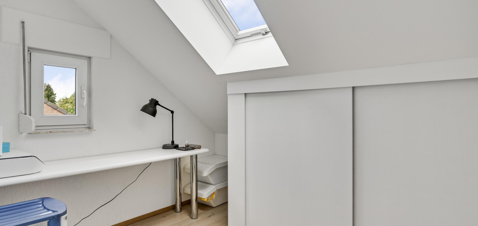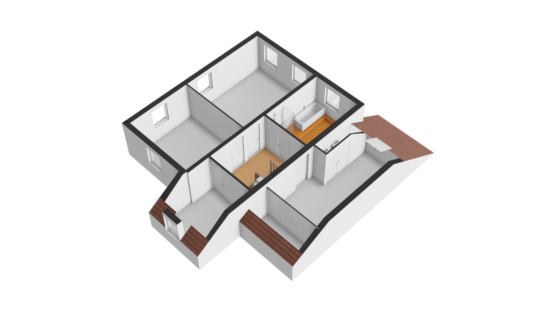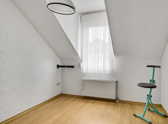 De slaapkamer (circa 2,40 x 2,78) heeft ramen aan twee zijden en, net als de woonkamer, een berging in de schuinte van het dak. Aan de andere zijde van de hal is de badkamer (circa 2,78 x 2,46) met een ruime douche, toilet en een wastafel.