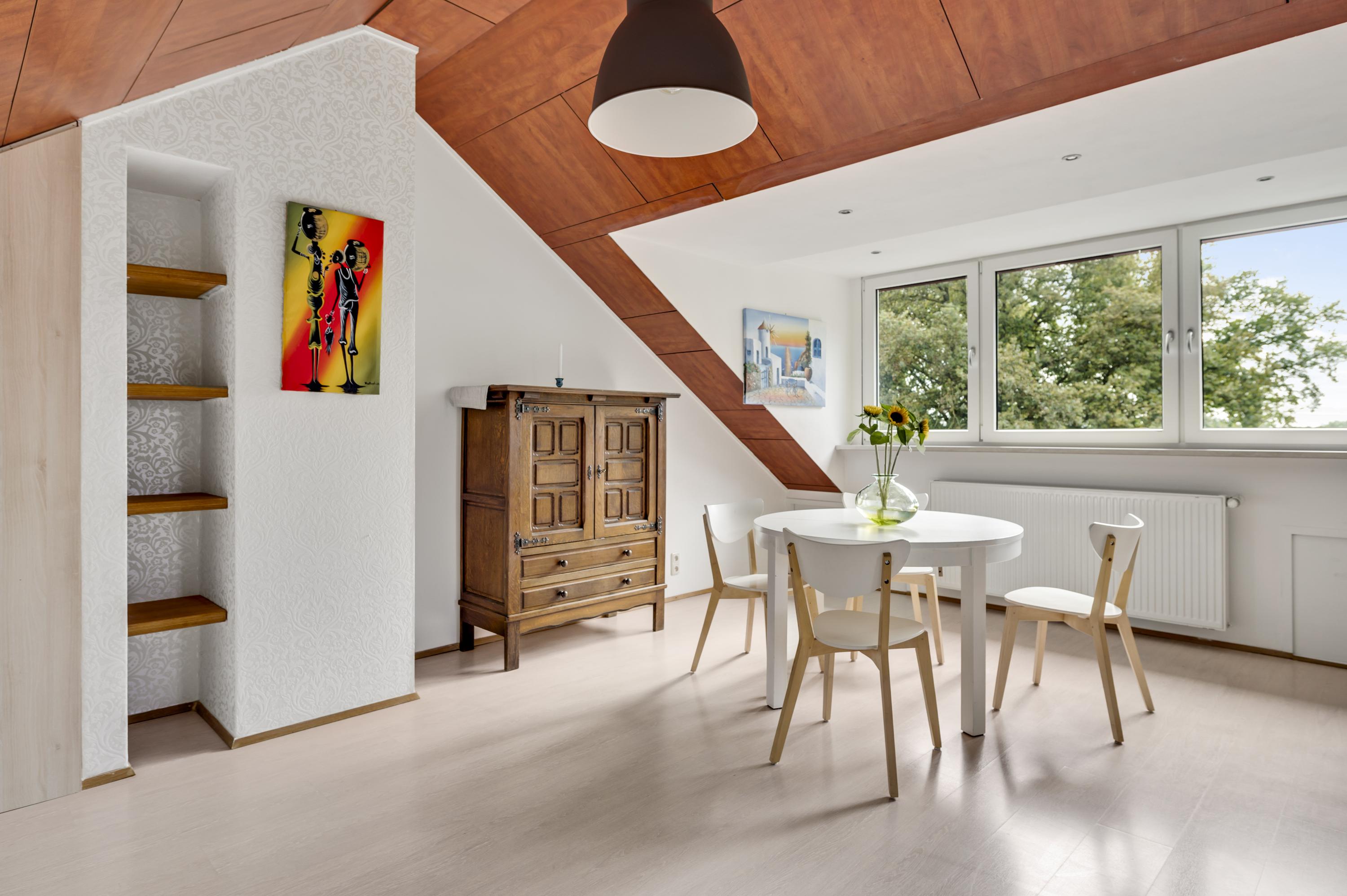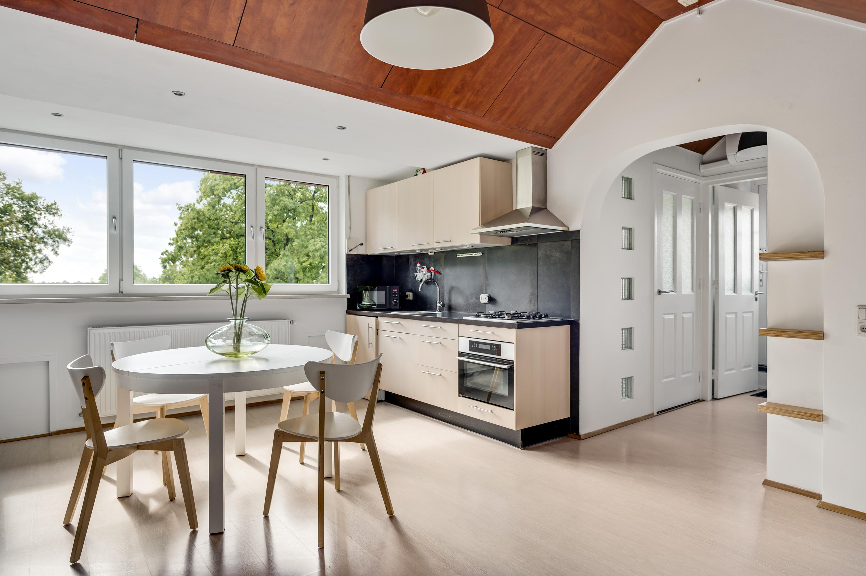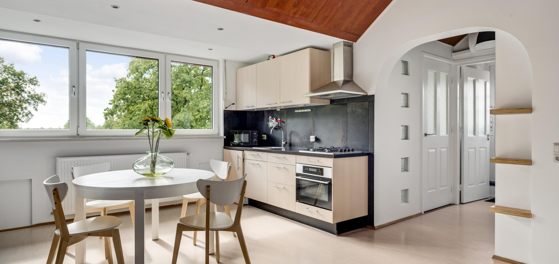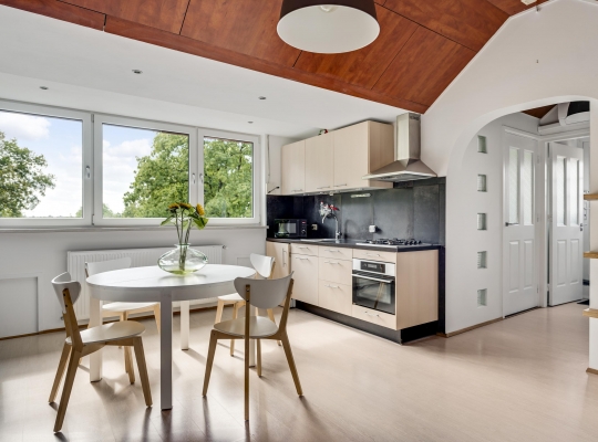 Vervolgens loopt u naar de hal, die uit twee delen bestaat. Hier heeft u toegang tot de woonkamer met open keuken, een slaapkamer en badkamer. De woonkamer met open keuken is circa 5,53 x 4,19 meter, met een dakkapel en een berging in de schuinte van het dak. Er is genoeg plek voor een lekkere bank, een kast en de eettafel. De keuken in wandopstelling heeft de nodige inbouwapparatuur.