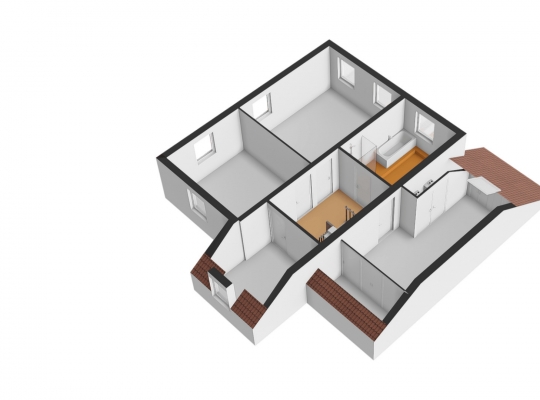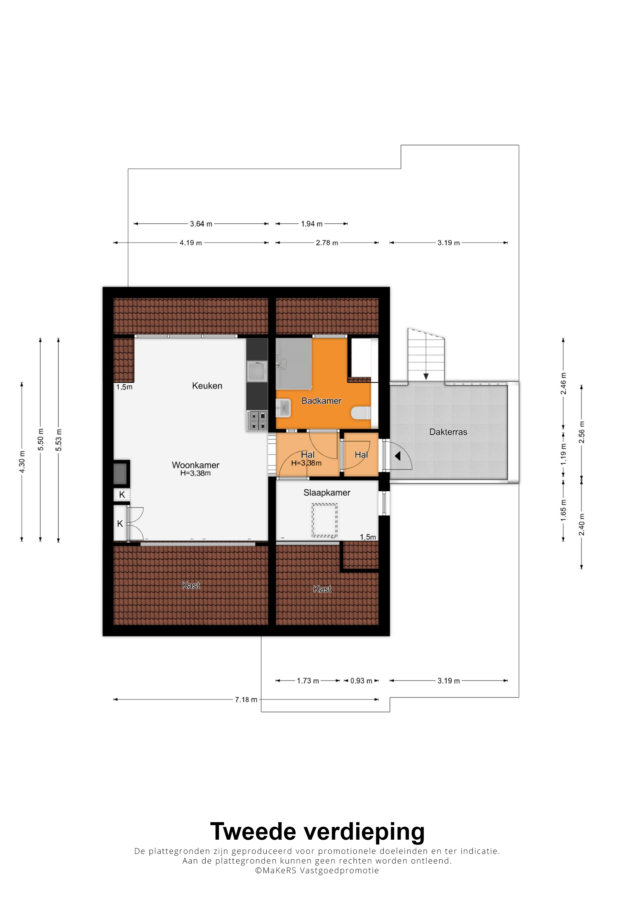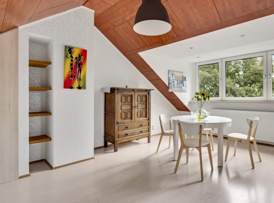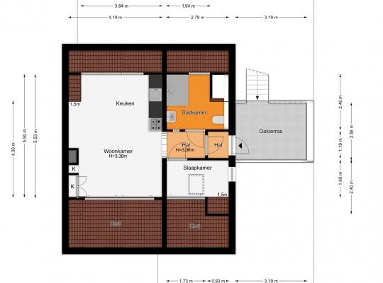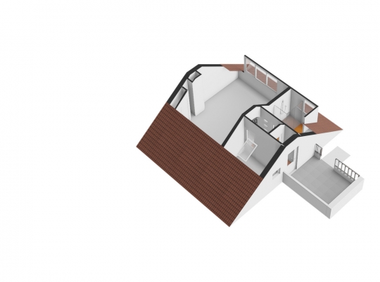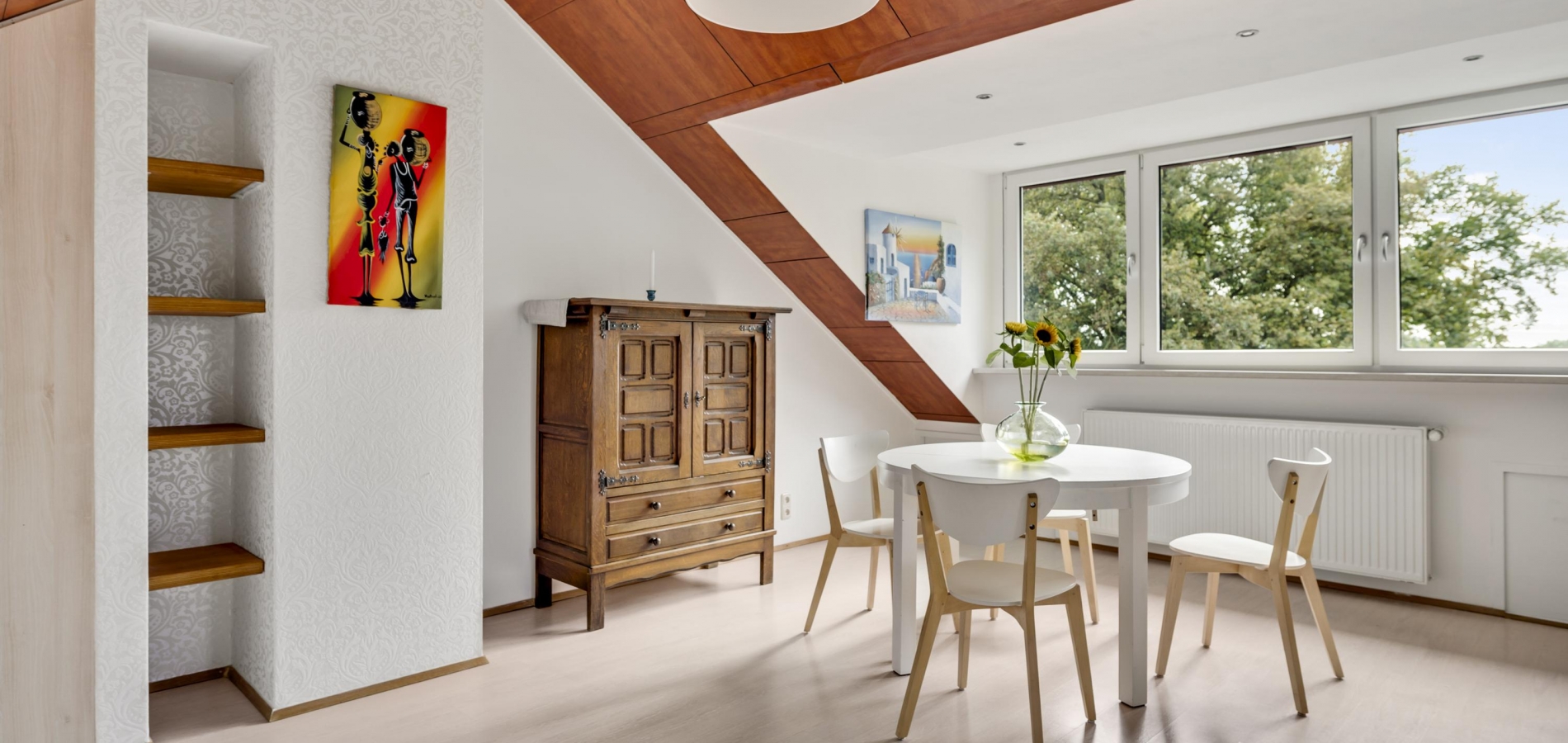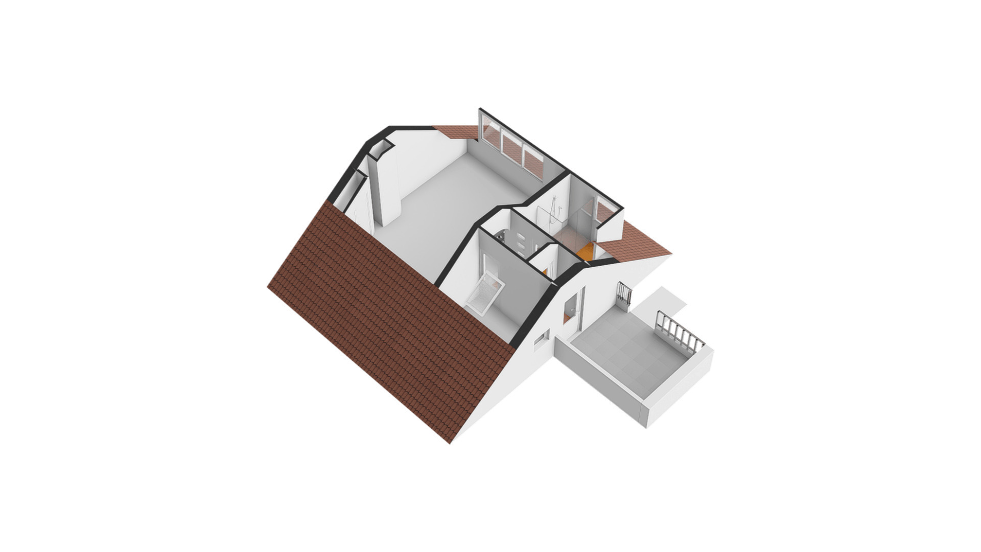Vervolgens loopt u naar de hal, die uit twee delen bestaat. Hier heeft u toegang tot de woonkamer met open keuken, een slaapkamer en badkamer. De woonkamer met open keuken is circa 5,53 x 4,19 meter, met een dakkapel en een berging in de schuinte van het dak. Er is genoeg plek voor een lekkere bank, een kast en de eettafel. De keuken in wandopstelling heeft de nodige inbouwapparatuur.
