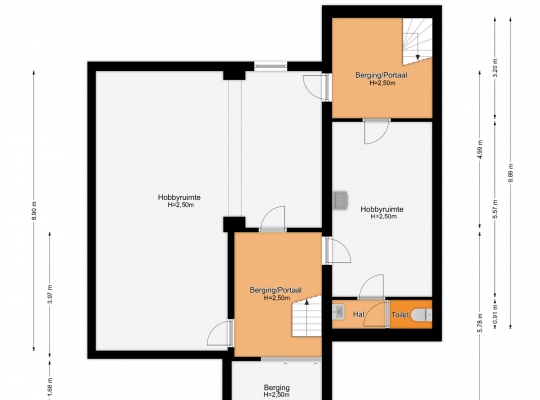 Onder de garage zijn een berging en een tweede hobbyruimte. In de berging (circa 3,20 x 3,20) is de trap naar de garage en de hobbyruimte (circa 5,57 x 3,19) is voorzien van verwarming, water, en een toilet met portaal.