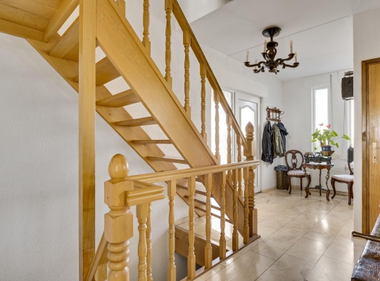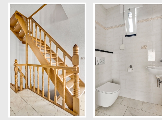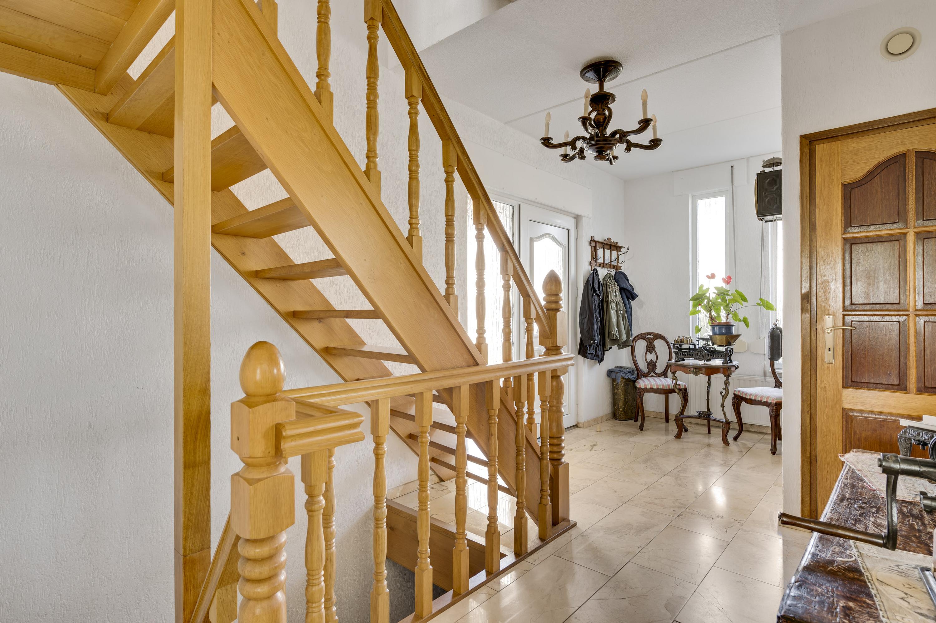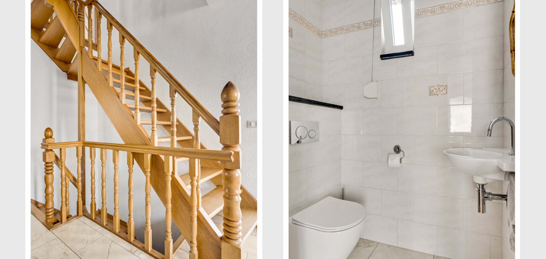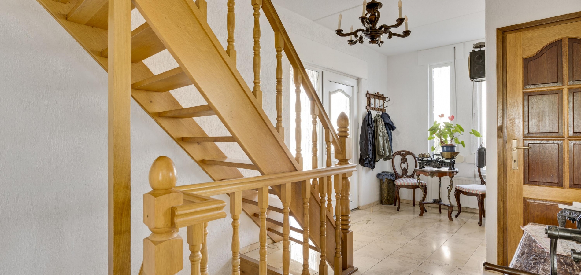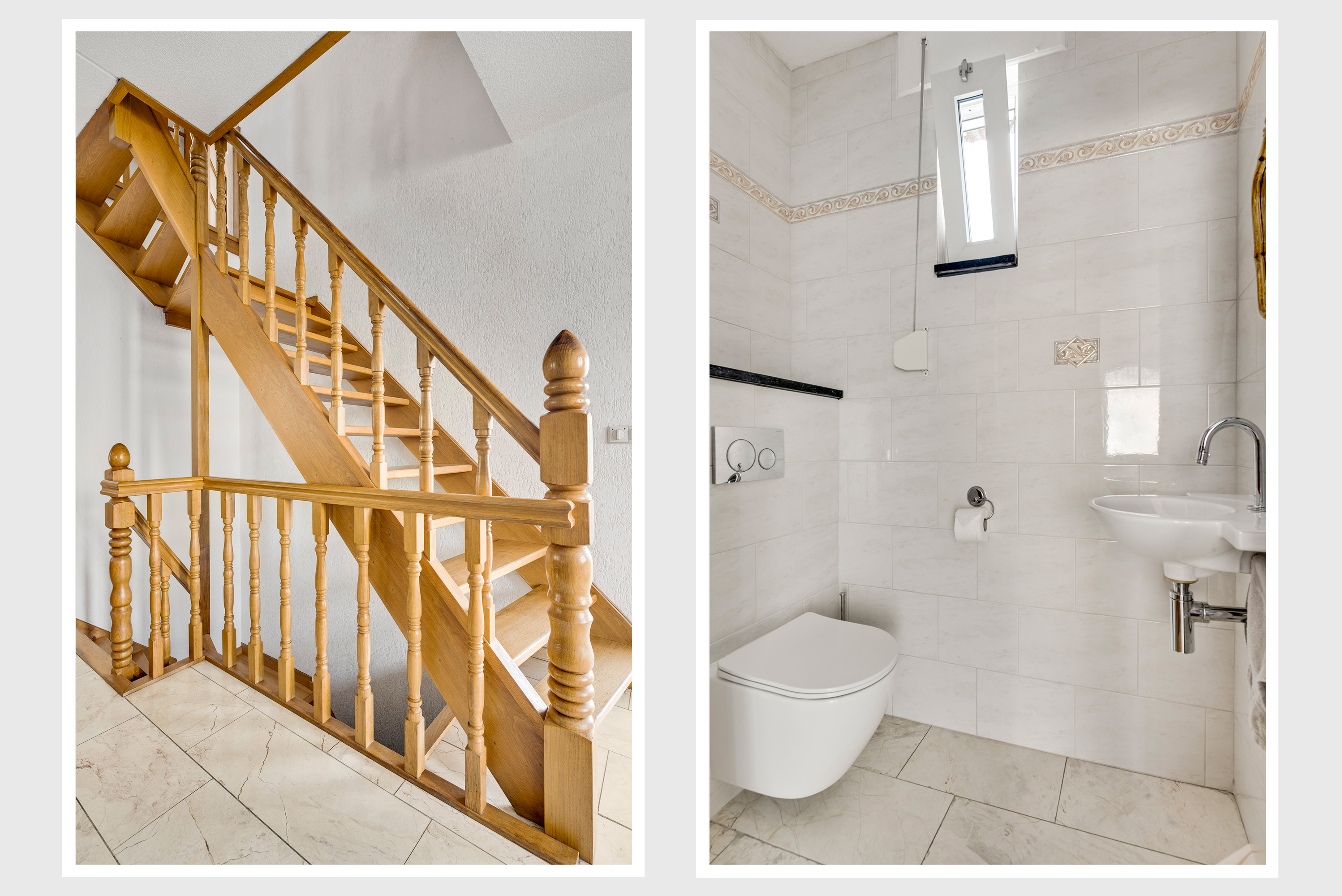 De ontvangsthal, met het trappenhuis en een marmeren vloer, heeft een zeer ruime opzet en veel lichtinval. Links in de hal zijn de meterkast en het stijlvolle gastentoilet 2023. Ook hier ligt, net als op bijna de hele begane grond, een marmeren vloer met vloerverwarming.
