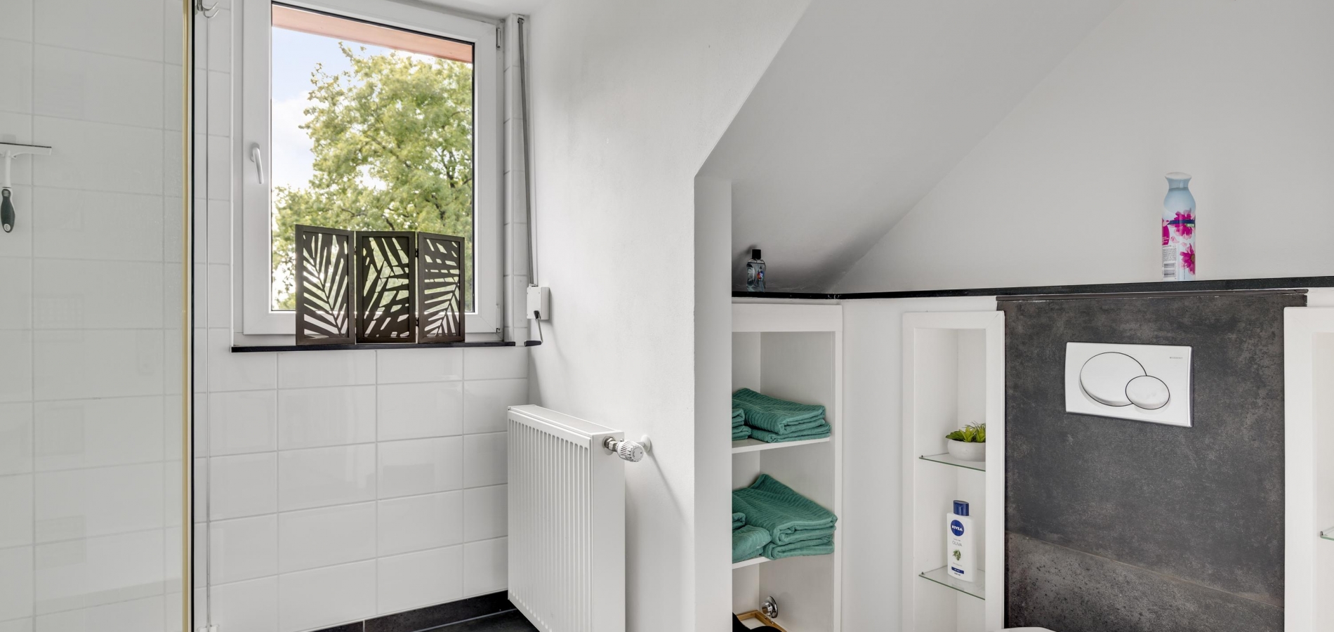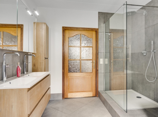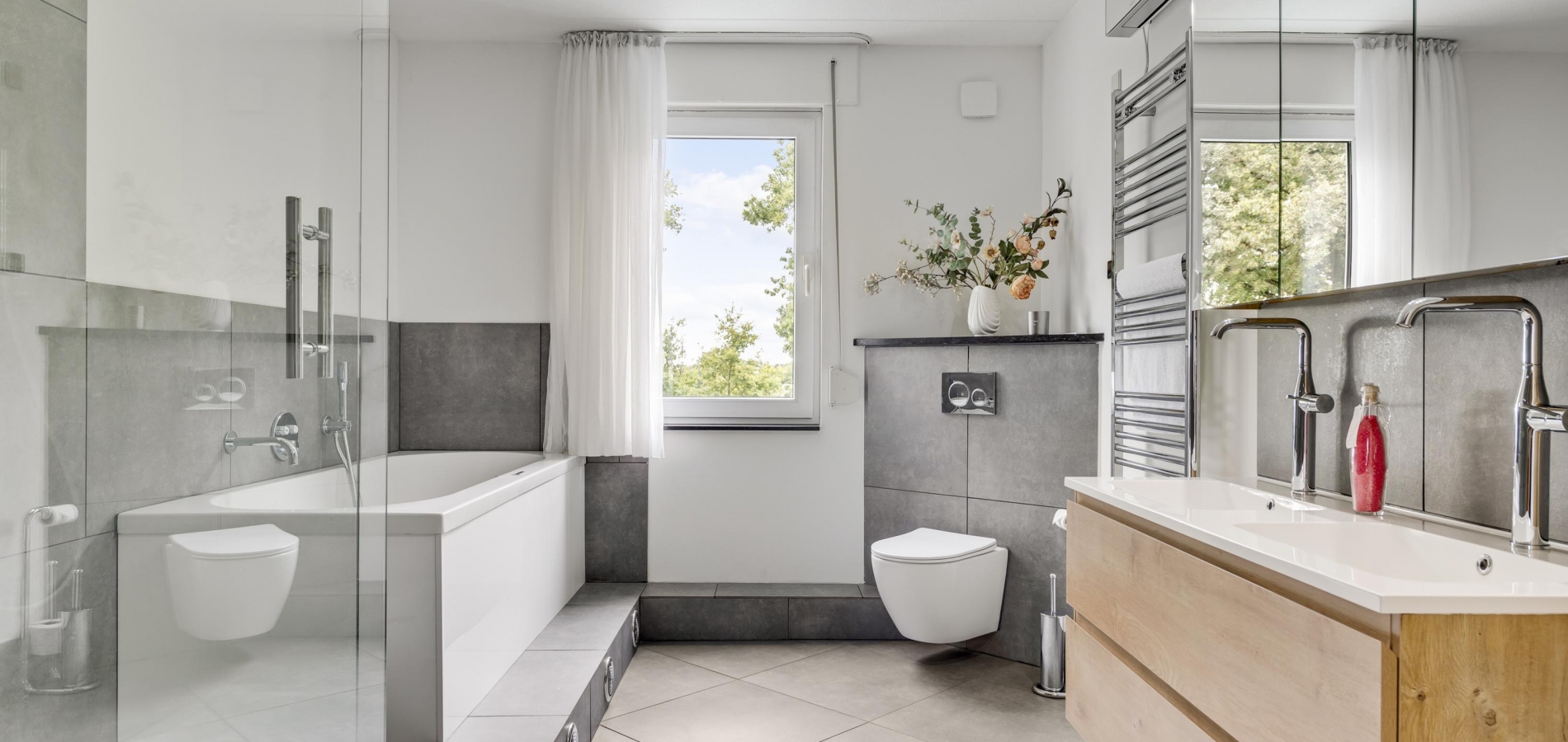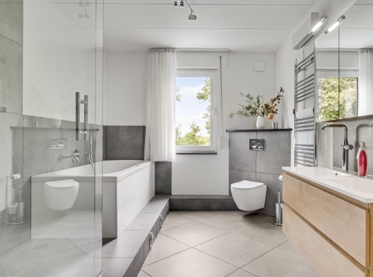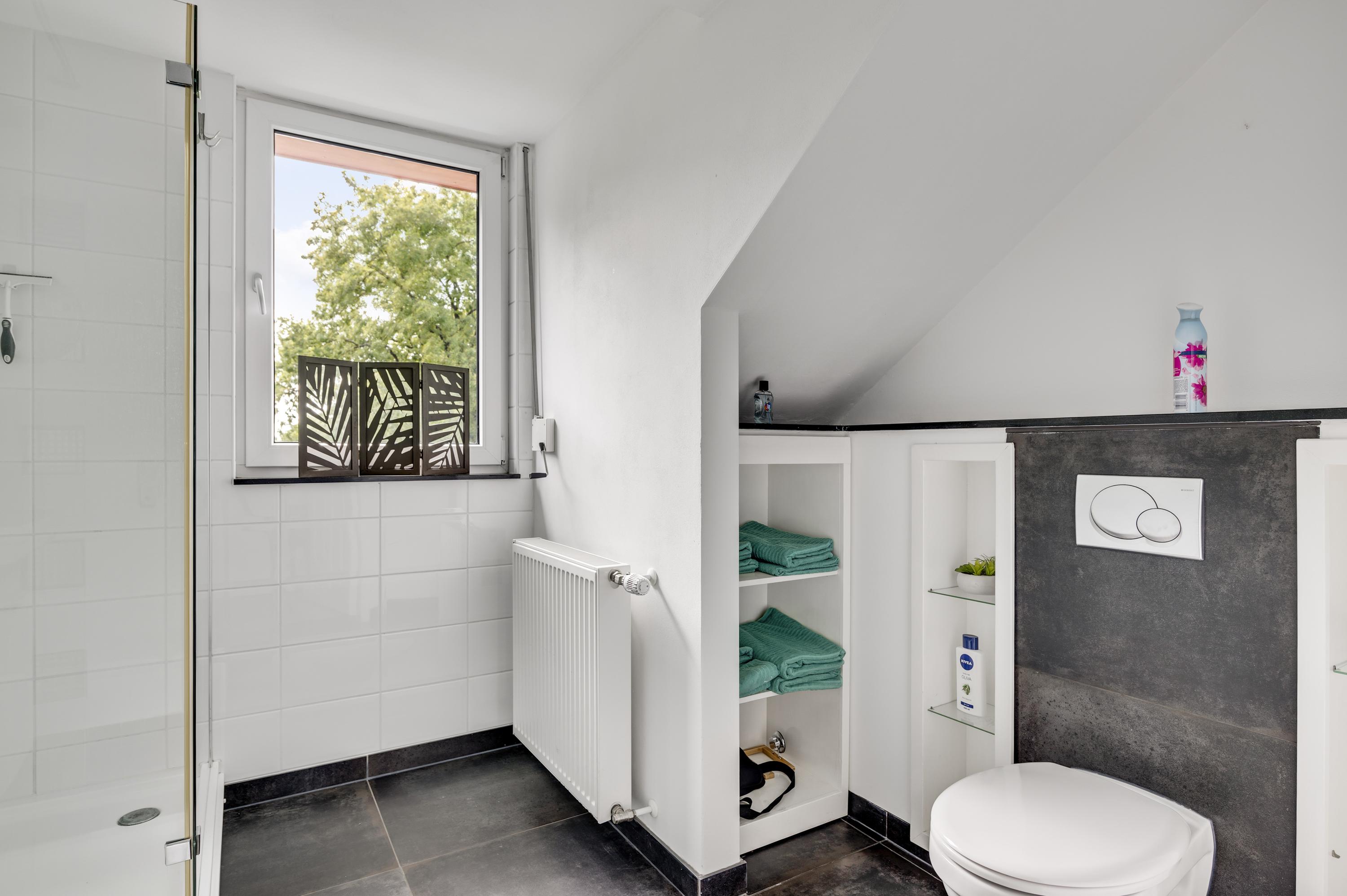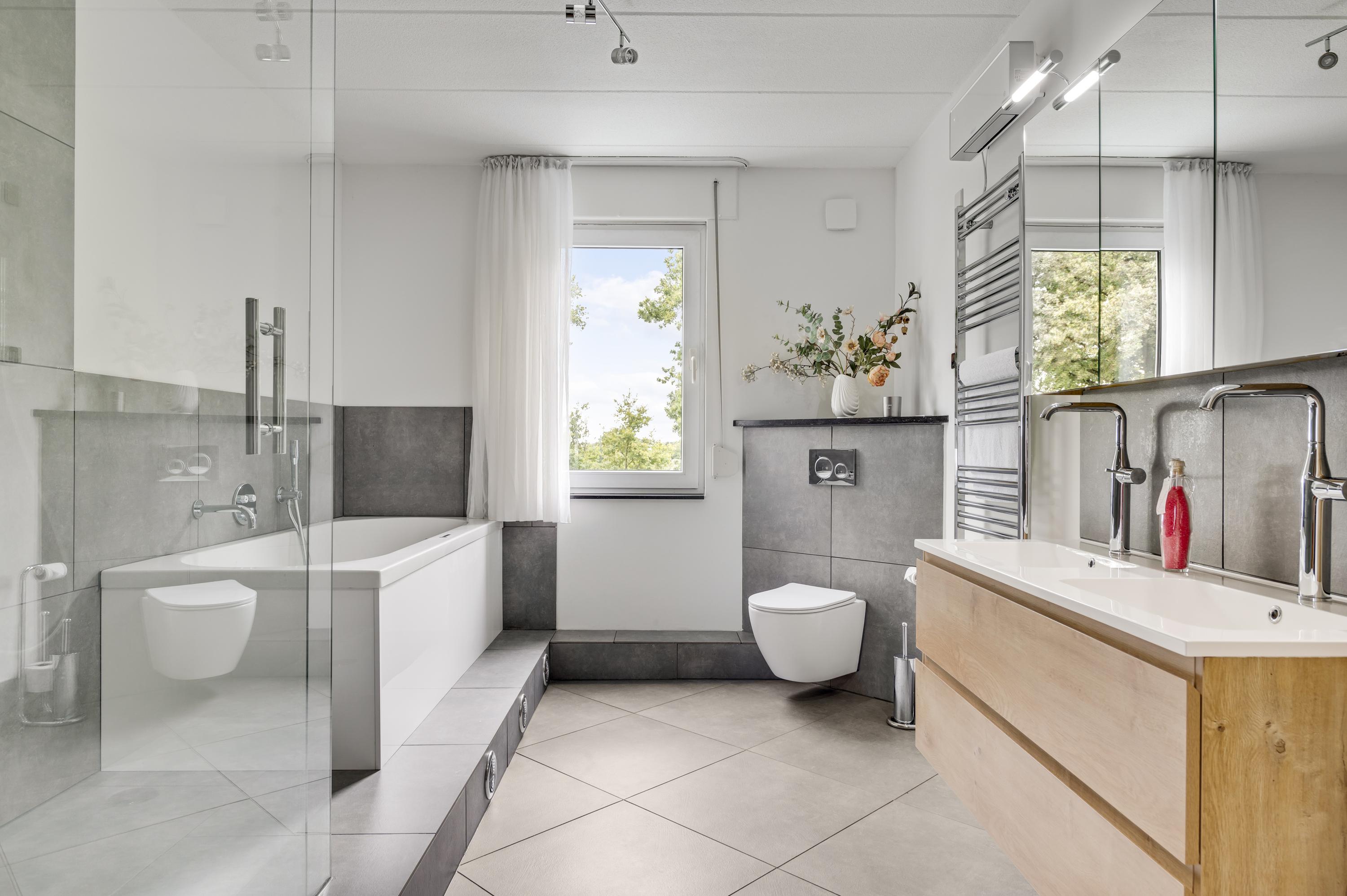 De moderne badkamer 2023 (circa 3,71 x 2,77) is ingedeeld met een whirlpoolbad, aparte douche, een wandcloset en een dubbel wastafelmeubel met spiegelkast. De badkamer heeft niet alleen een designradiator maar ook vloerverwarming.