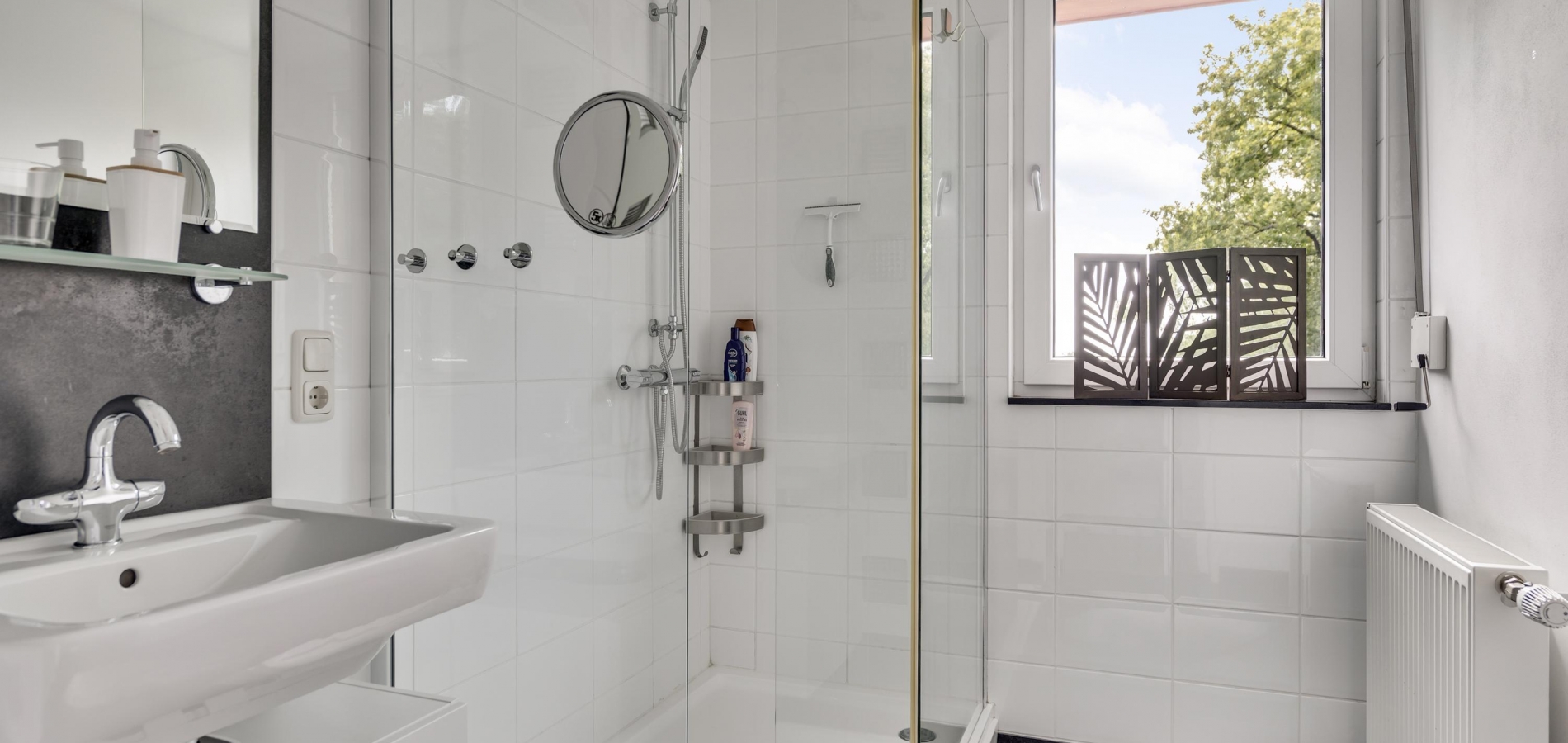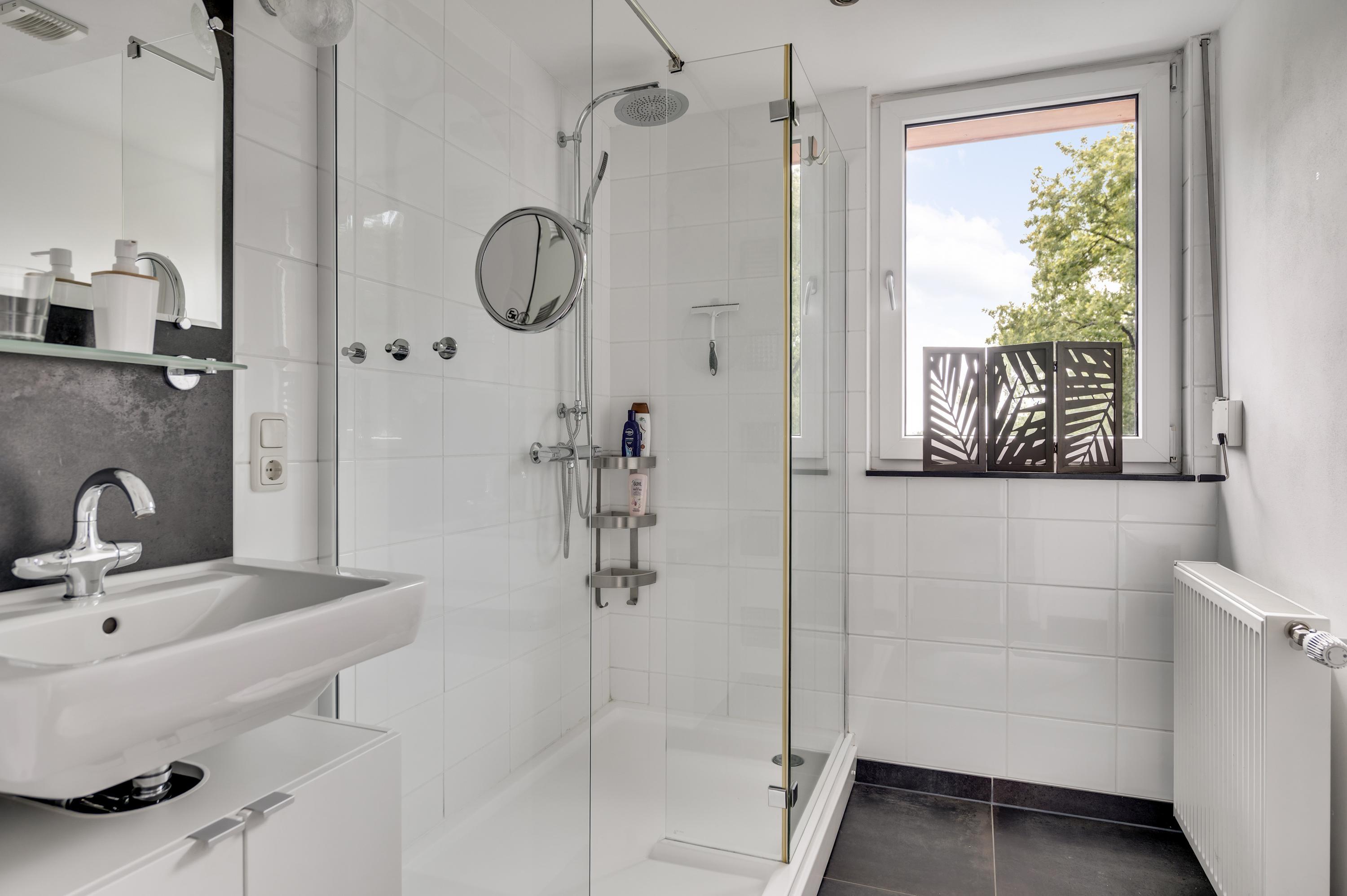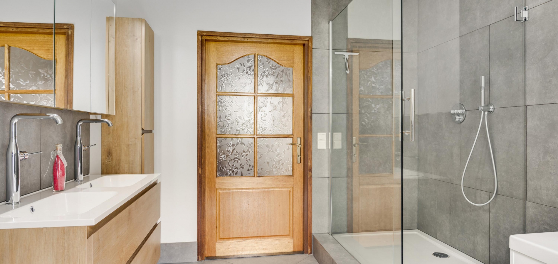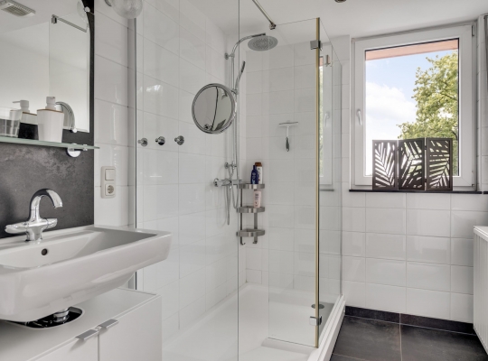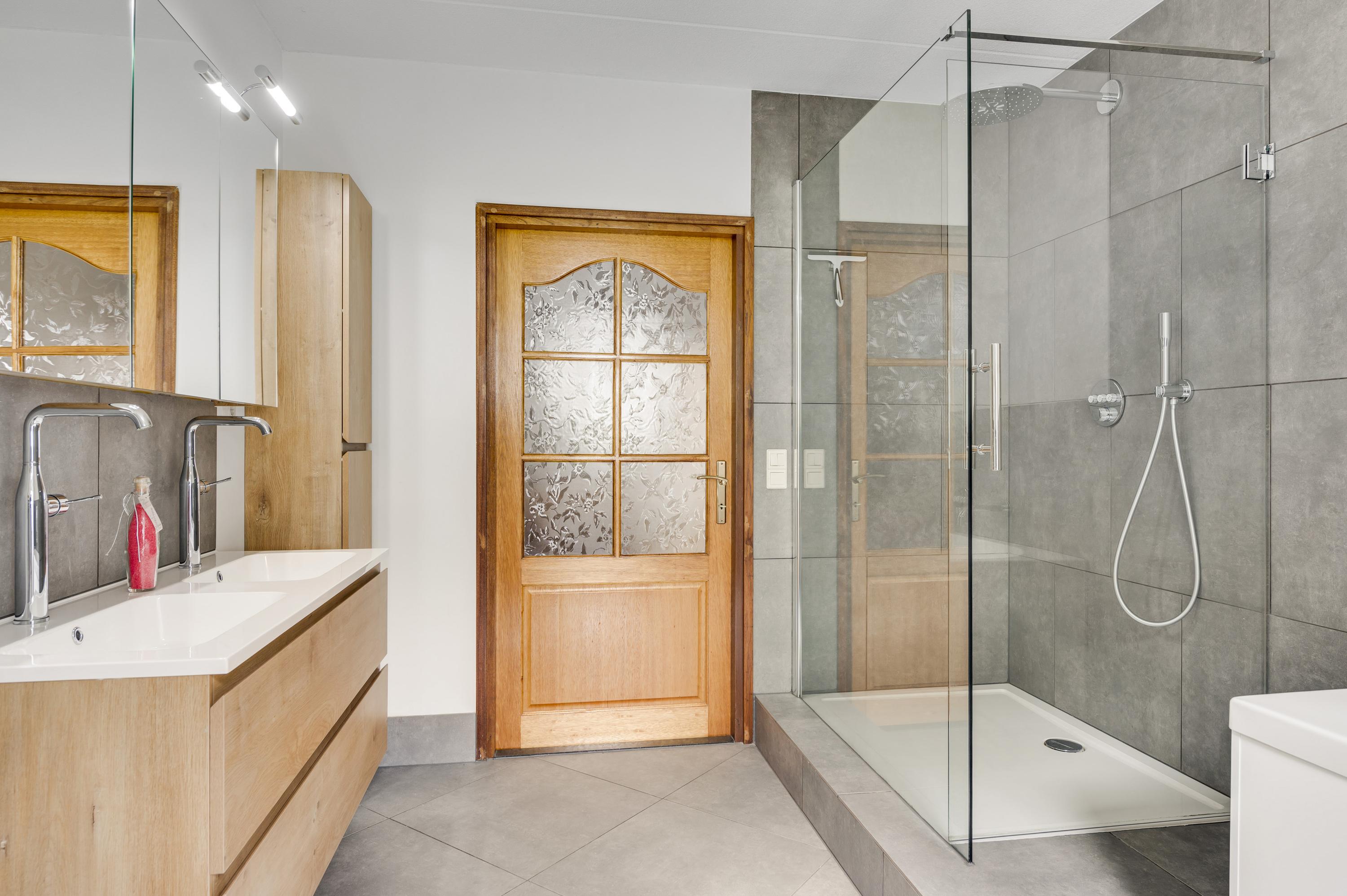 De moderne badkamer 2023 (circa 3,71 x 2,77) is ingedeeld met een whirlpoolbad, aparte douche, een wandcloset en een dubbel wastafelmeubel met spiegelkast. De badkamer heeft niet alleen een designradiator maar ook vloerverwarming.