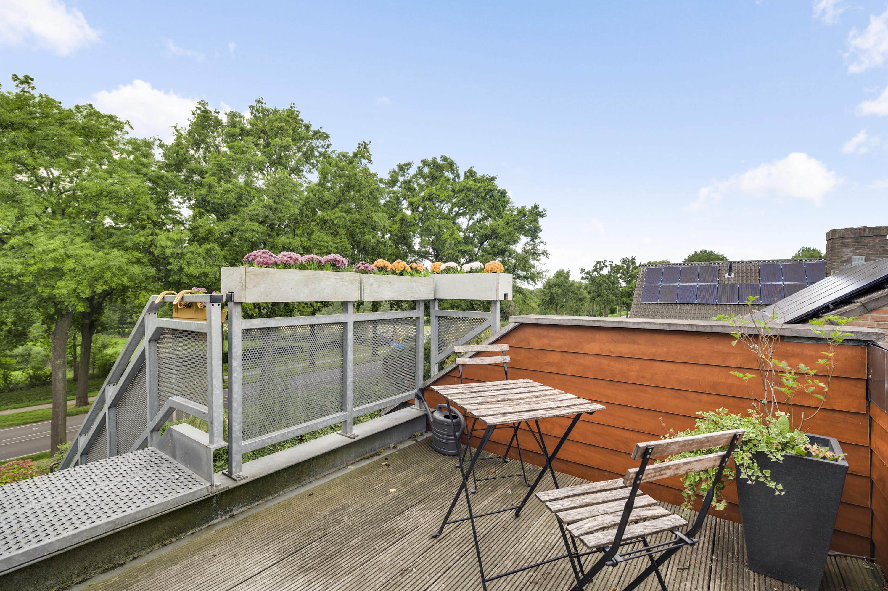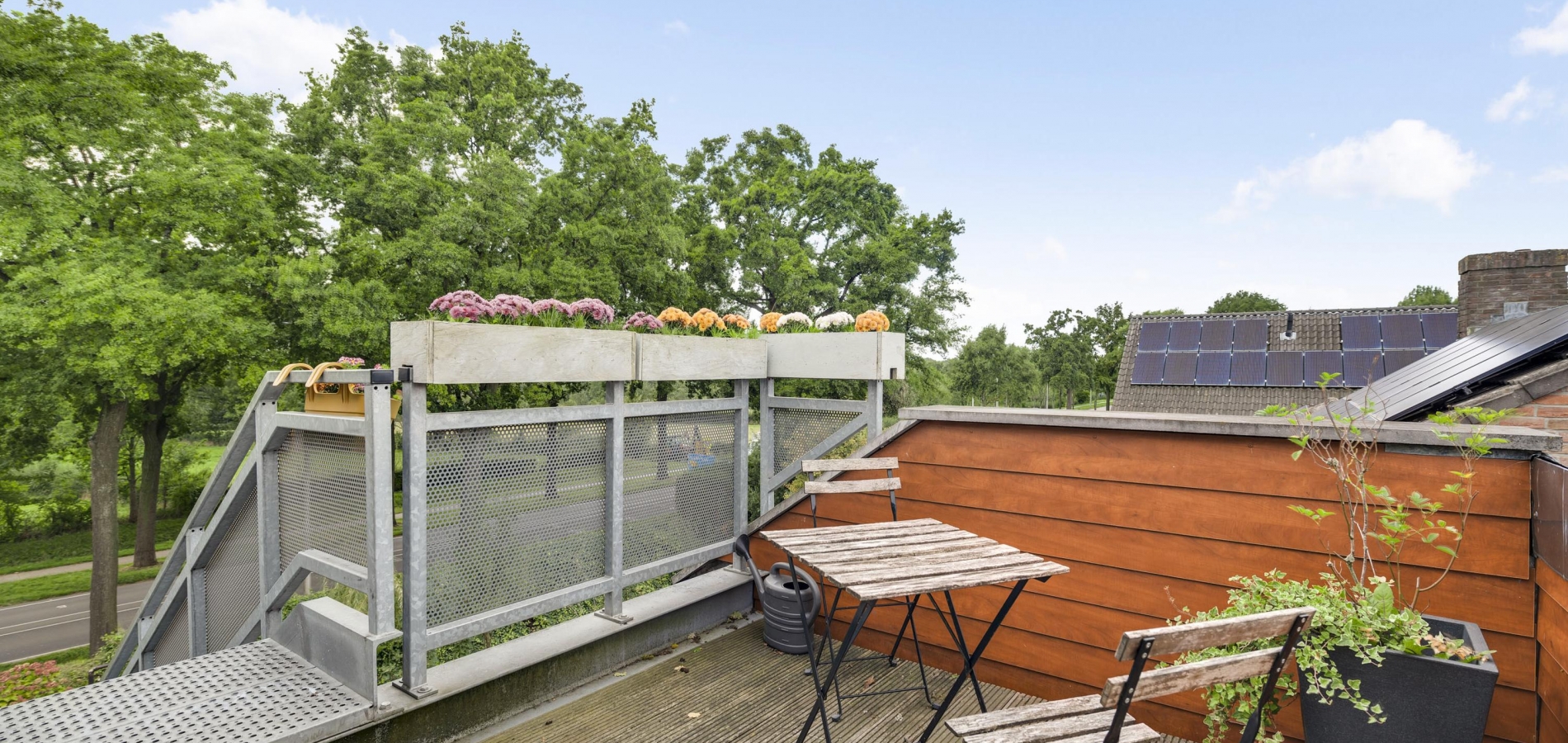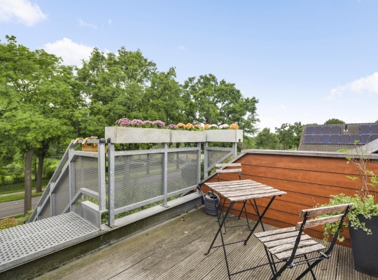 Bijzonder is de tweede verdieping, die momenteel alleen van buitenaf bereikbaar is. Via de stalen buitentrap loopt u, vanuit de tuin, naar een dakterras van circa 3,19 x 2,56 meter. Hier heeft u niet alleen veel zon, er is ook veel groen in het zicht.