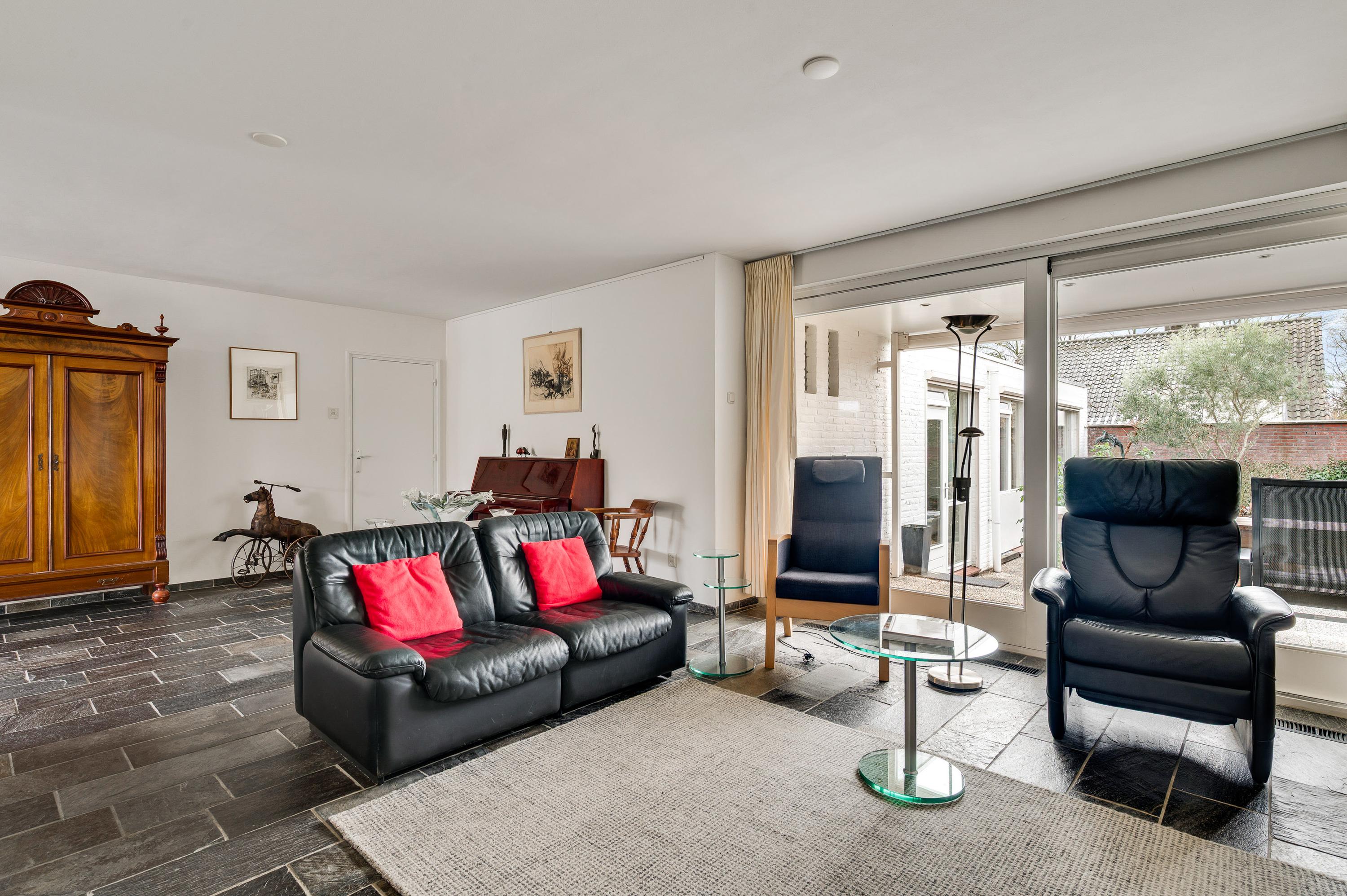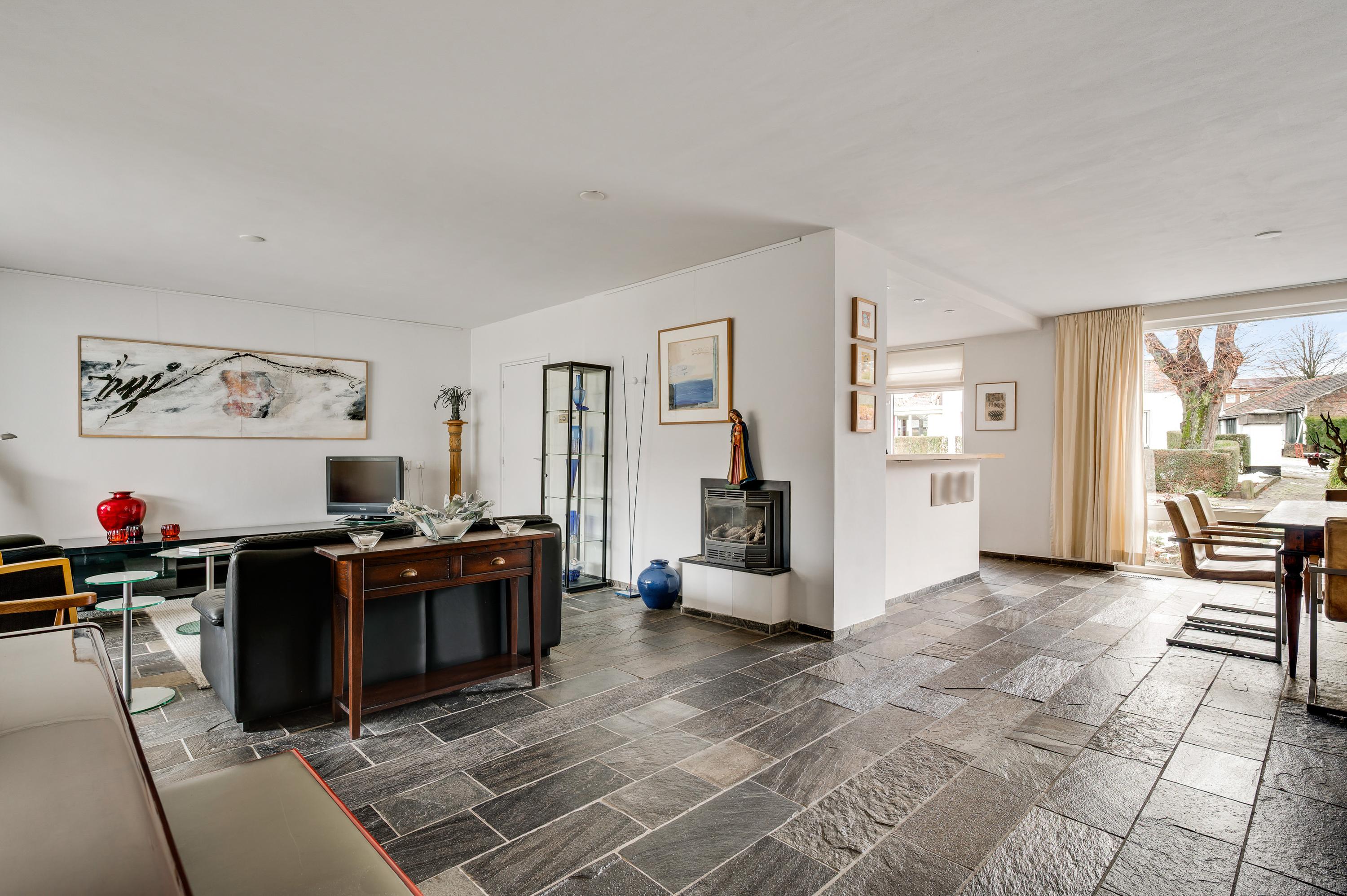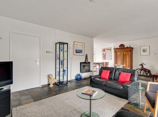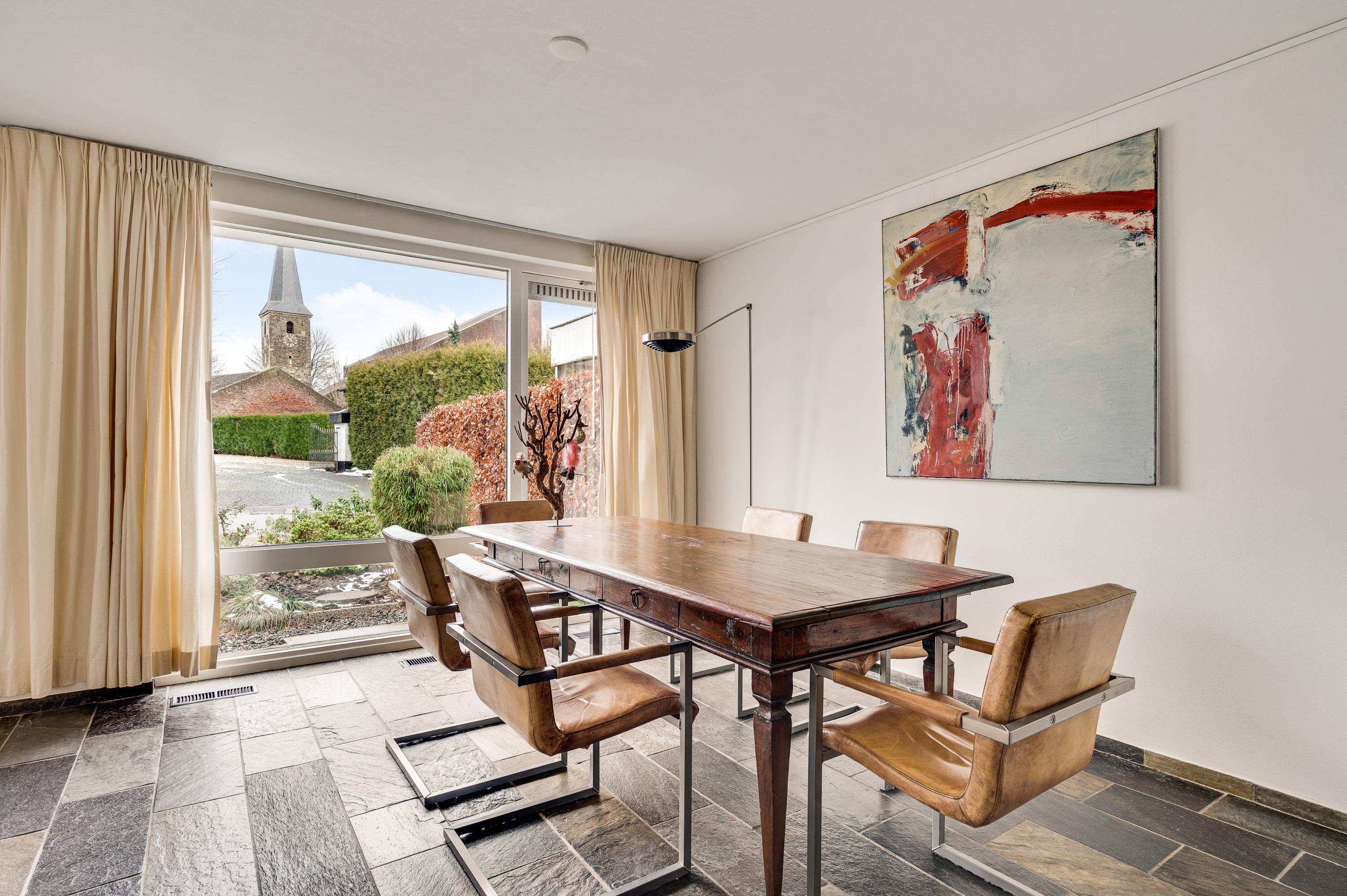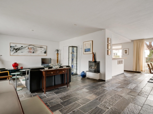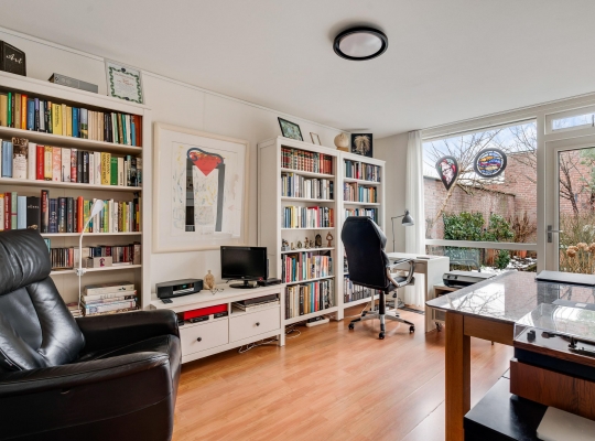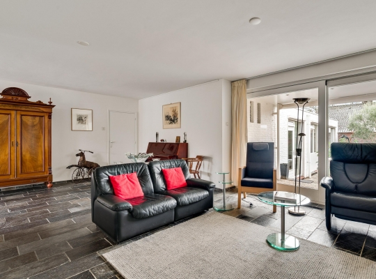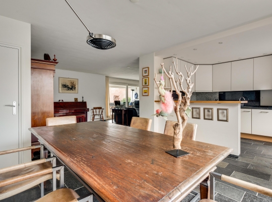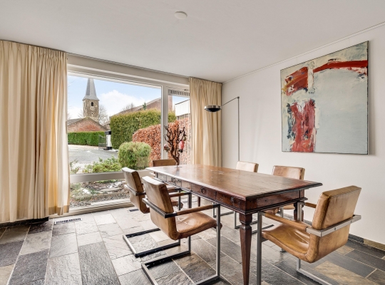 De woon-/eetkamer heeft een totale oppervlakte van circa 50 m2, inclusief halfopen keuken. De donkere leisteen vloer zorgt voor sfeer, net als de inbouwhaard bij het zitgedeelte. Vanuit de eetkamer en keuken is er mooi uitzicht op de rustige straat en de prachtige kerktoren. Een grote schuifpui bij het zitgedeelte zorgt voor een mooie verbinding met de tuin.