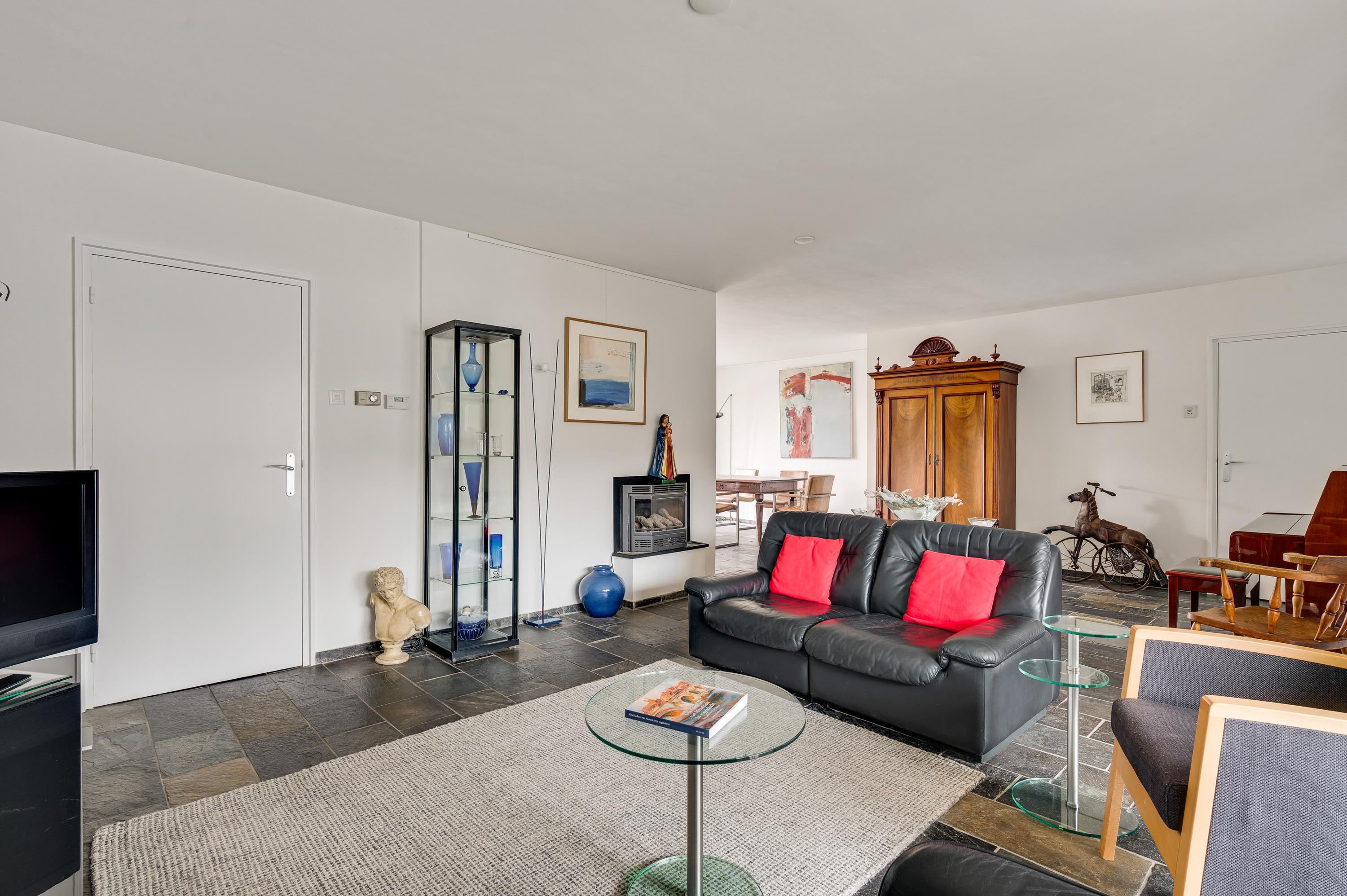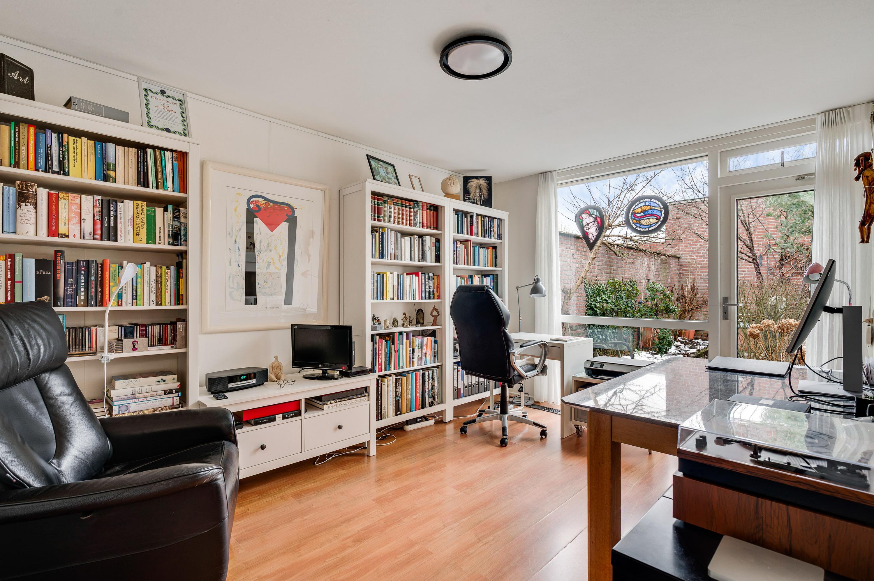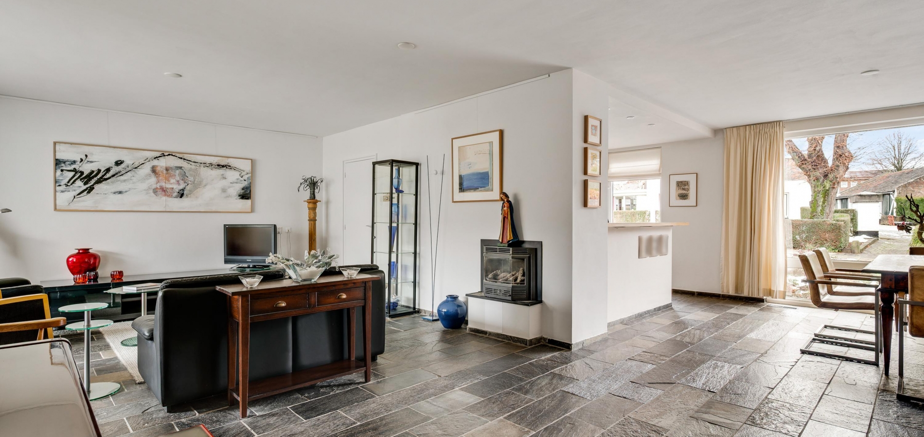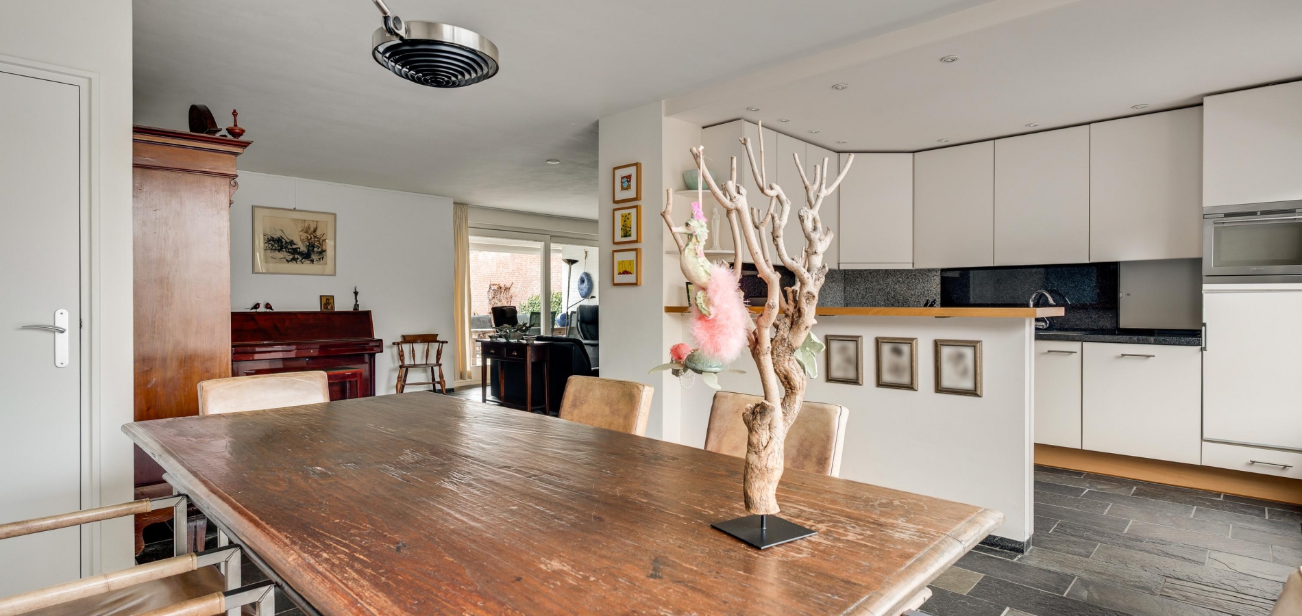 De woon-/eetkamer heeft een totale oppervlakte van circa 50 m2, inclusief halfopen keuken. De donkere leisteen vloer zorgt voor sfeer, net als de inbouwhaard bij het zitgedeelte. Vanuit de eetkamer en keuken is er mooi uitzicht op de rustige straat en de prachtige kerktoren. Een grote schuifpui bij het zitgedeelte zorgt voor een mooie verbinding met de tuin.
