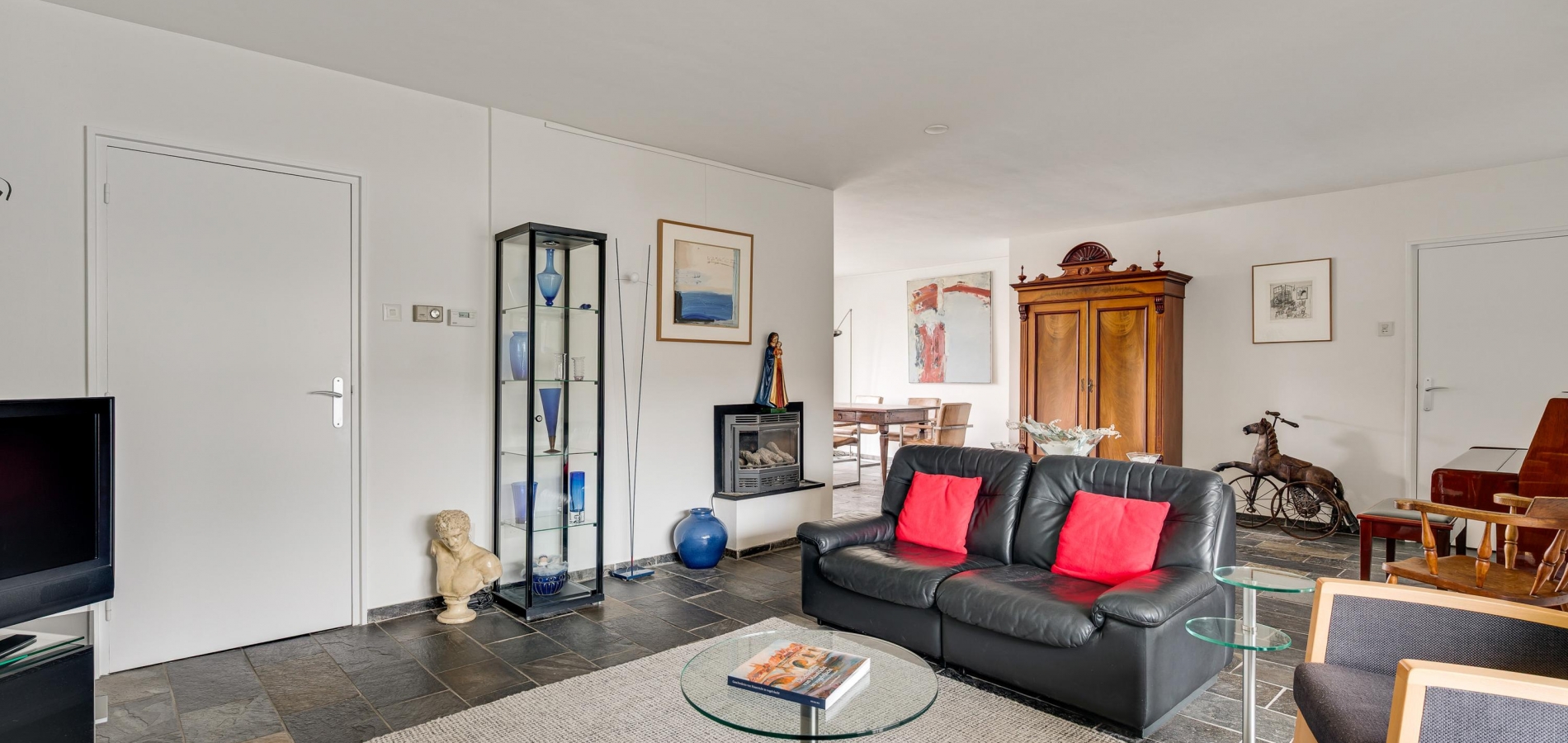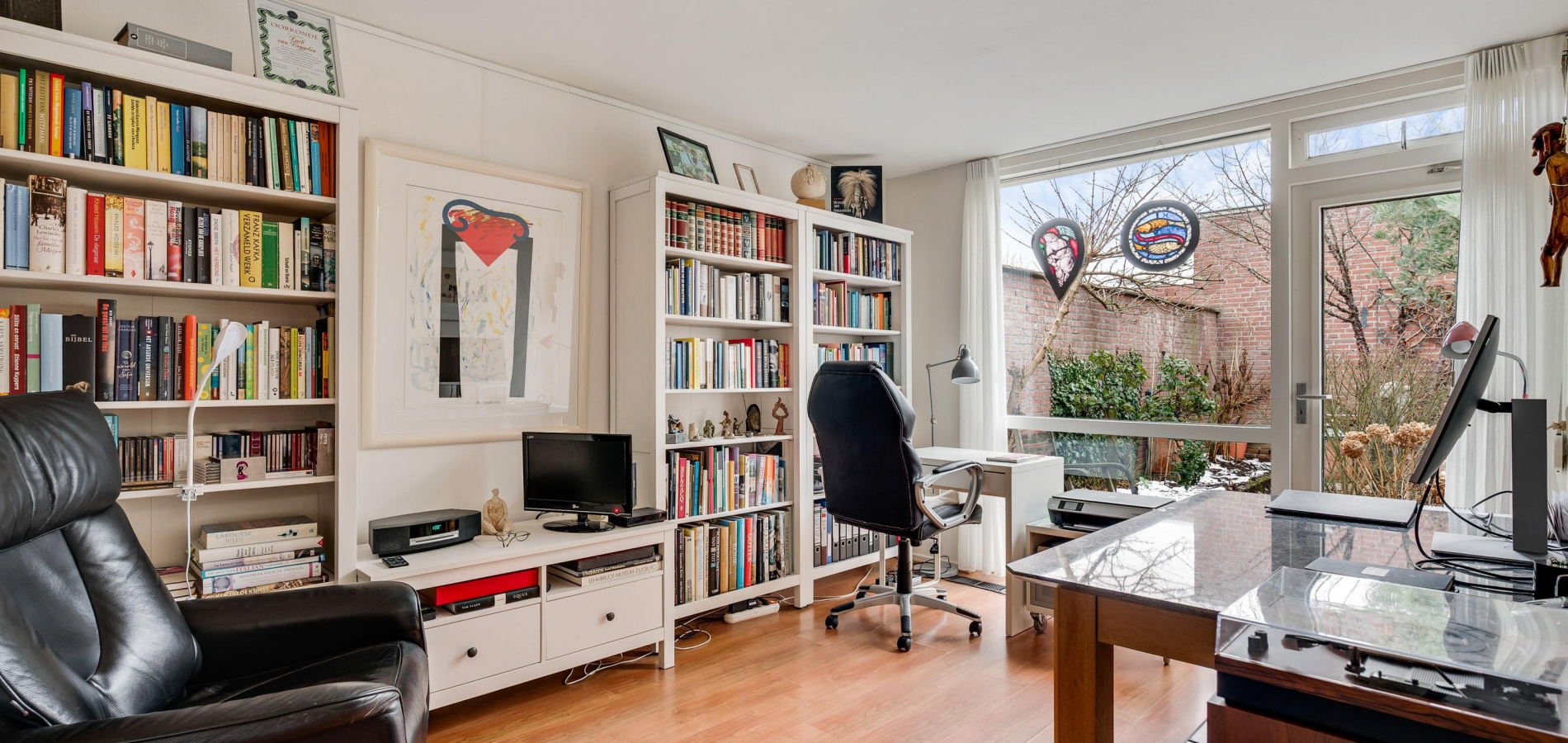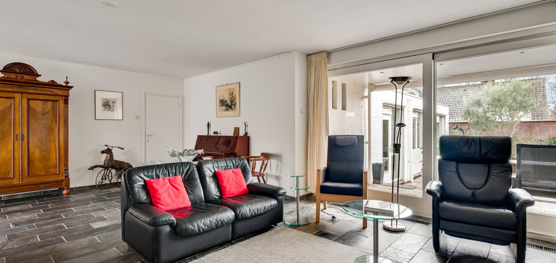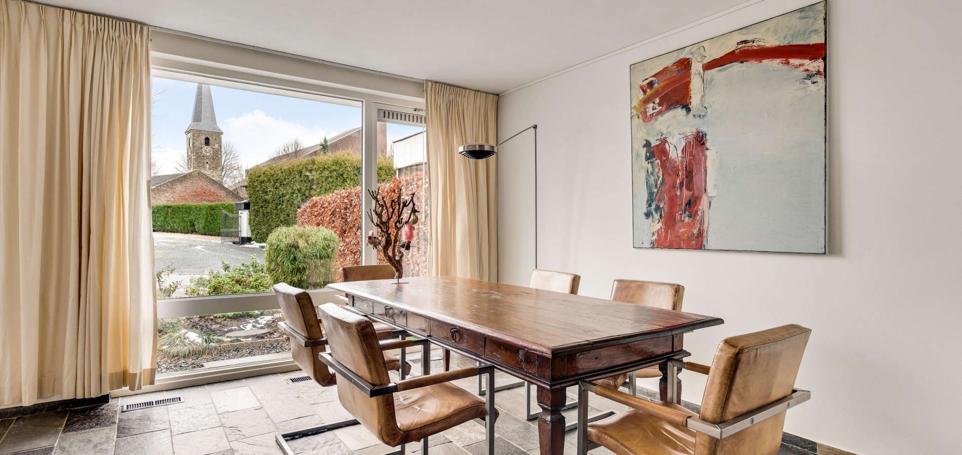 De woon-/eetkamer heeft een totale oppervlakte van circa 50 m2, inclusief halfopen keuken. De donkere leisteen vloer zorgt voor sfeer, net als de inbouwhaard bij het zitgedeelte. Vanuit de eetkamer en keuken is er mooi uitzicht op de rustige straat en de prachtige kerktoren. Een grote schuifpui bij het zitgedeelte zorgt voor een mooie verbinding met de tuin.