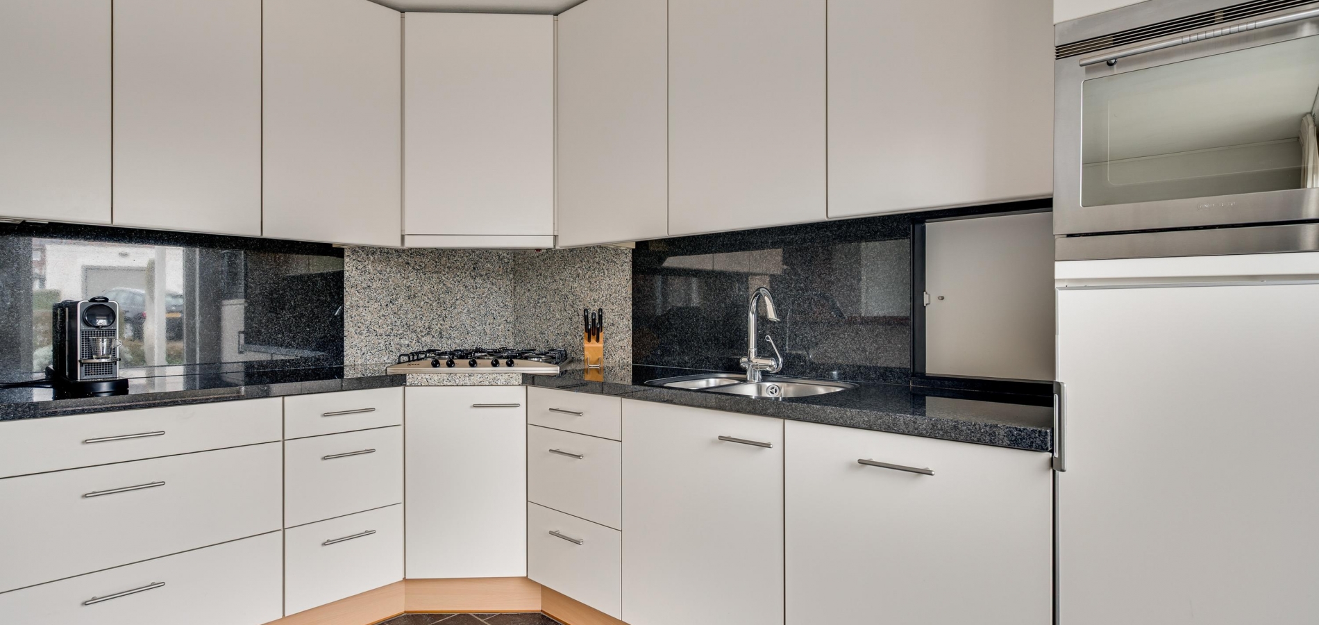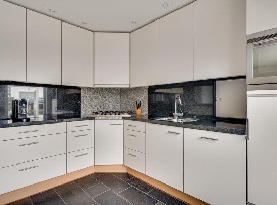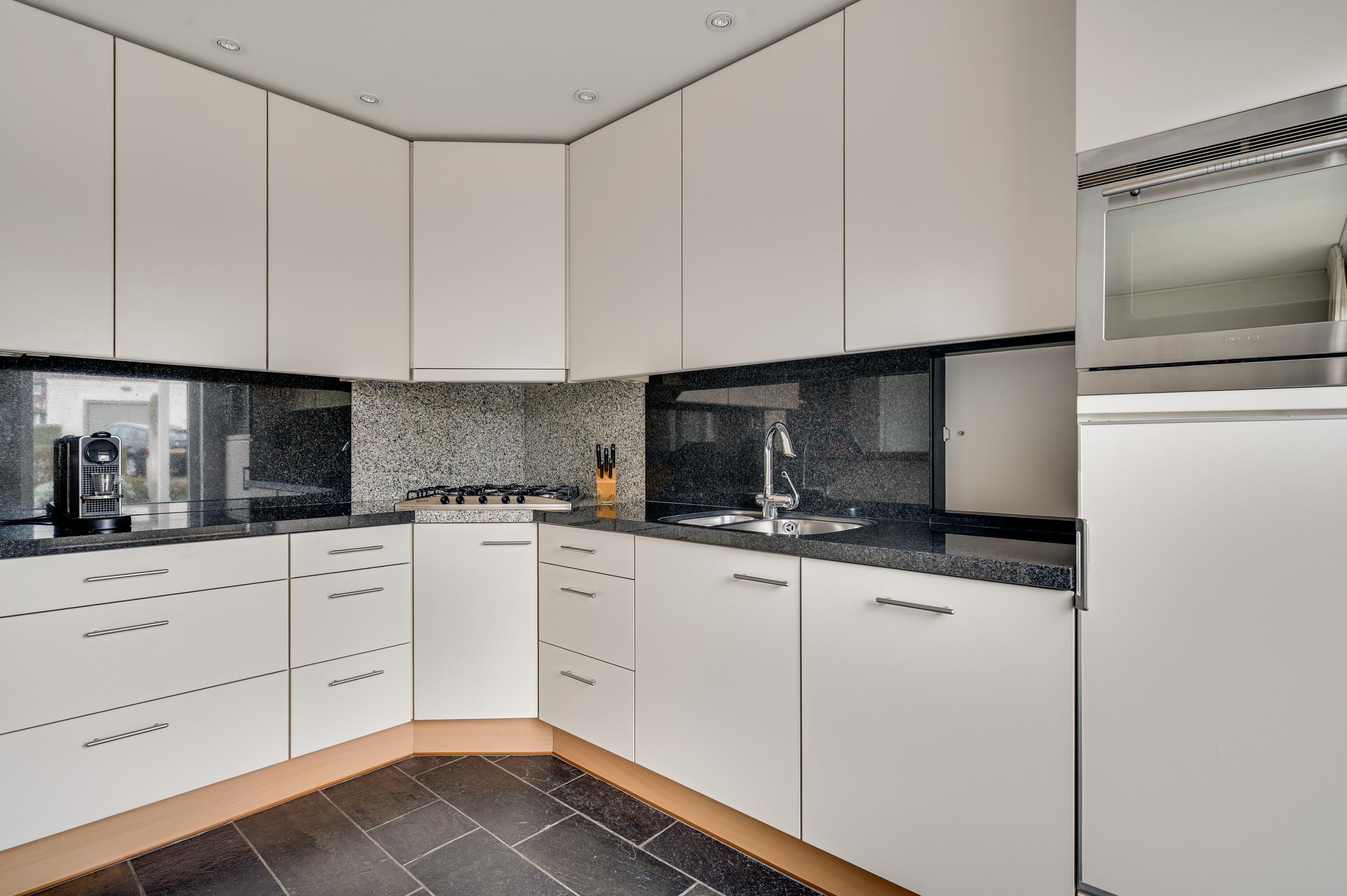 In de halfopen keuken staat een lichte hoekopstelling met een granieten aanrechtblad en achterwand. Deze keuken biedt volop bergruimte en alle benodigde apparatuur is ingebouwd: een 5-pits gaskookplaat, afzuigkap, combi-oven, vaatwasser en een koelkast.