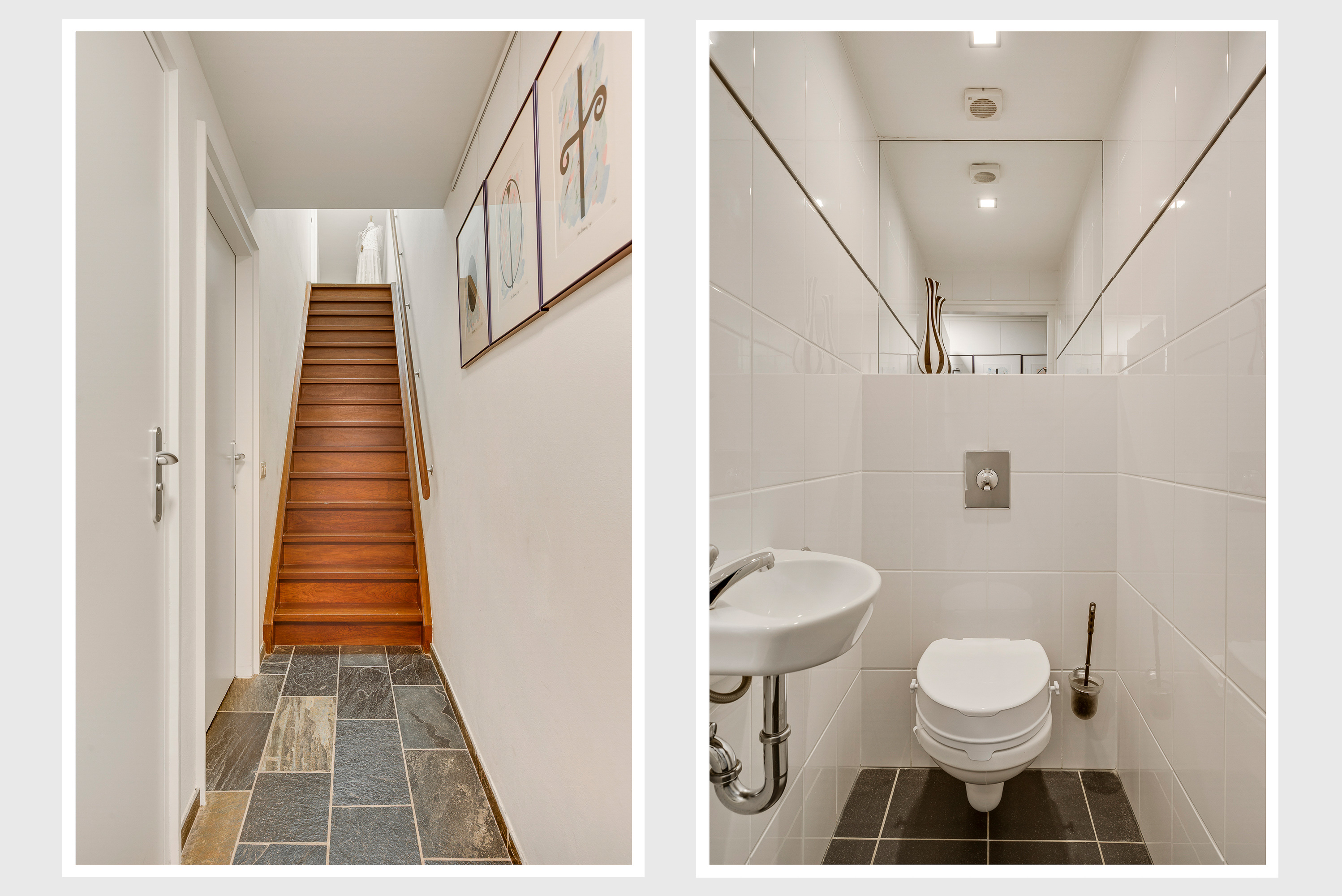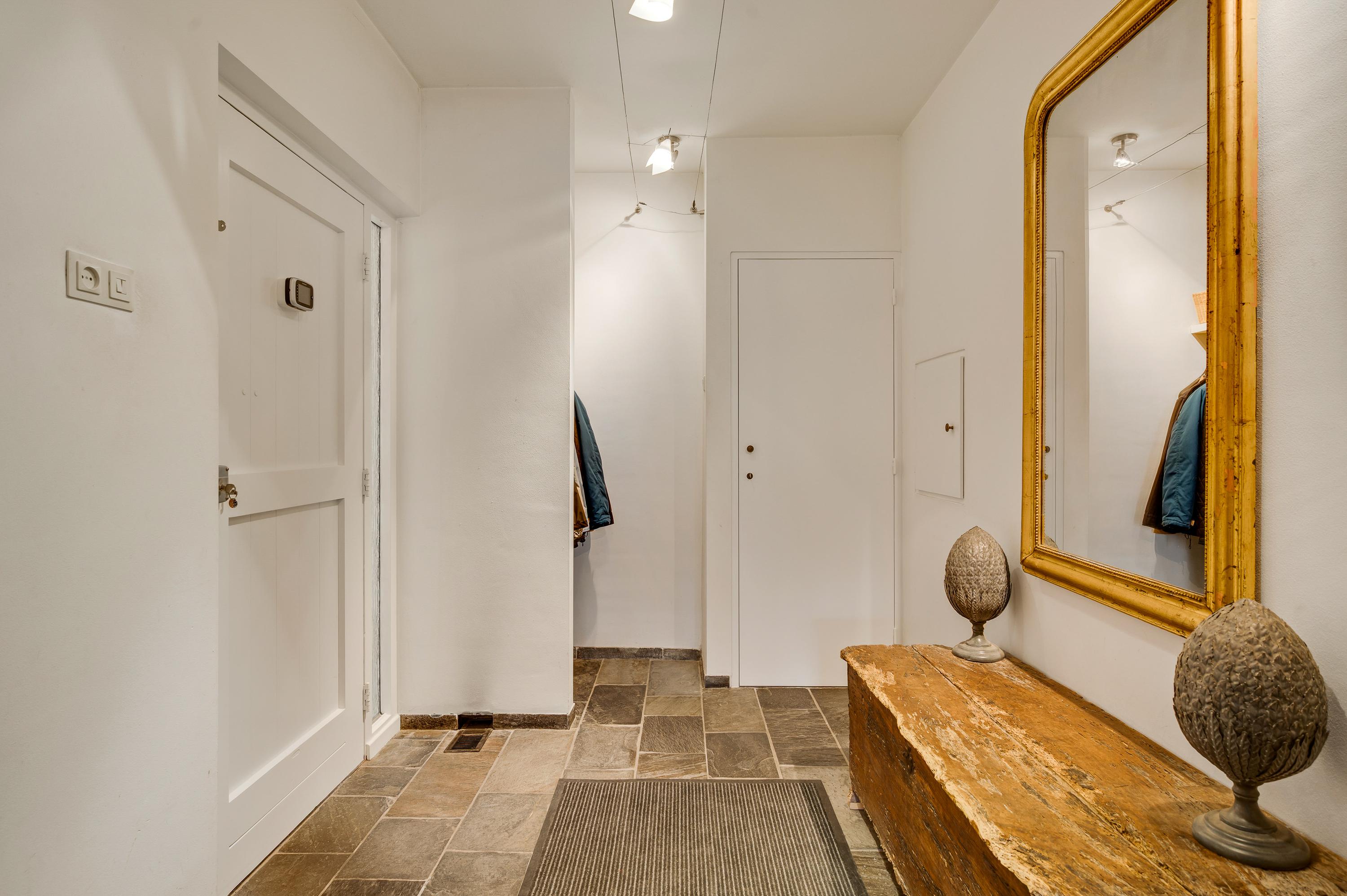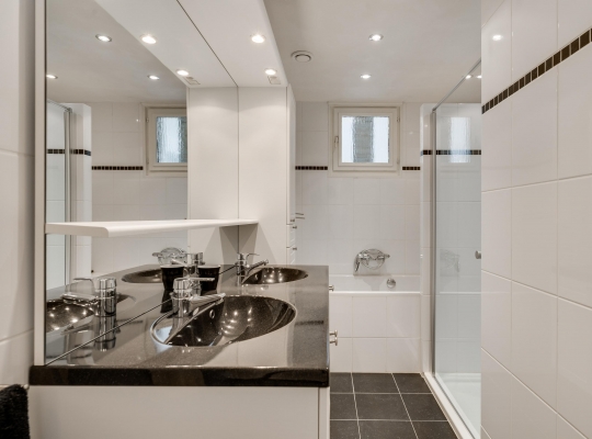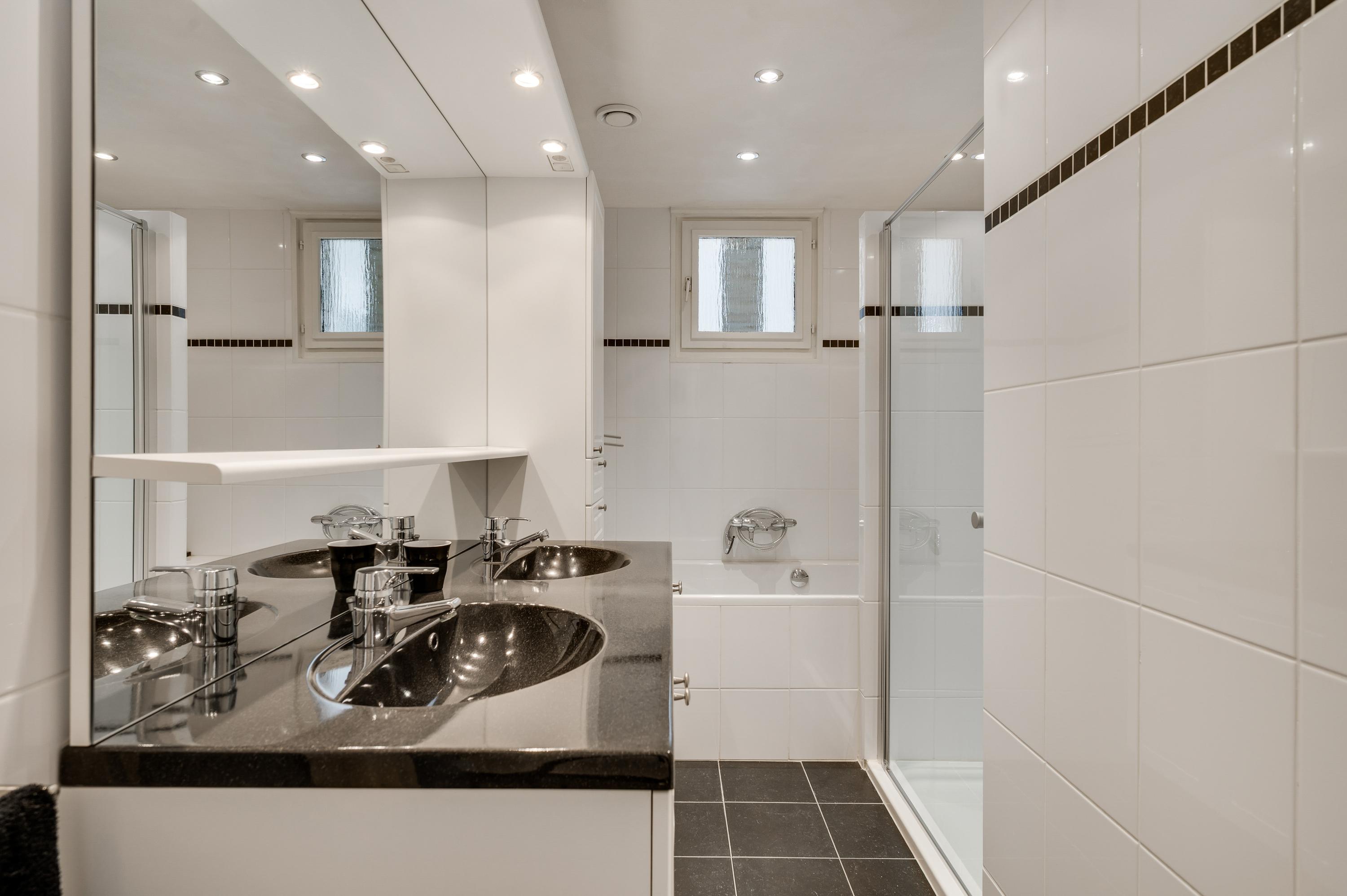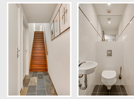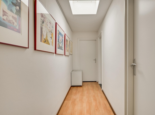 Een lange gang verbindt de woonkamer met de rest van de begane grond. Hier zijn de toiletruimte met fonteintje, twee slaapkamers en de badkamer. In de badkamer heeft u de beschikking over een ligbad, een aparte douche en een badmeubel met twee wastafels.