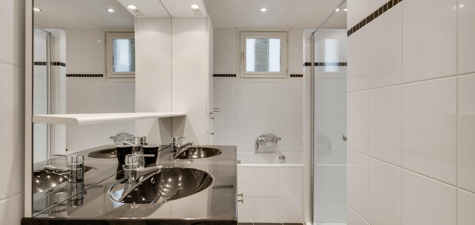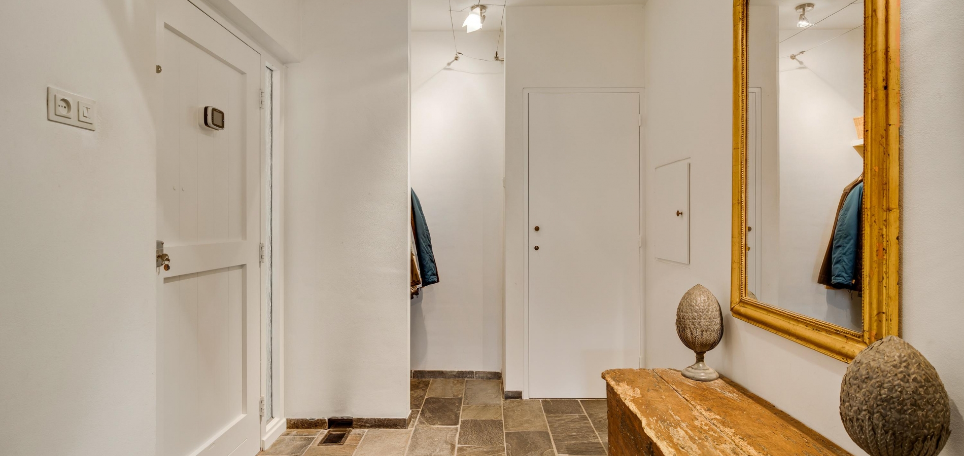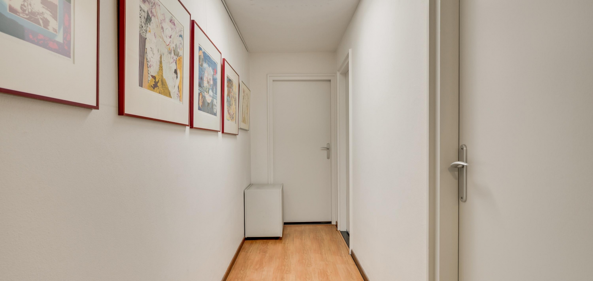 Een lange gang verbindt de woonkamer met de rest van de begane grond. Hier zijn de toiletruimte met fonteintje, twee slaapkamers en de badkamer. In de badkamer heeft u de beschikking over een ligbad, een aparte douche en een badmeubel met twee wastafels.