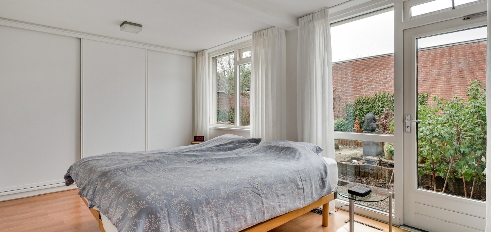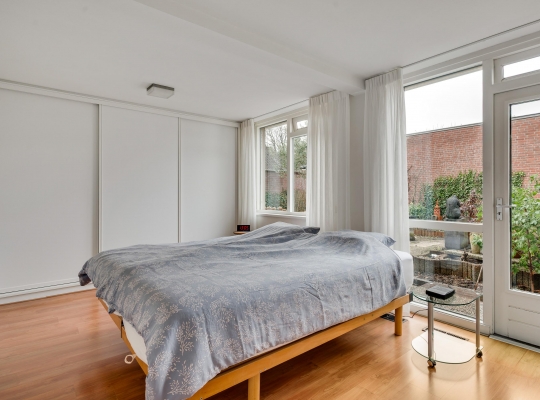 Naast de badkamer is slaapkamer I (circa 5,00 x 3,13) met een dubbele vaste kastenwand en een directe toegang tot de tuin. Ook slaapkamer II (circa 4,42 x 3,00) biedt toegang tot de tuin.