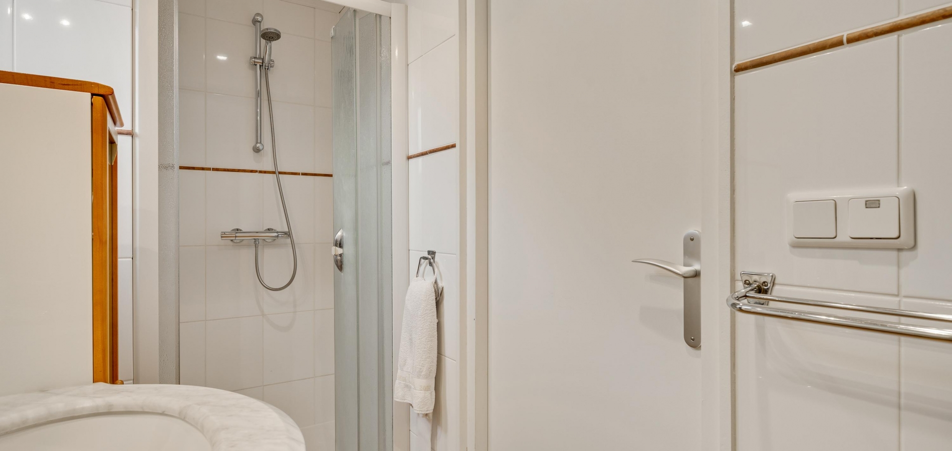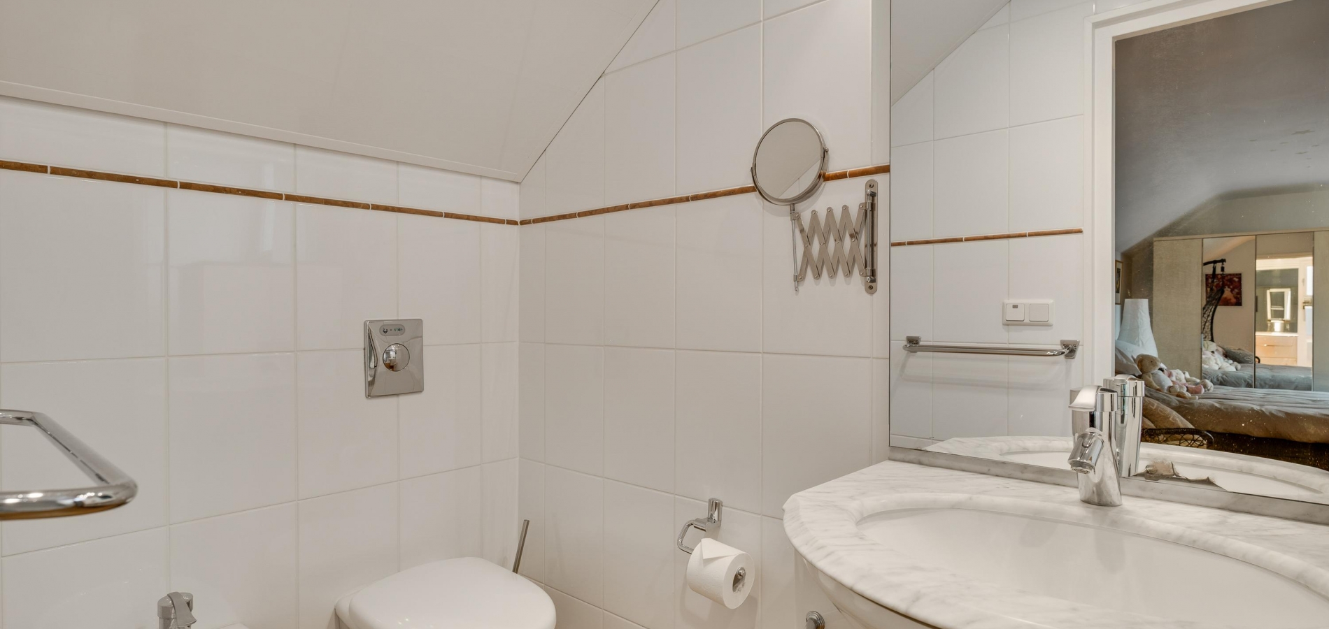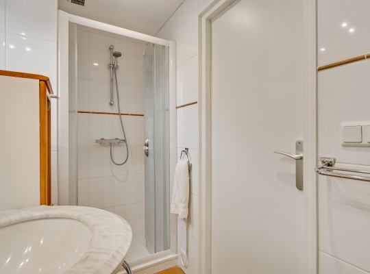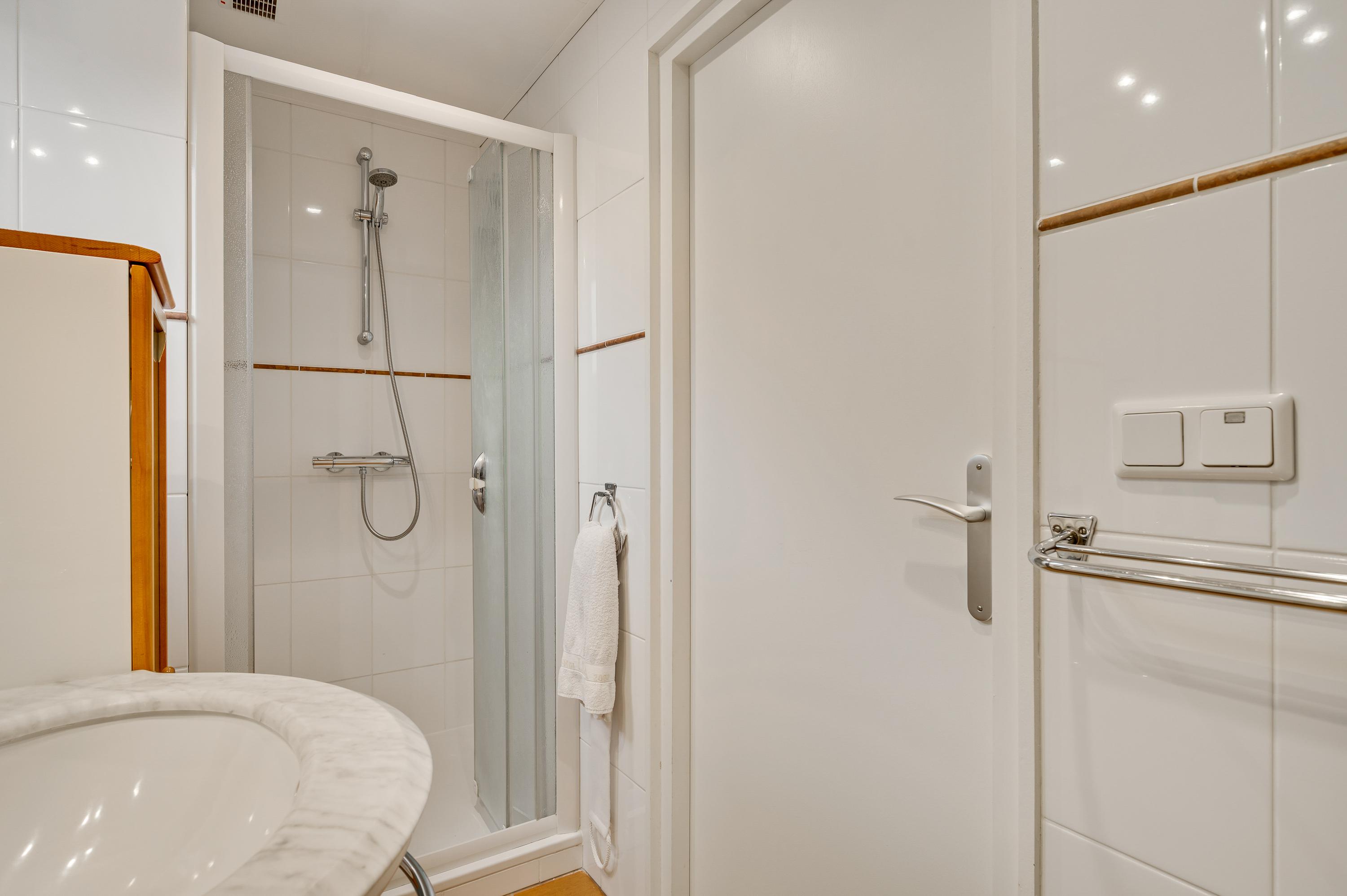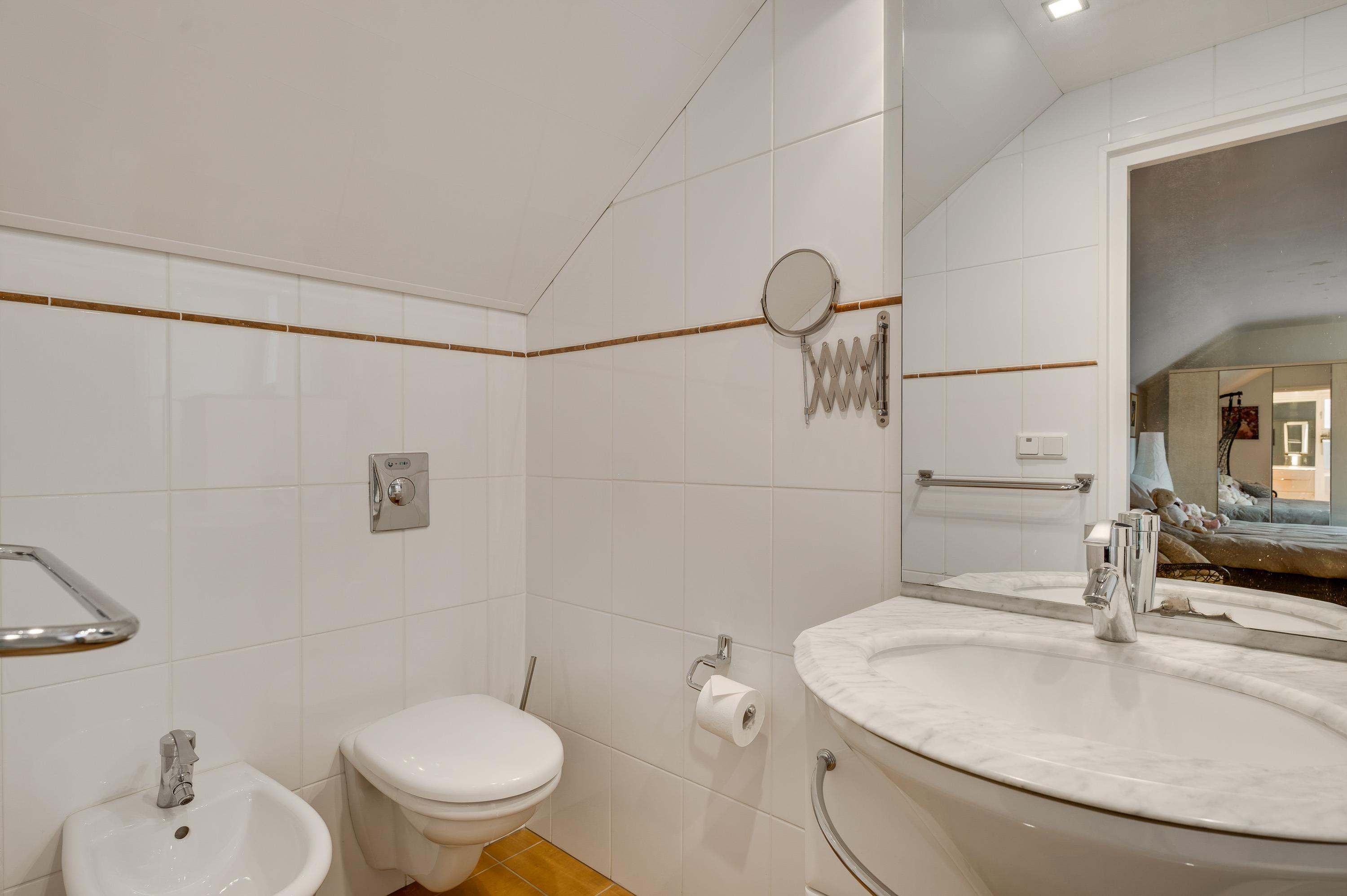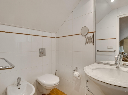 Vanuit de slaapkamer is er ook toegang tot badkamer II (circa 3,30 x 1,25), ingedeeld met een douche, wastafel, toilet en een bidet. Perfect voor een thuiswonende zoon of dochter of voor de (klein)kinderen die komen logeren.