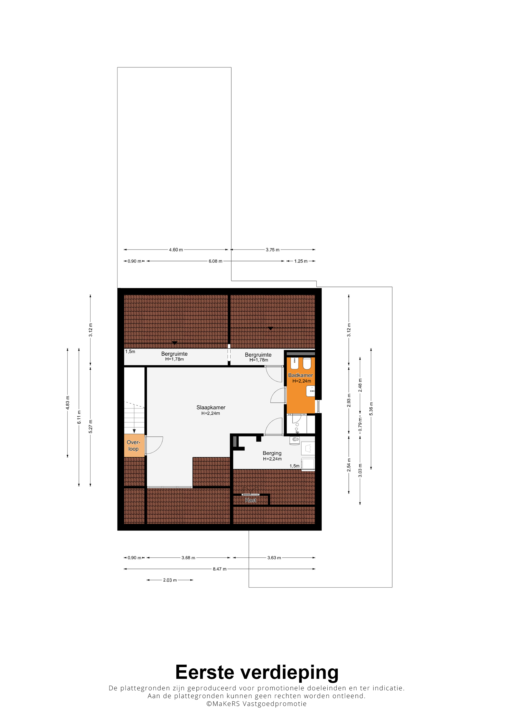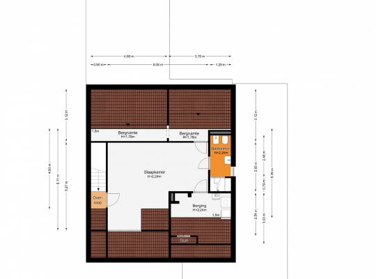 Aan het einde van de trap is een kleine overloop, die toegang biedt tot slaapkamer III (circa 6,08 x 5,27/2,93) met een dakkapel aan de voorzijde. Er zijn twee bergingen aan de achterzijde en aan de voorzijde is een berging/wasruimte (circa 3,63 x 3,03).