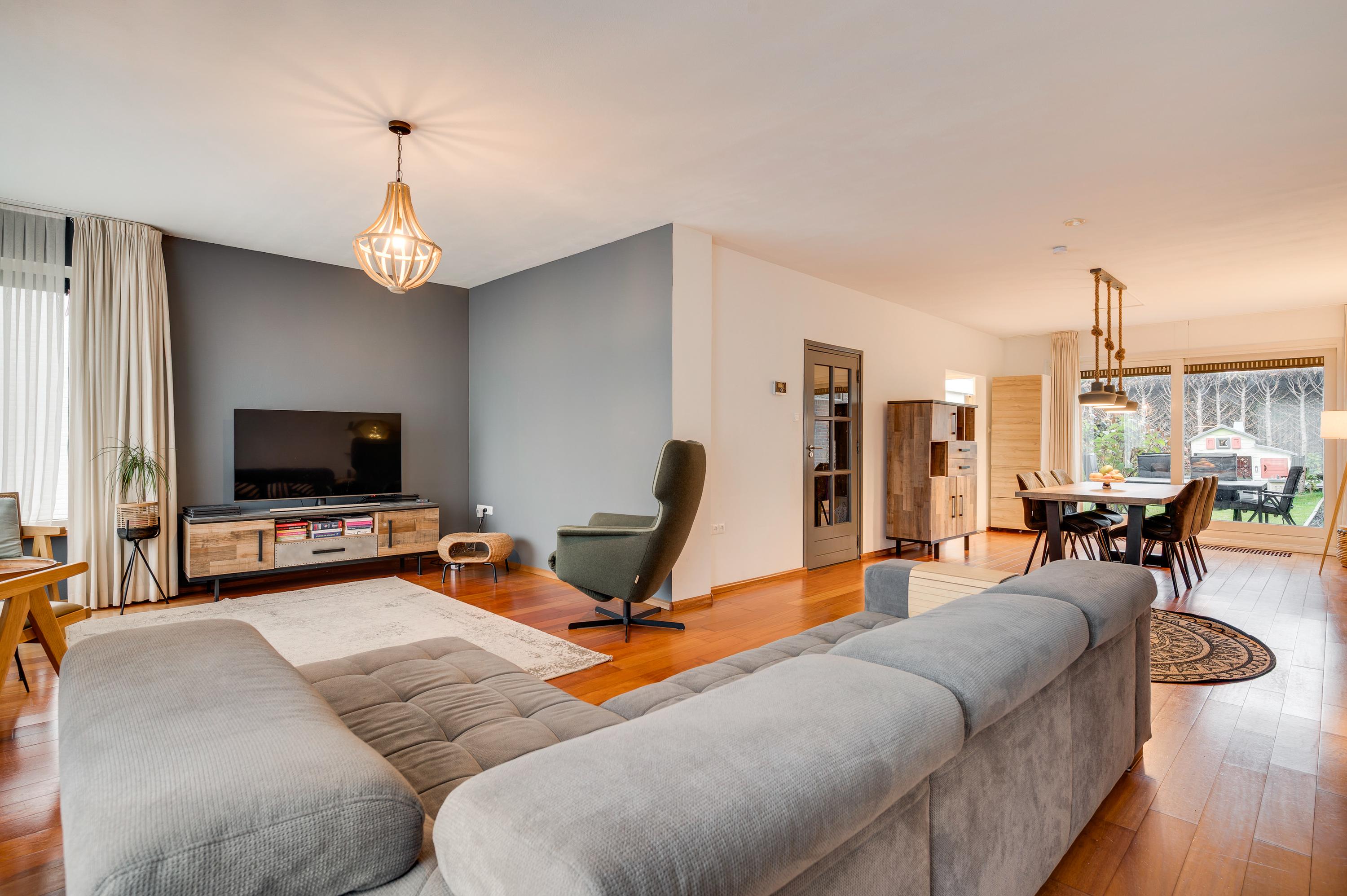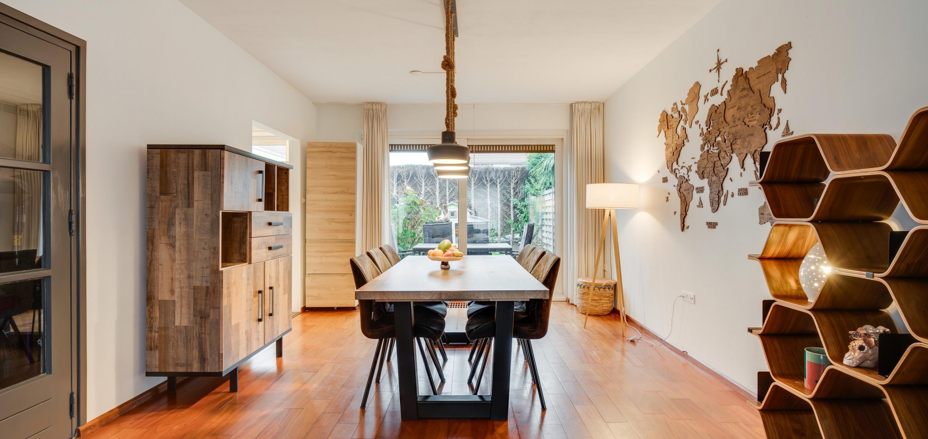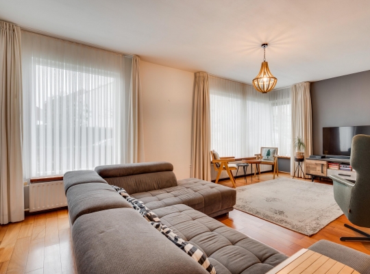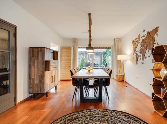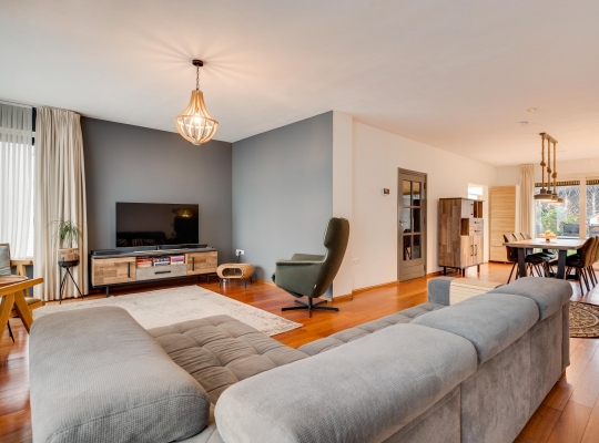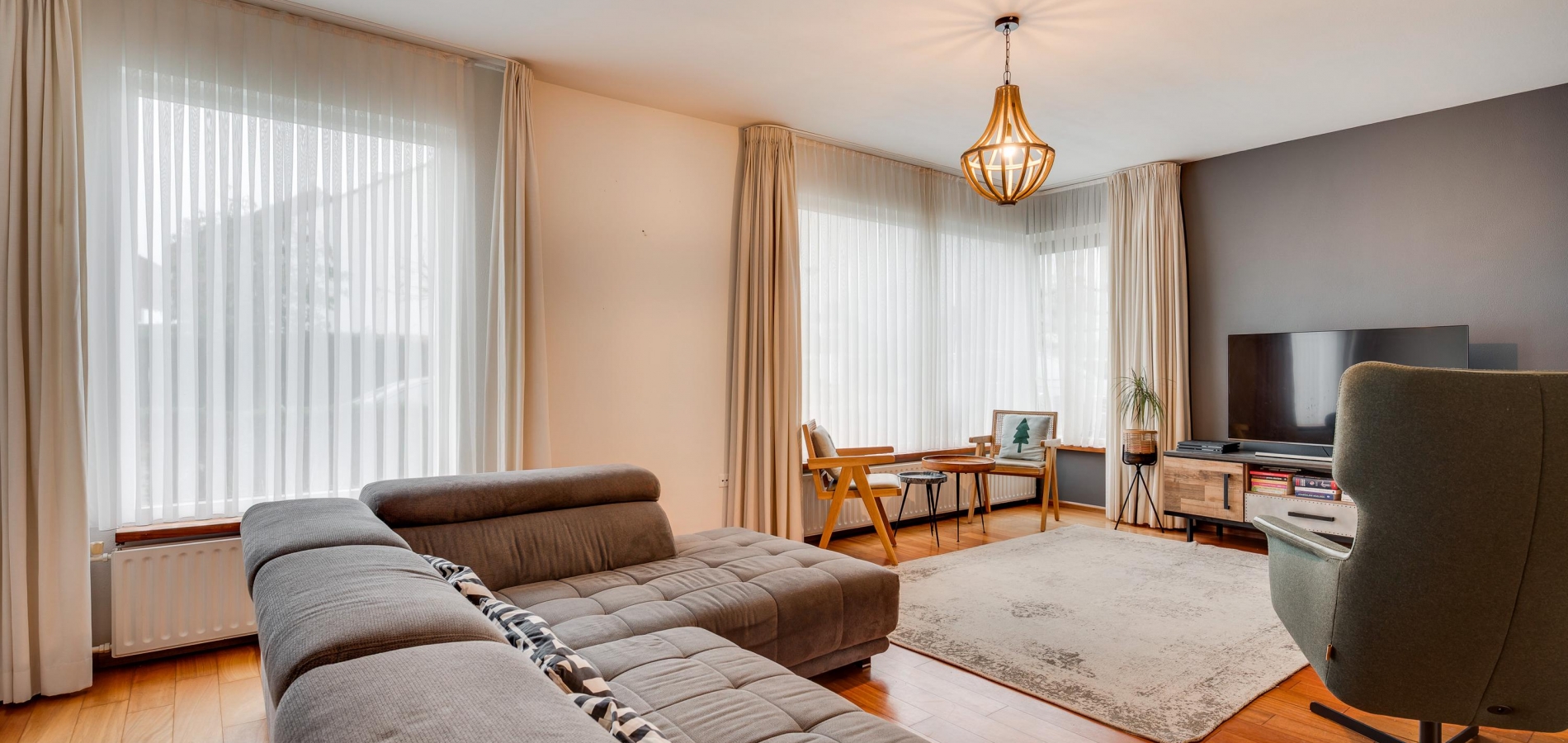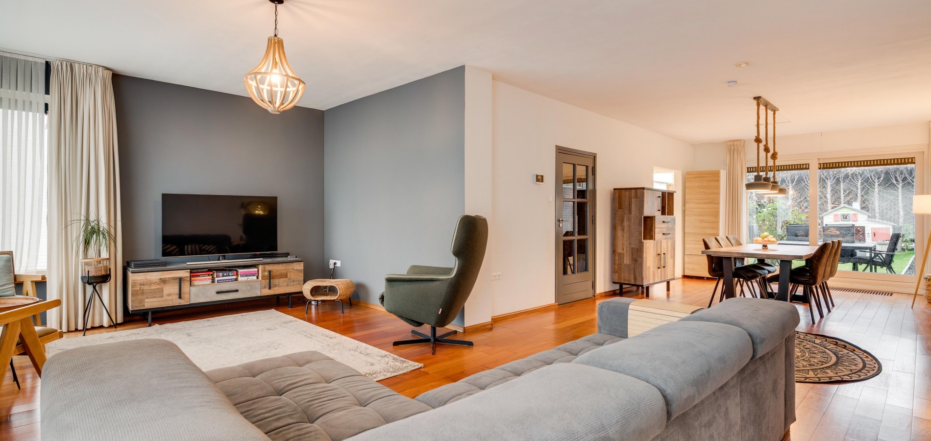 In de L-vormige woonkamer (circa 50 m2) ligt een parketvloer, die goed past bij de kleuren op de wanden. Het circa 6.50 meter brede zitgedeelte is aan de voorzijde en het eetgedeelte grenst aan de keuken. Een grote schuifpui zorgt voor een optimale verbinding met de achtertuin.