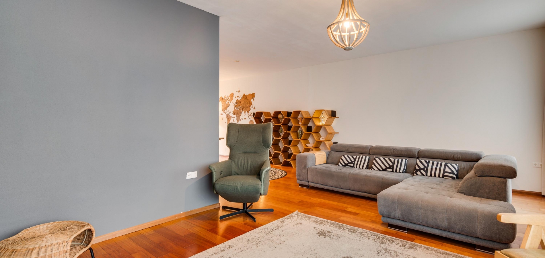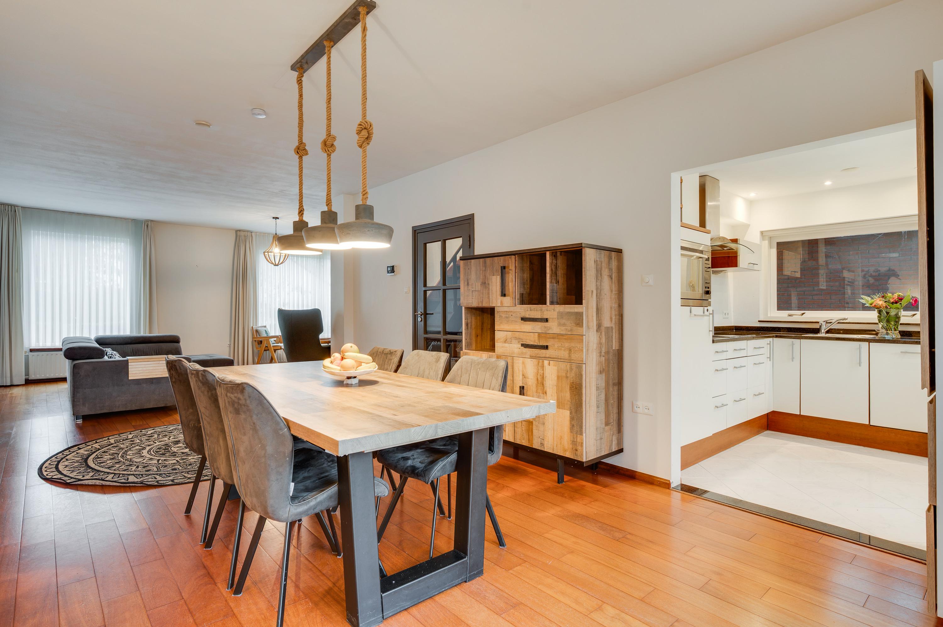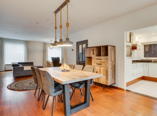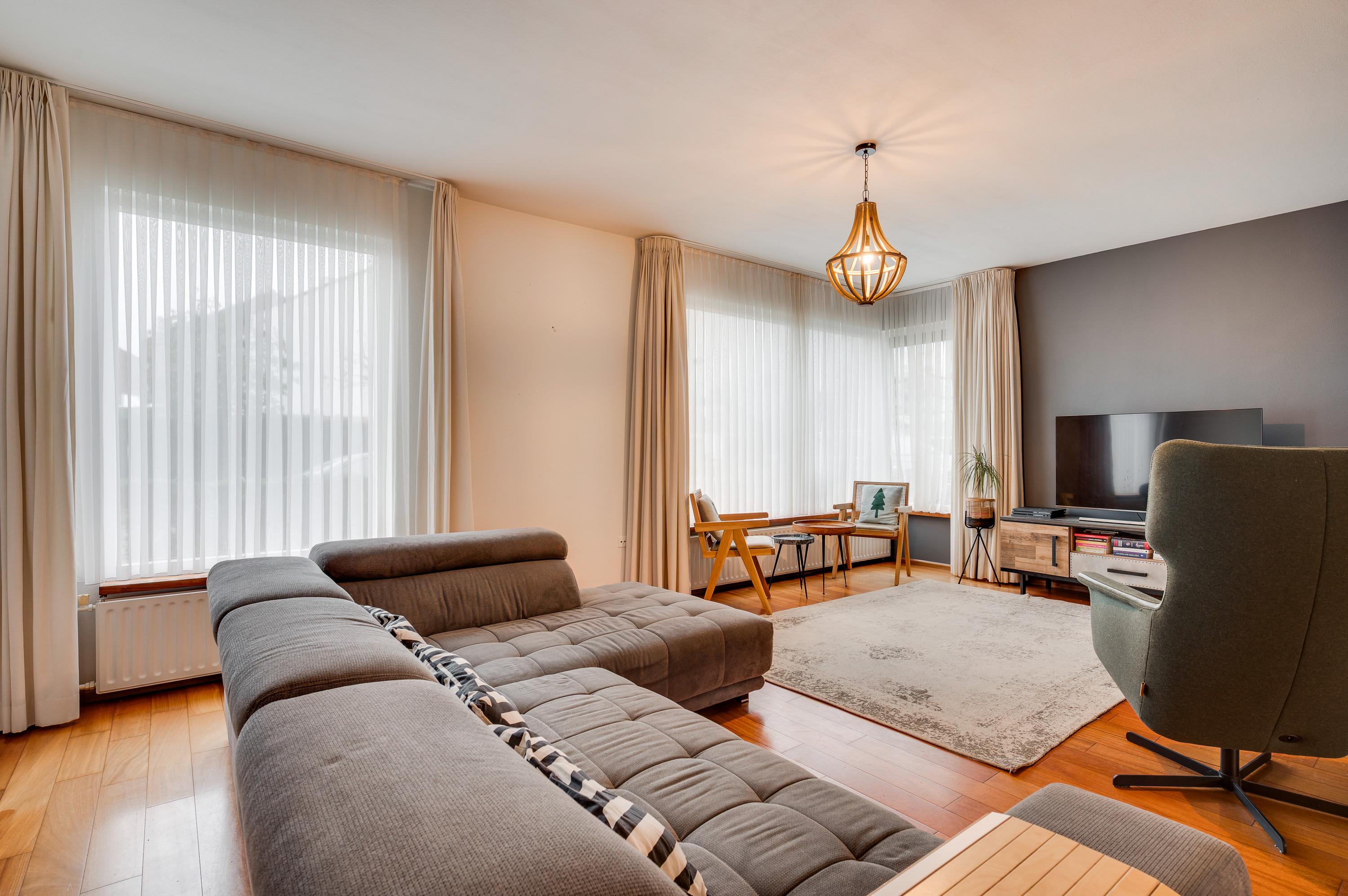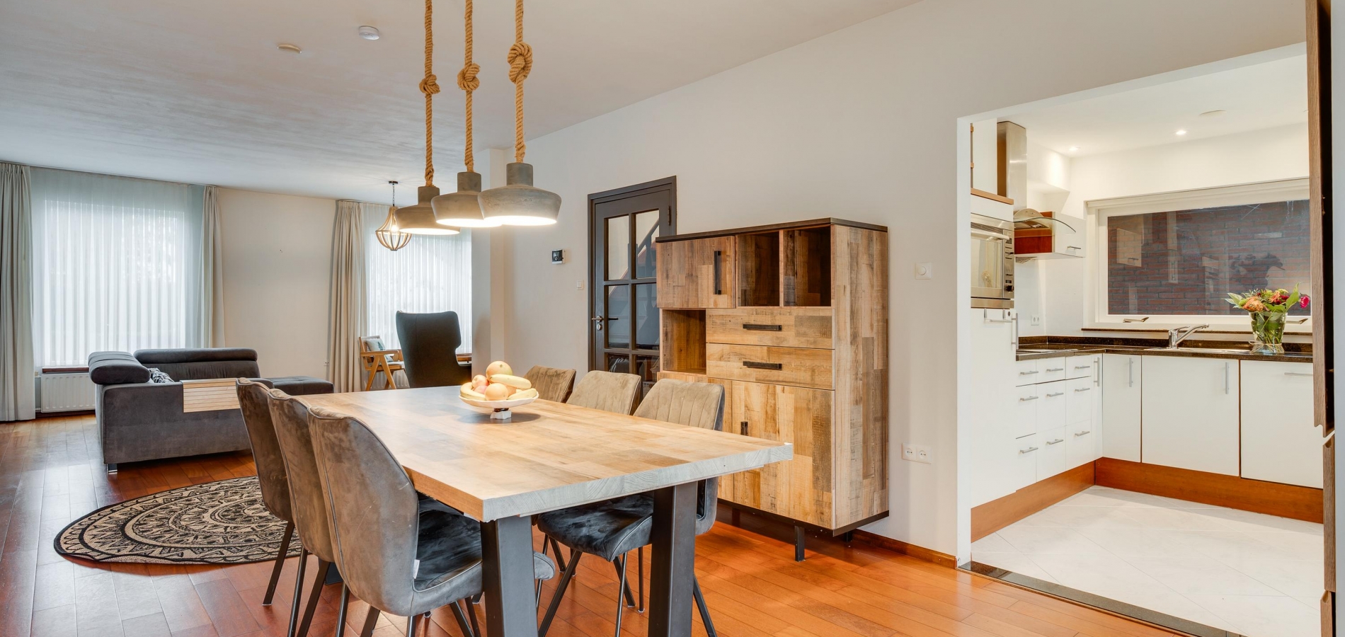 In de L-vormige woonkamer (circa 50 m2) ligt een parketvloer, die goed past bij de kleuren op de wanden. Het circa 6.50 meter brede zitgedeelte is aan de voorzijde en het eetgedeelte grenst aan de keuken. Een grote schuifpui zorgt voor een optimale verbinding met de achtertuin.