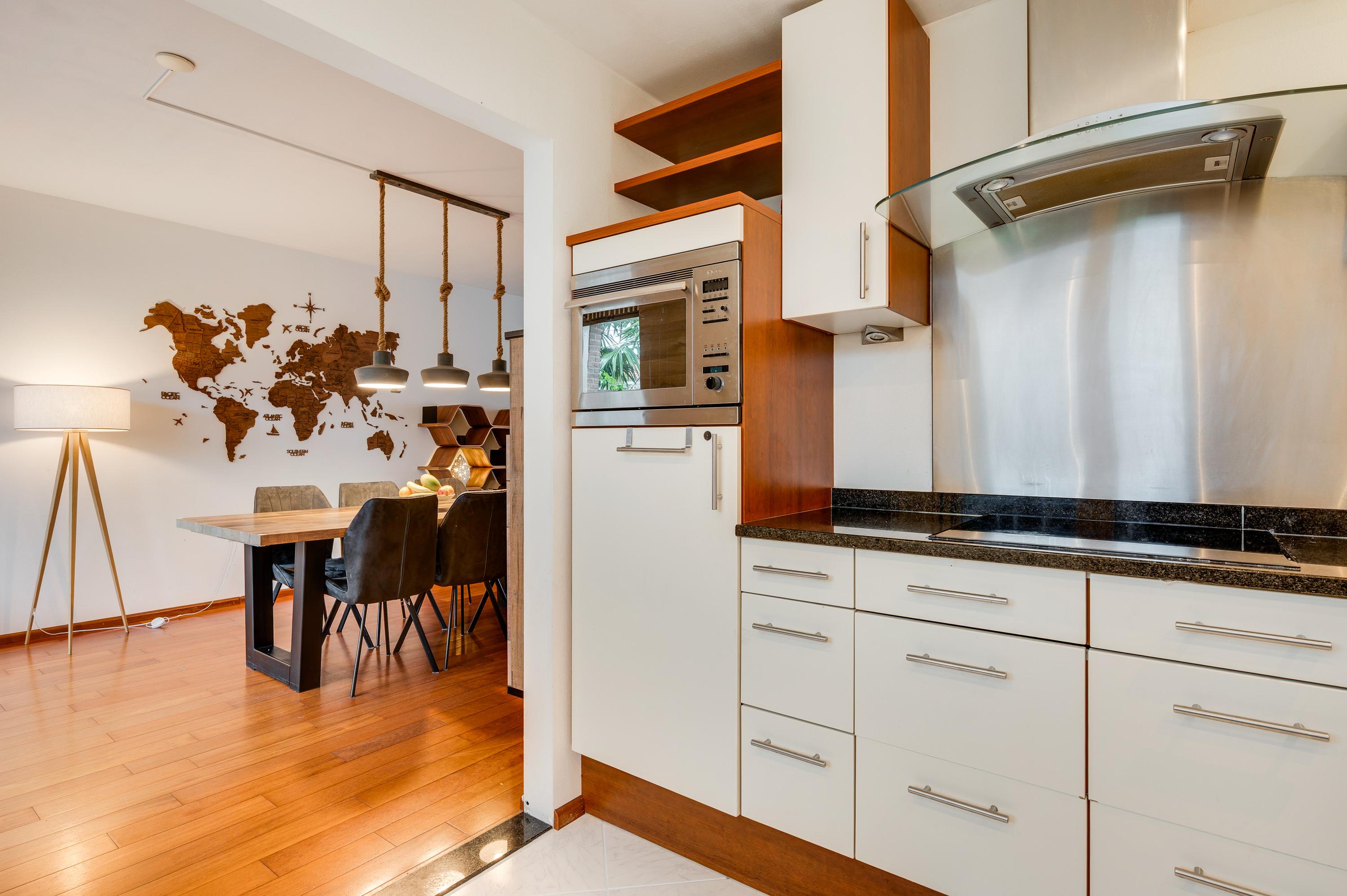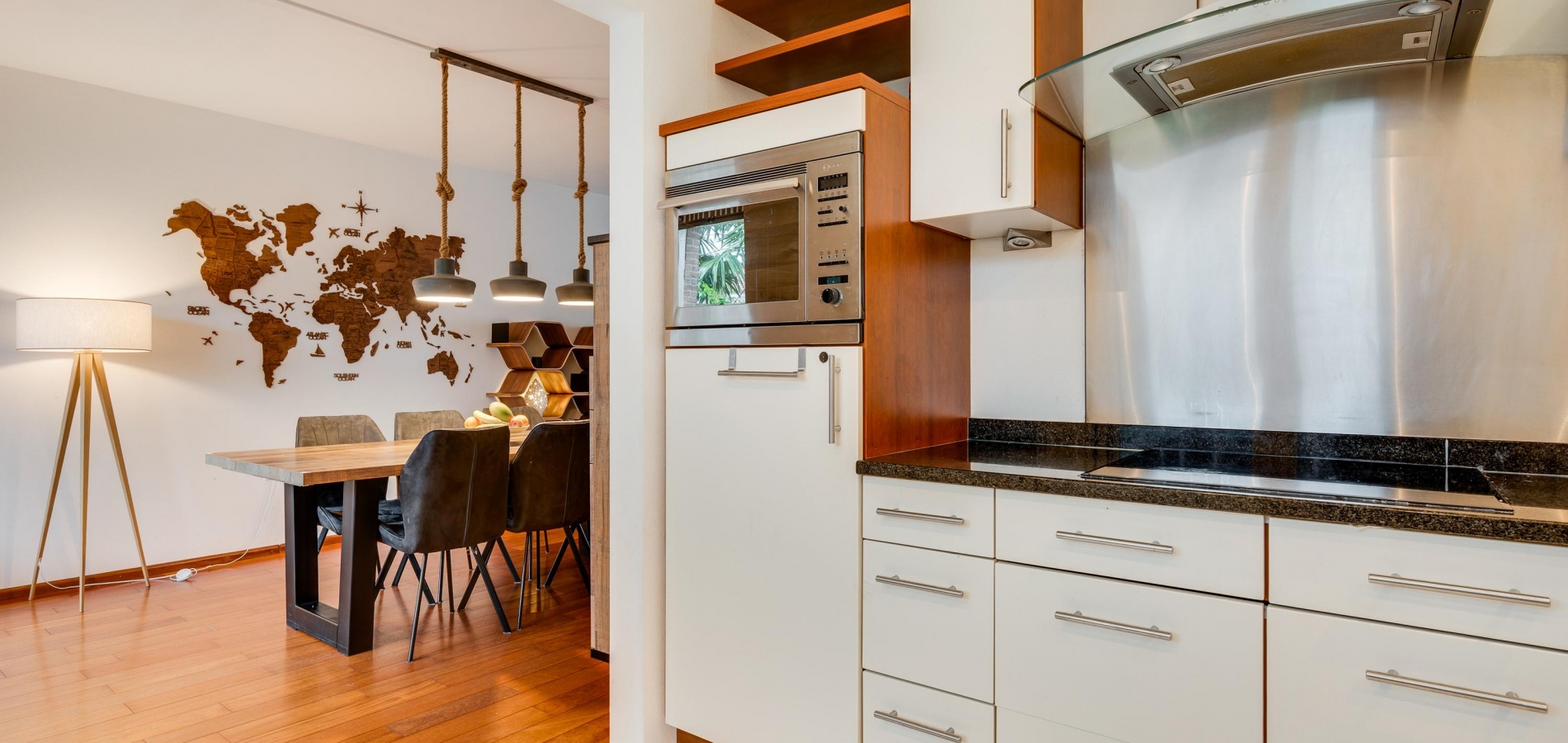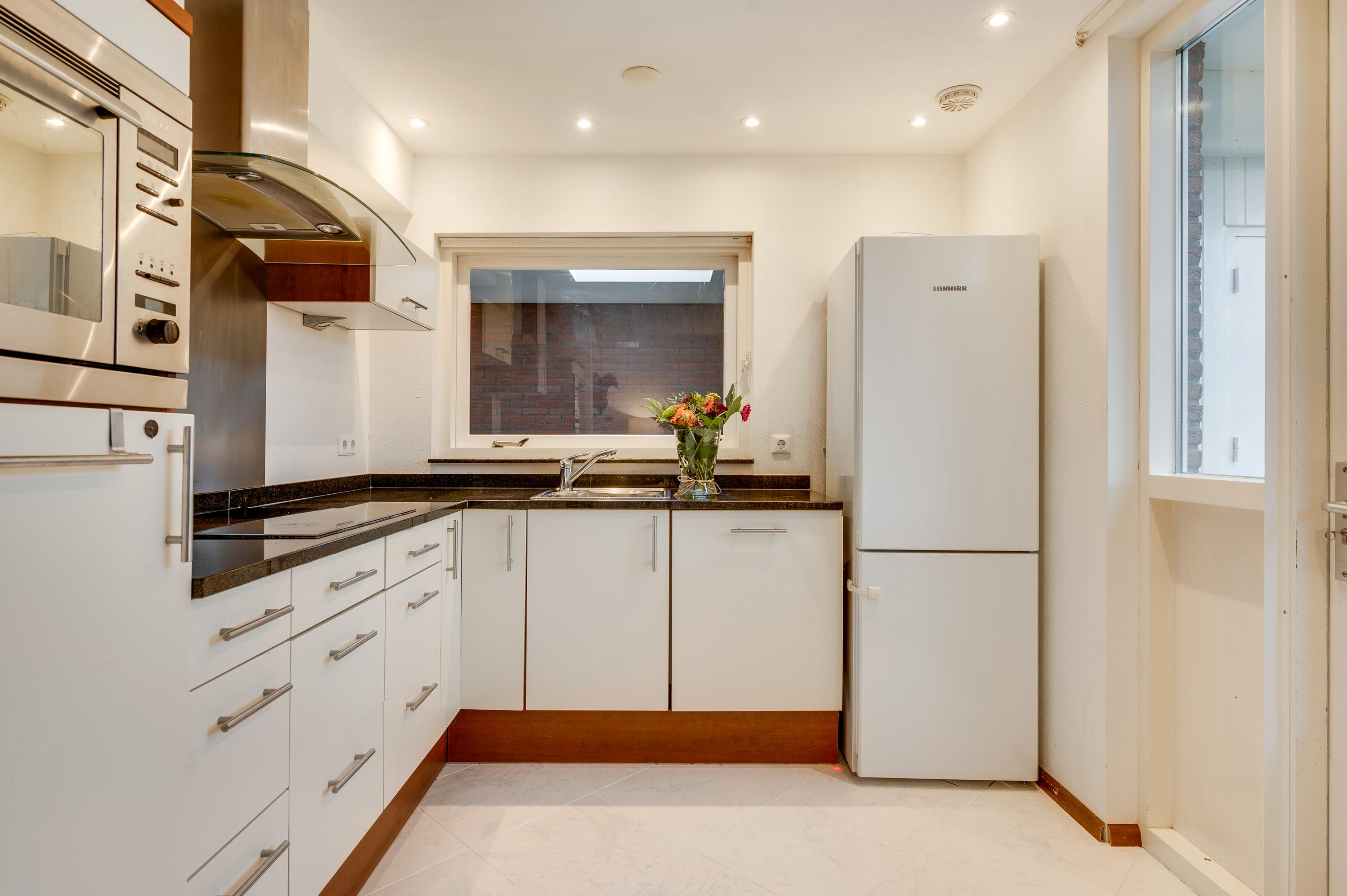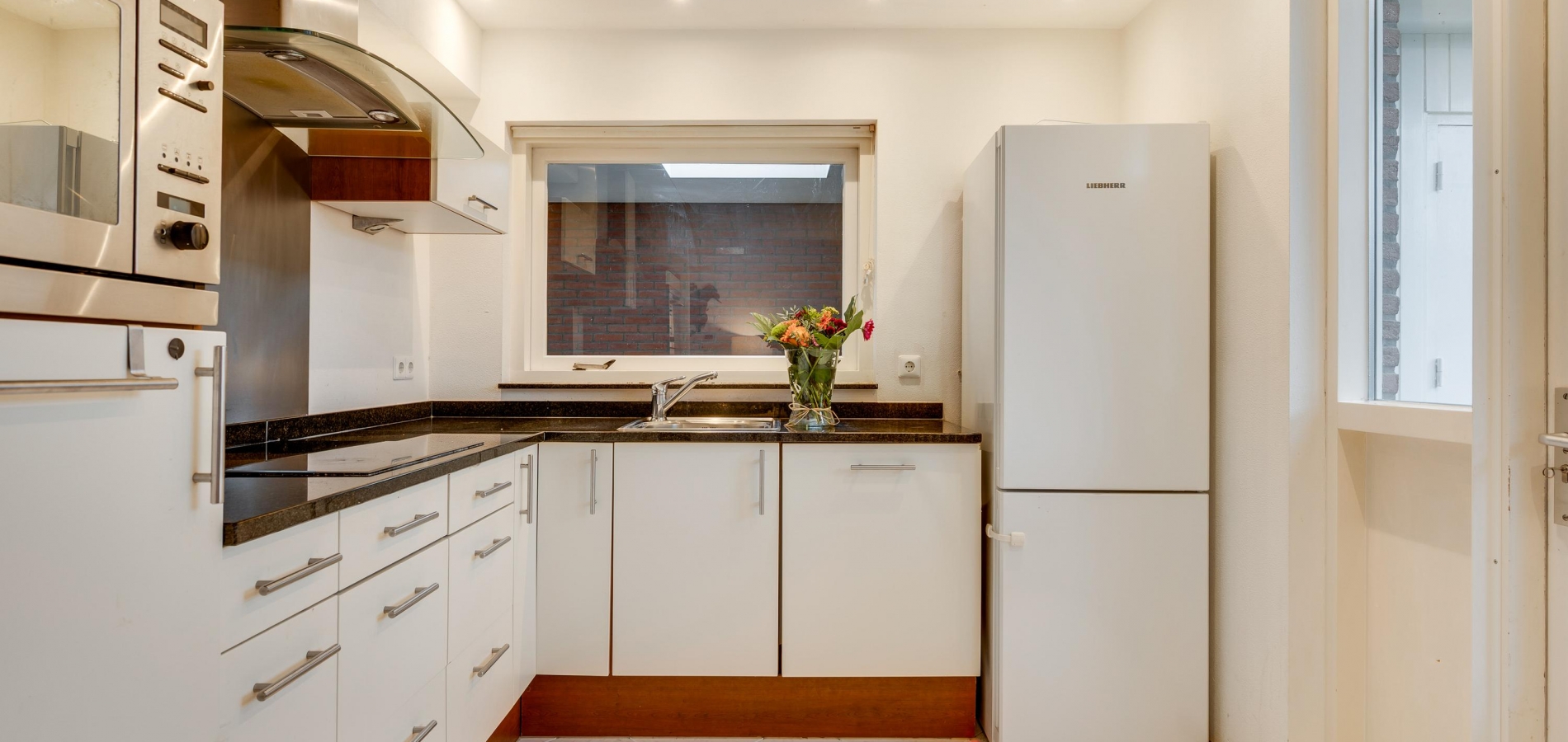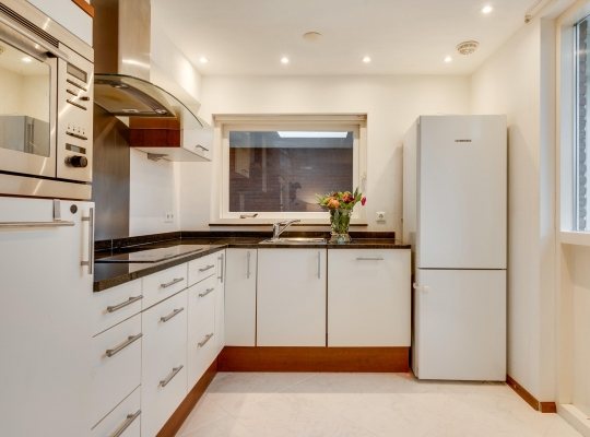 Uw oog valt op de keuken, waar een lichte hoekopstelling met een granieten aanrechtblad staat. Deze keuken heeft een ingebouwde keramische kookplaat, afzuigkap, oven en een vaatwasser. Er is lichtinval aan twee zijden, wat de keuken heel ruimtelijk maakt.