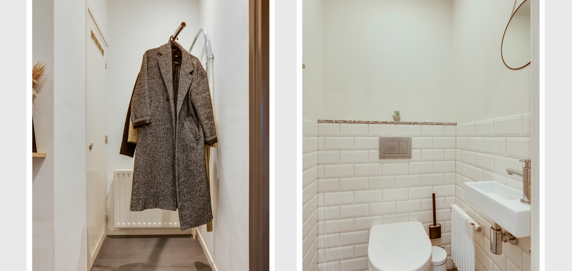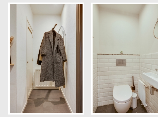 Onder de carport is de entree van deze goed onderhouden, fraaie woning. In de hal zijn de meterkast en de toiletruimte, ingedeeld met een wandcloset en een fonteintje. Fraaie elementen zijn het stucwerk, de lichte tegelvloer en de fraaie trappen naar het souterrain en de eerste verdieping.