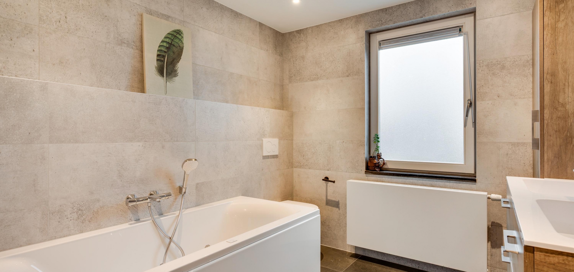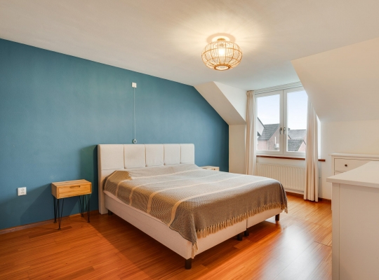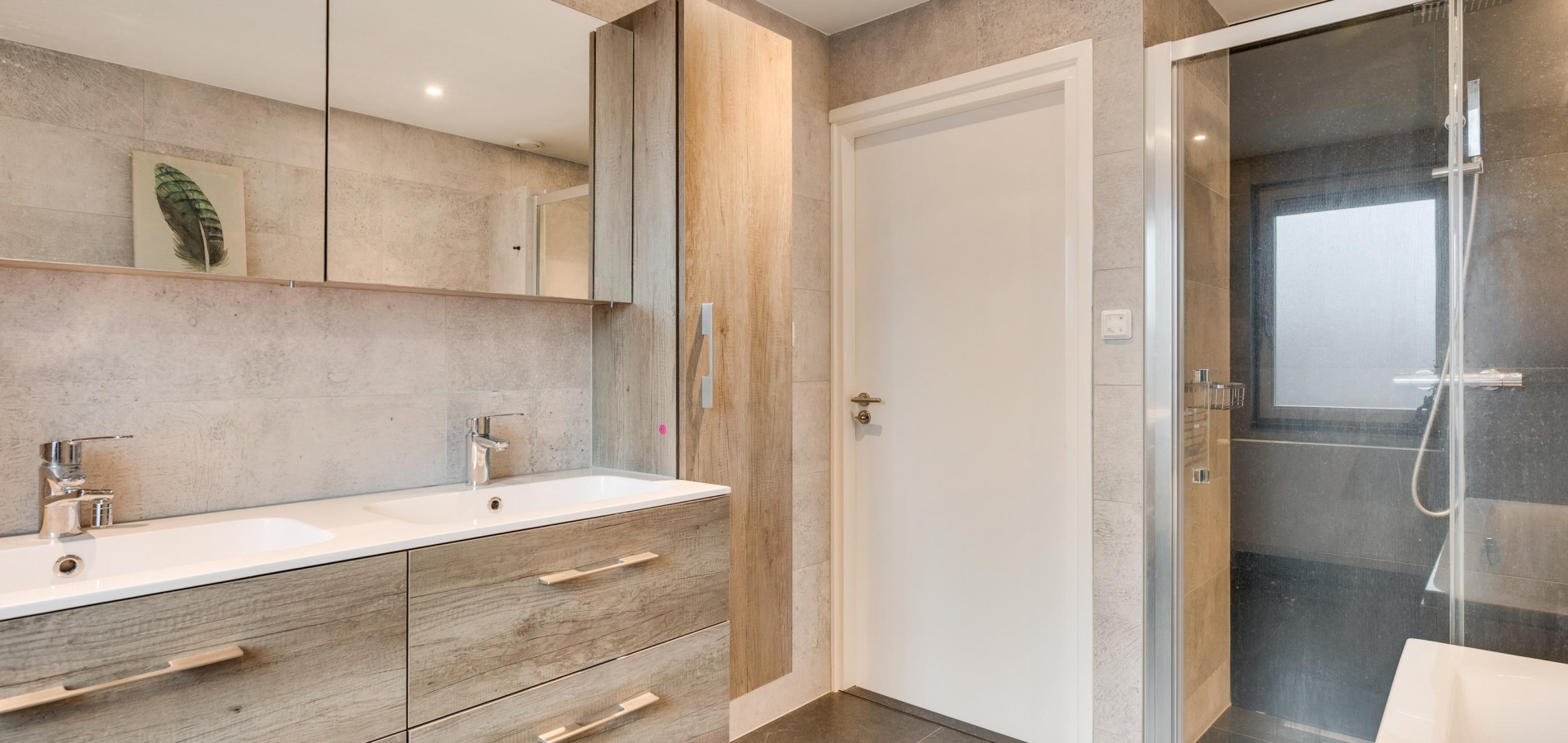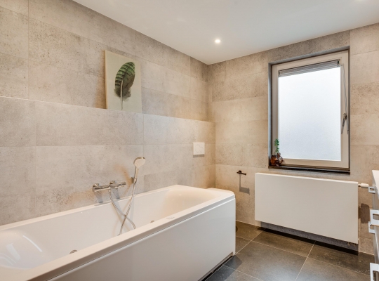 De moderne badkamer (circa 3,92 x 3,75) heeft een fraaie afwerking, met betongrijze wandtegels en donkere tegels op de vloer. U heeft niet alleen de beschikking over een inloopdouche, maar er staat ook een whirlpoolbad. Verder zijn er een tweede toilet en een badmeubel met twee wastafels in de badkamer. Vier lades, een hoge kast en een dubbele spiegelkast bieden een grote hoeveelheid bergruimte.
