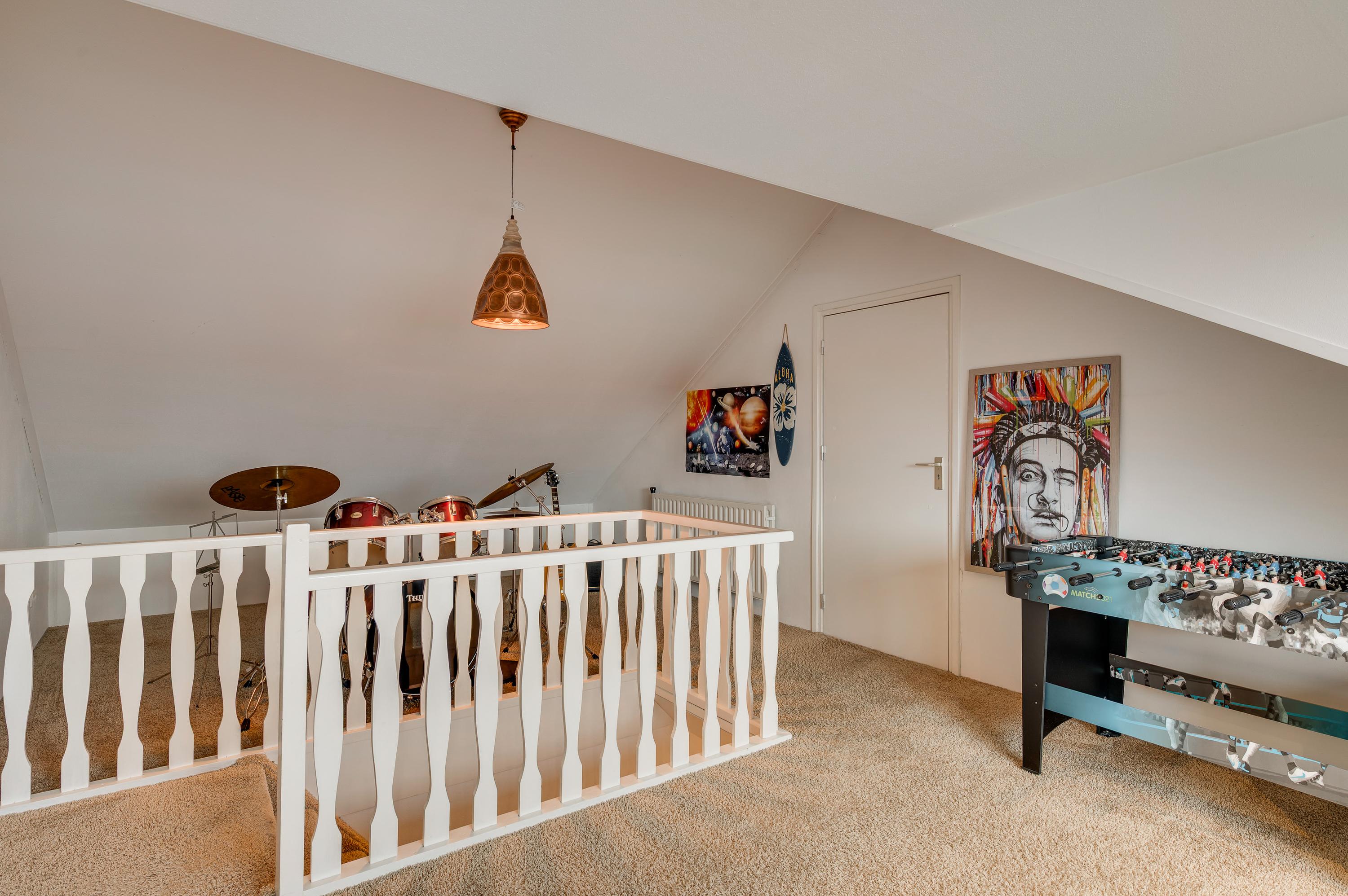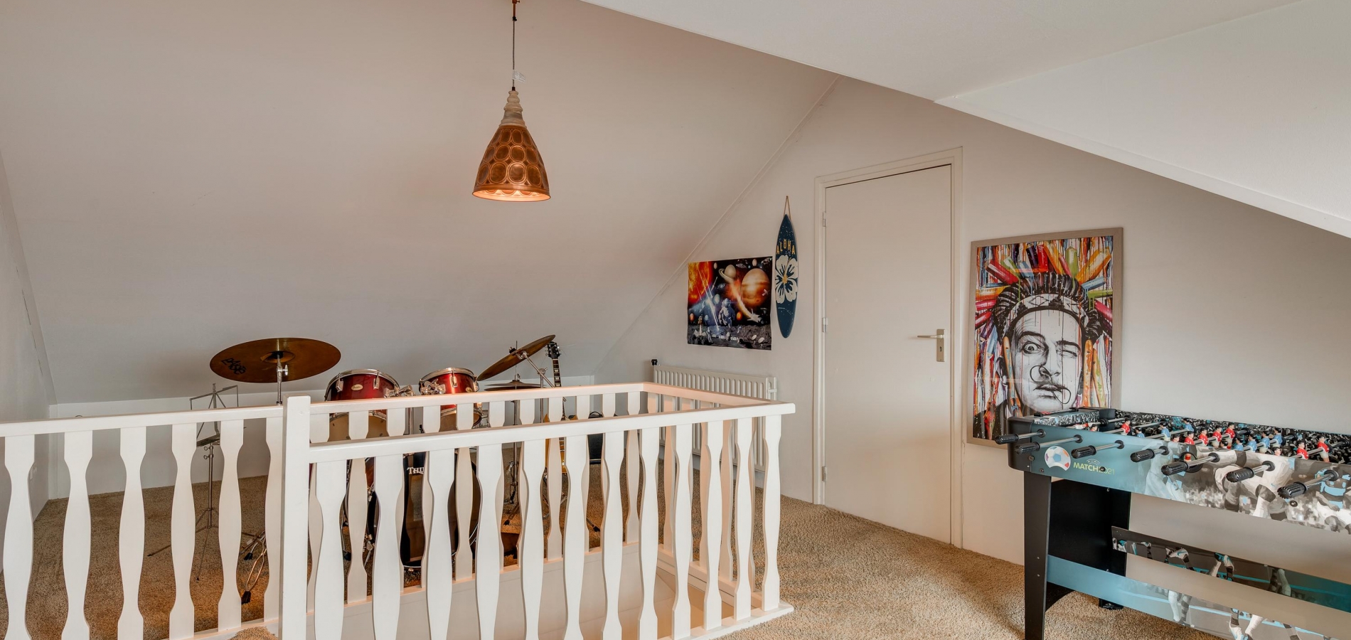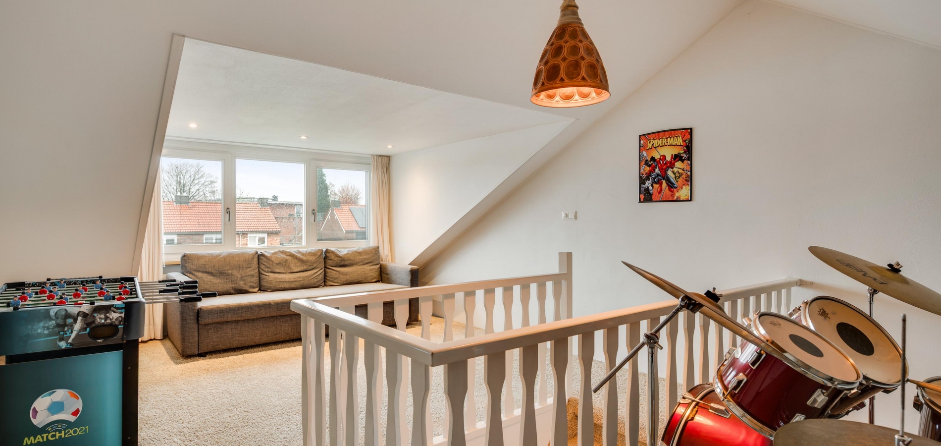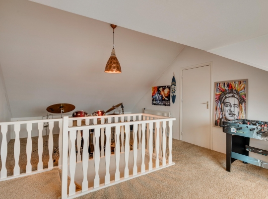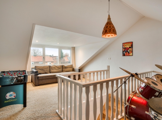 Het raam in de zijgevel zorgt voor veel lichtinval bij de trap en op de overloop. Vanaf hier is er toegang tot drie slaapkamers en de badkamer. Op een groot deel van deze verdieping ligt laminaat op de vloer en het geheel maakt een goede indruk.