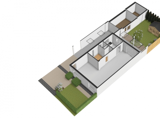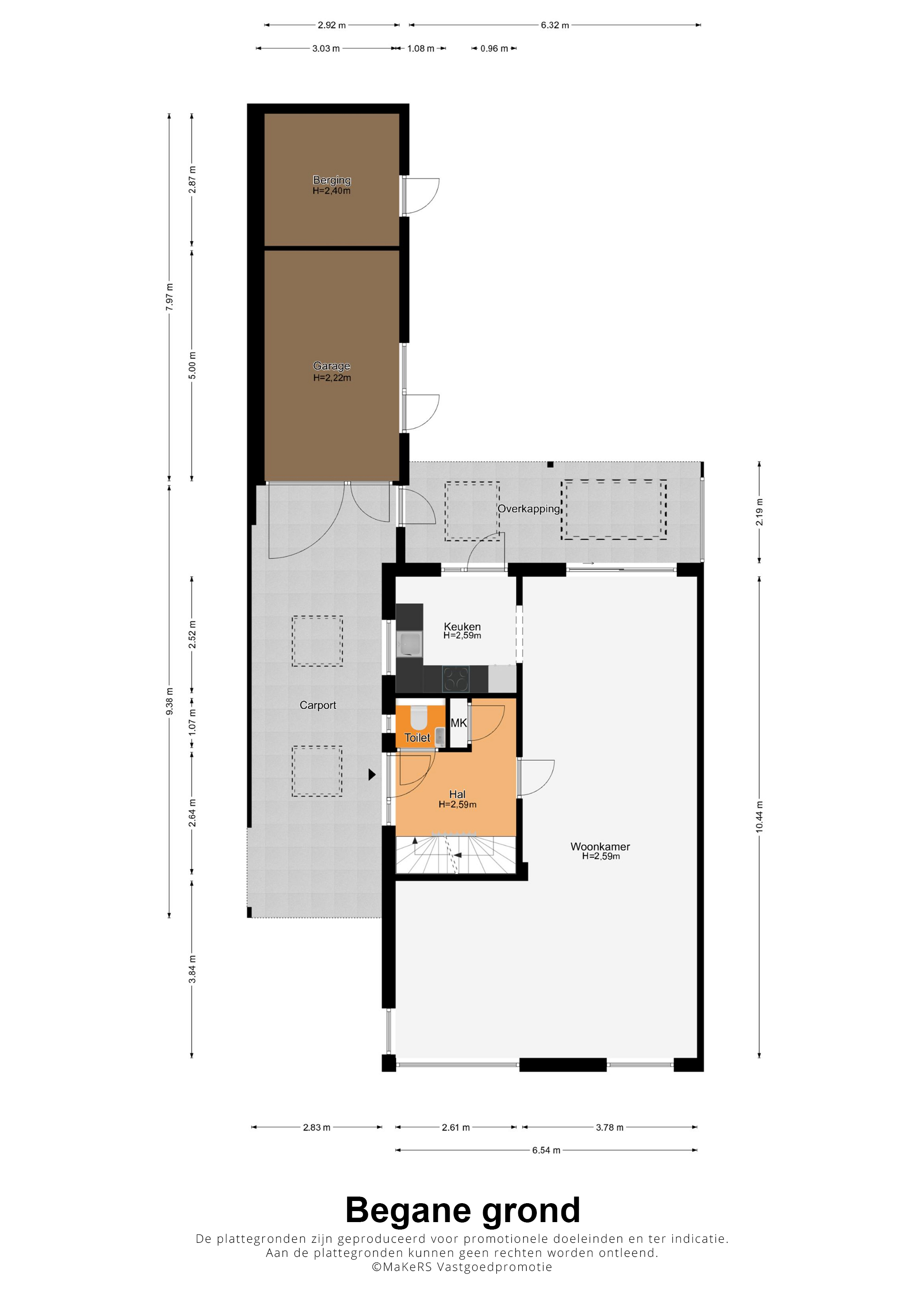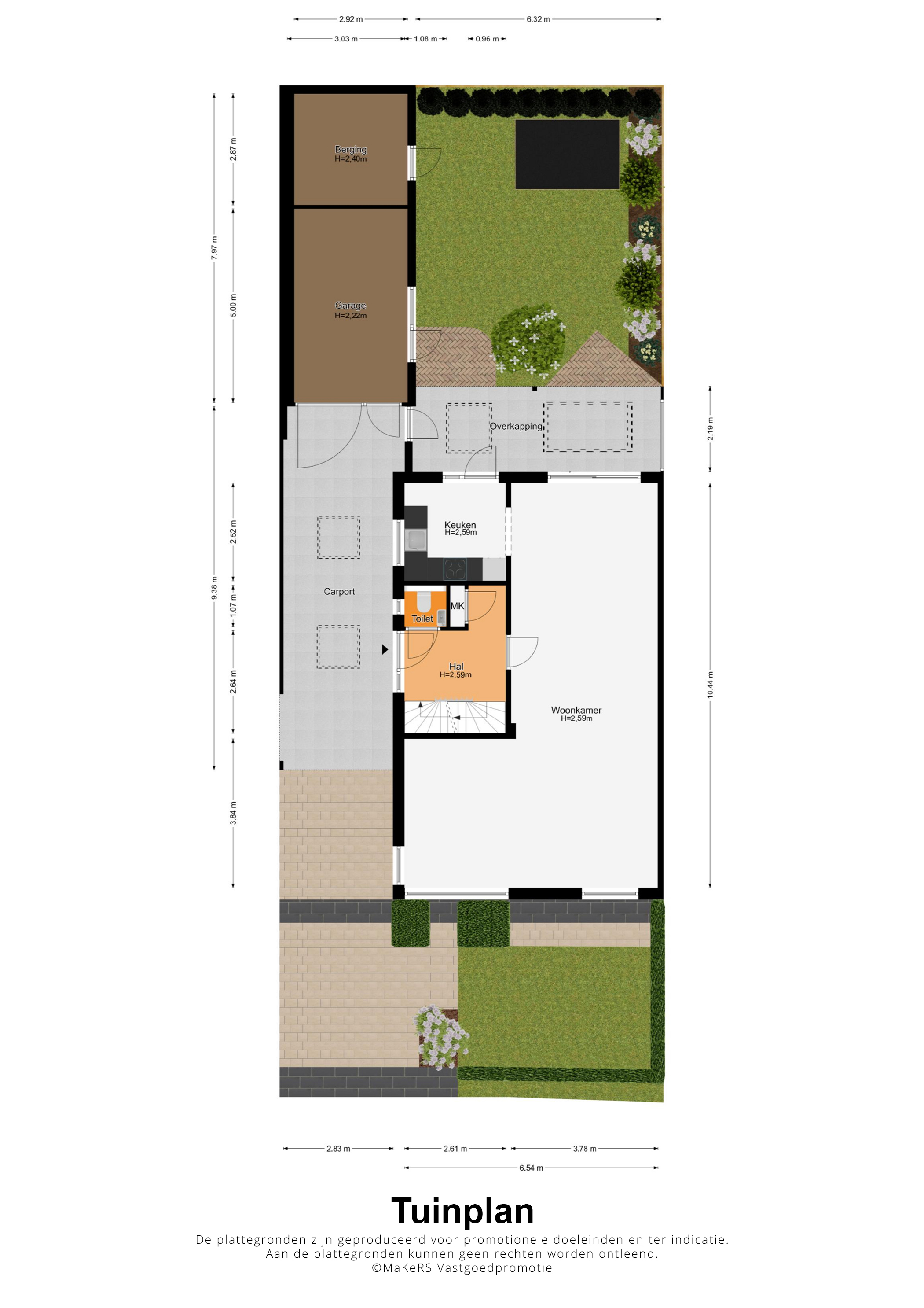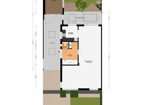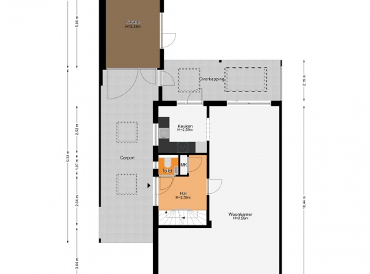 Naast de keuken is de carport, met twee lichtkoepels en een deur naar de tuin. In het verlengde van de carport is de garage (circa 5,00 x 2,92), voor de auto en de fietsen. Ook is er een berging (circa 2,87 x 2,92), voor het tuingereedschap en andere spullen.