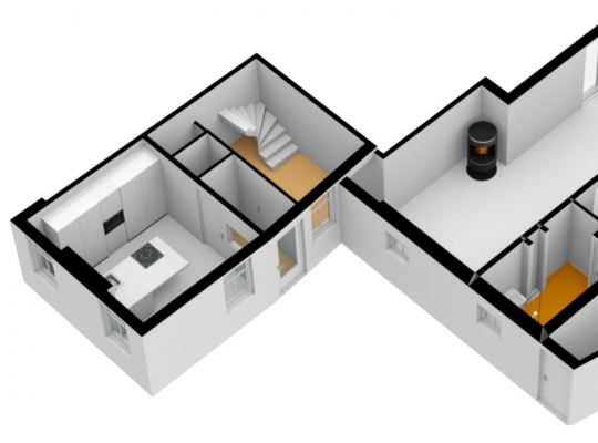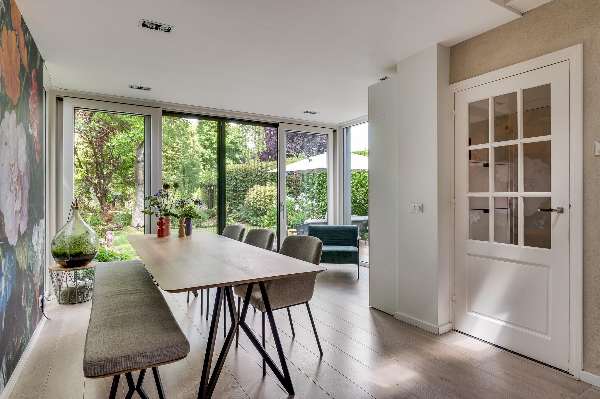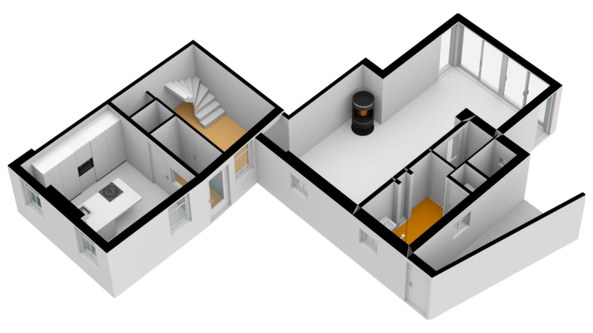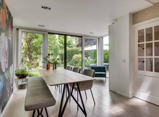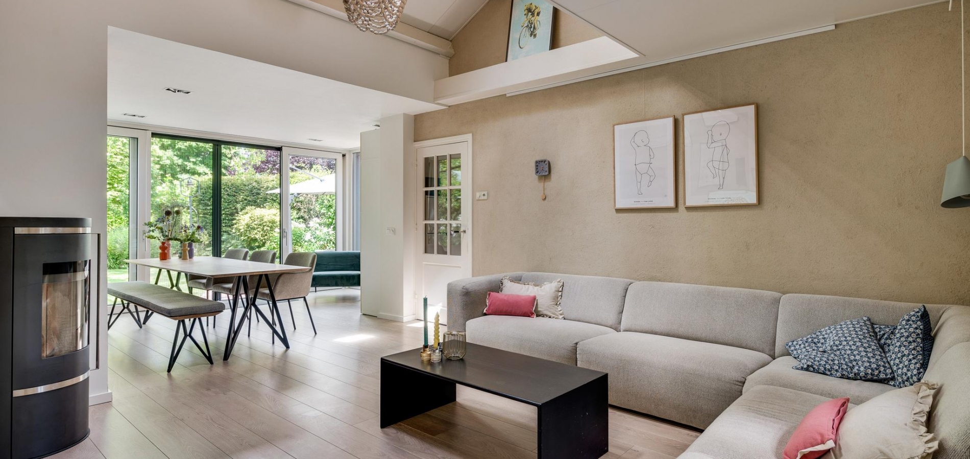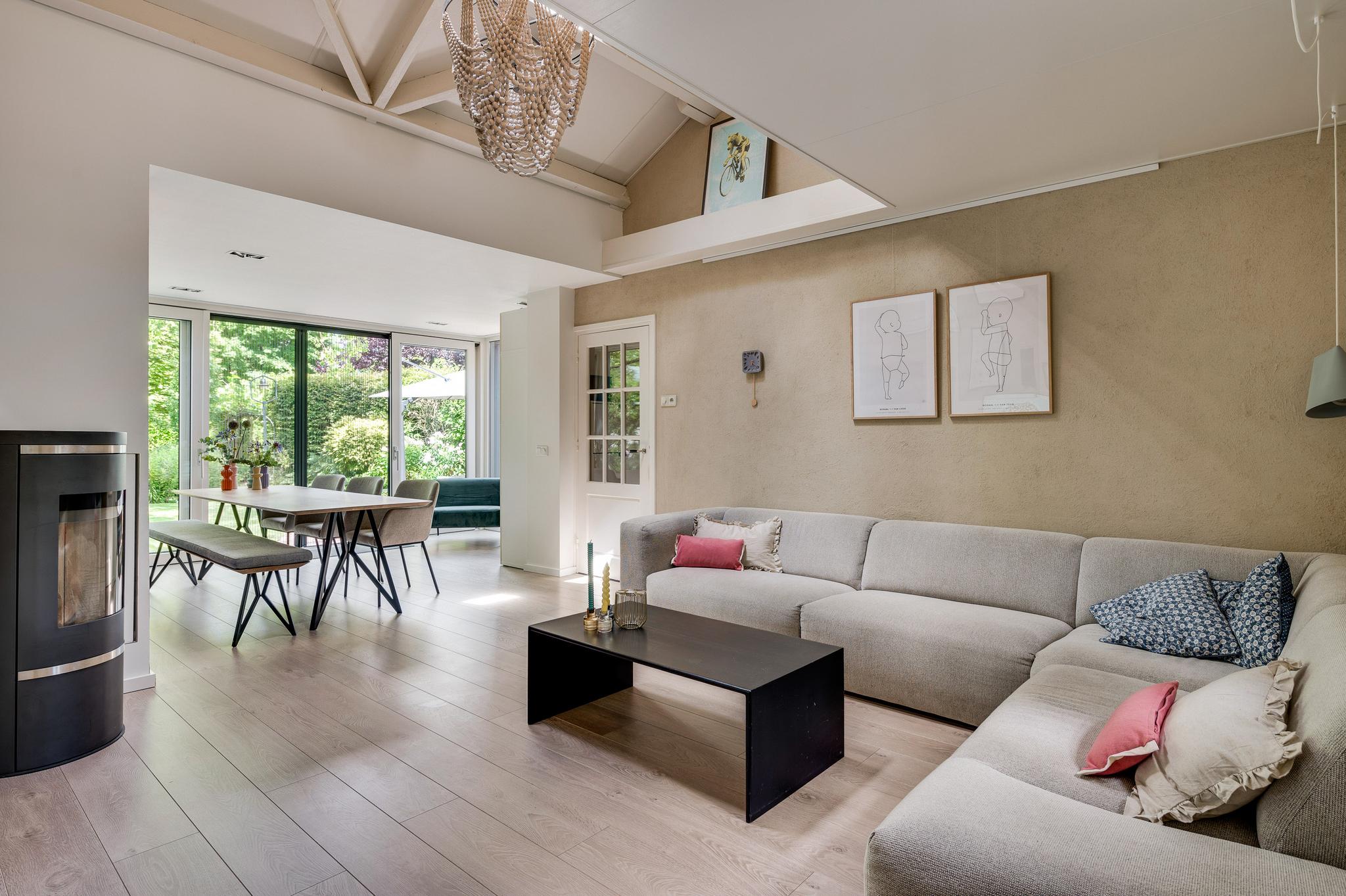 De tussenkamer (4,01 x 2,44) is een mooie ruimte voor uw boekencollectie of om te gebruiken als werkkamer, hobbyruimte of speelkamer van de kinderen. In de hoek van deze kamer is een doorgang naar de spectaculaire woonkamer met een grote uitbouw aan de achterzijde. De pelletkachel, vide en grote schuifpui zorgen samen voor een woonkamer met sfeer.