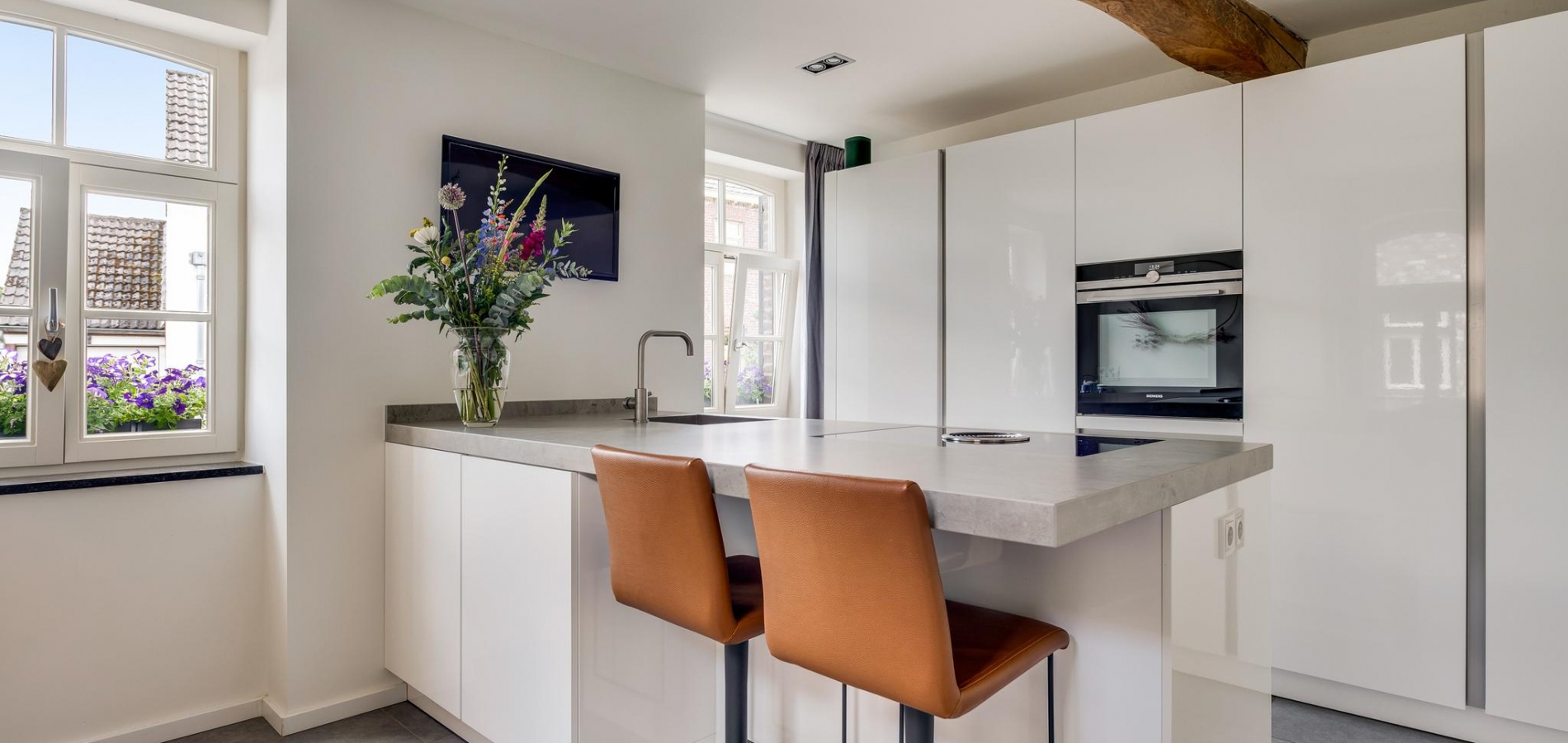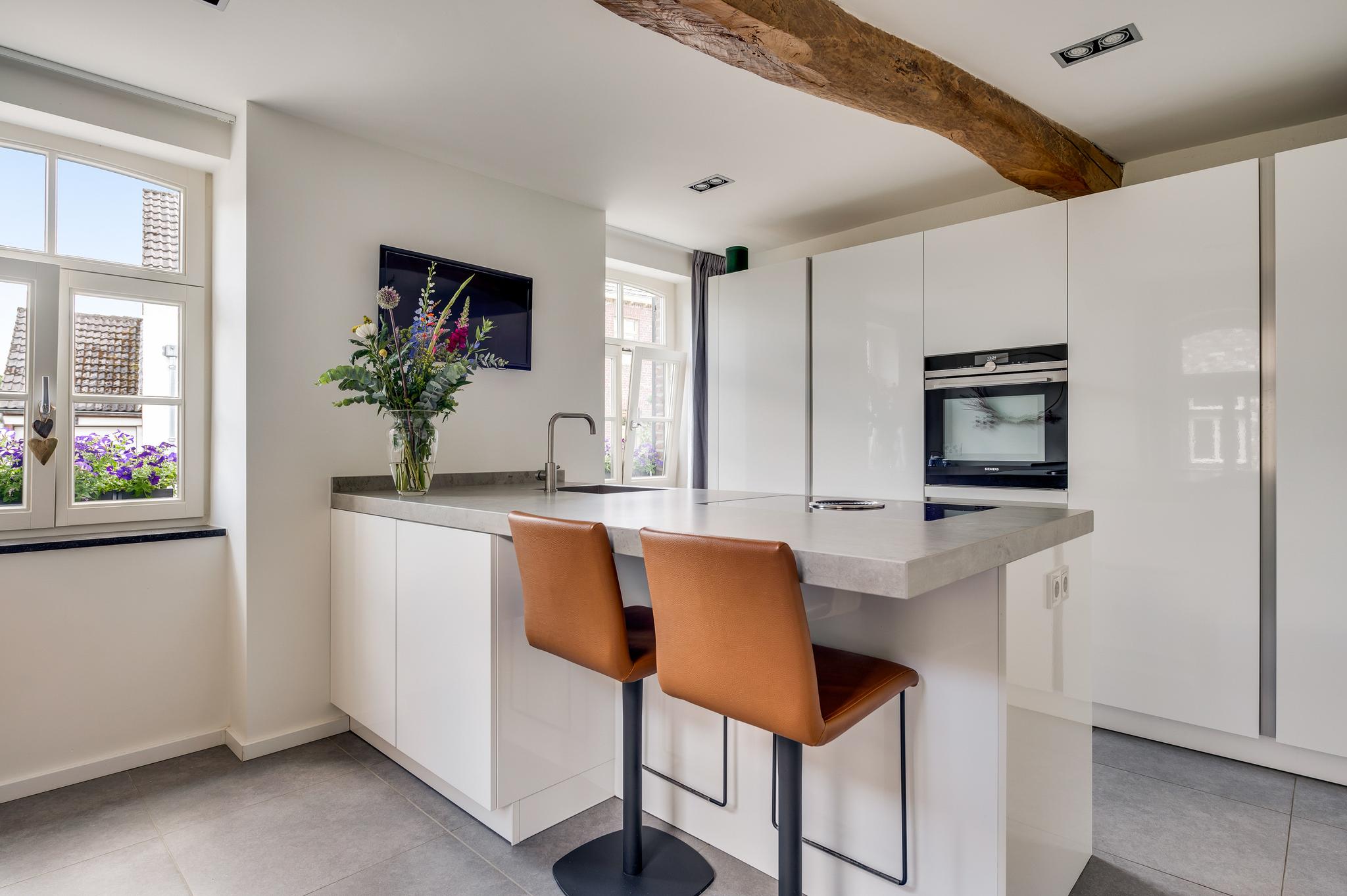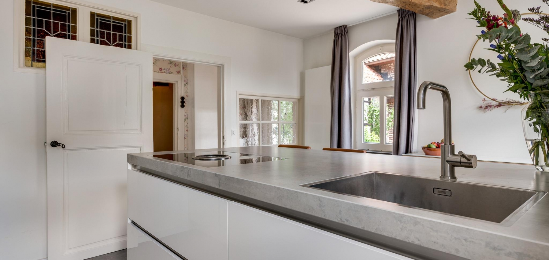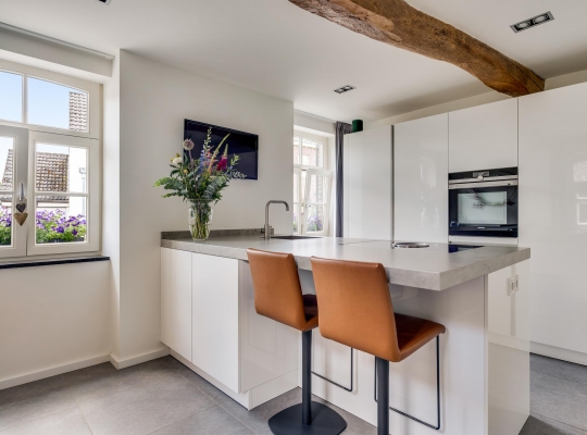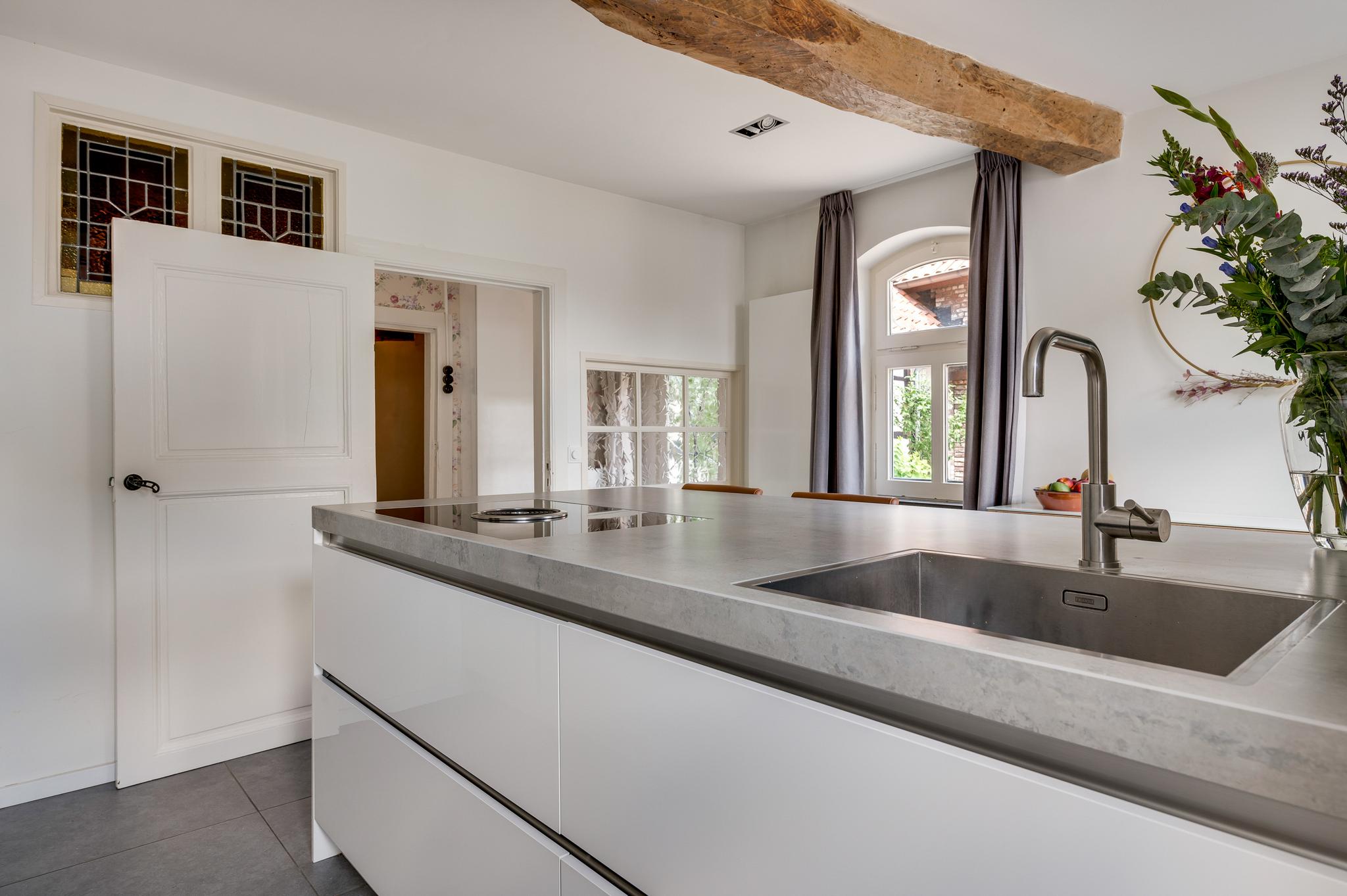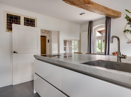 In de moderne keuken (4,30 x 3,65) zijn oud en nieuw gecombineerd. De eikenhouten balk en het glas-in-loodraam passen goed bij het strakke stucwerk en de moderne keukenopstelling (2014) met groot eiland. Alle benodigde apparatuur van Siemens en Bora is ingebouwd: een inductie kookplaat met afzuiging, een koelkast, vriezer, vaatwasser, combi-stoomoven en een warmwaterkraan.