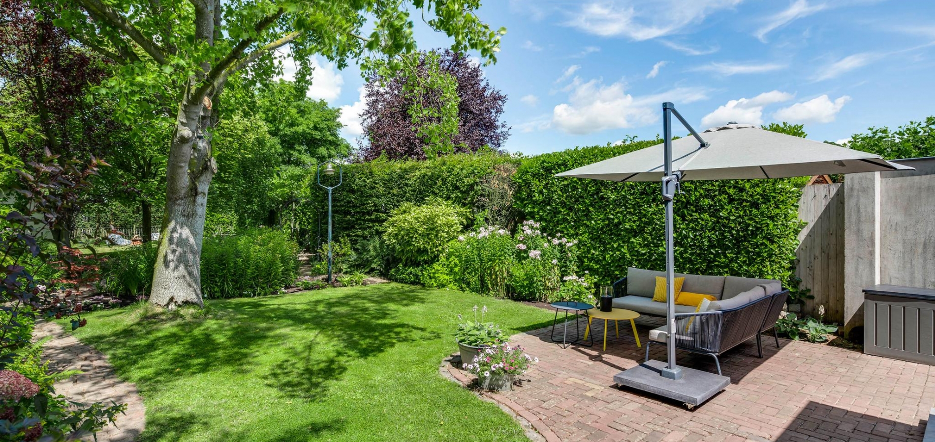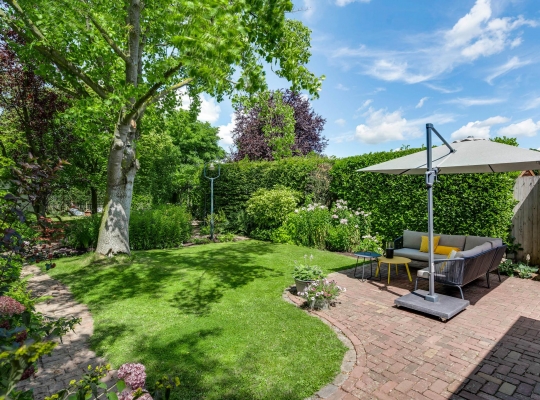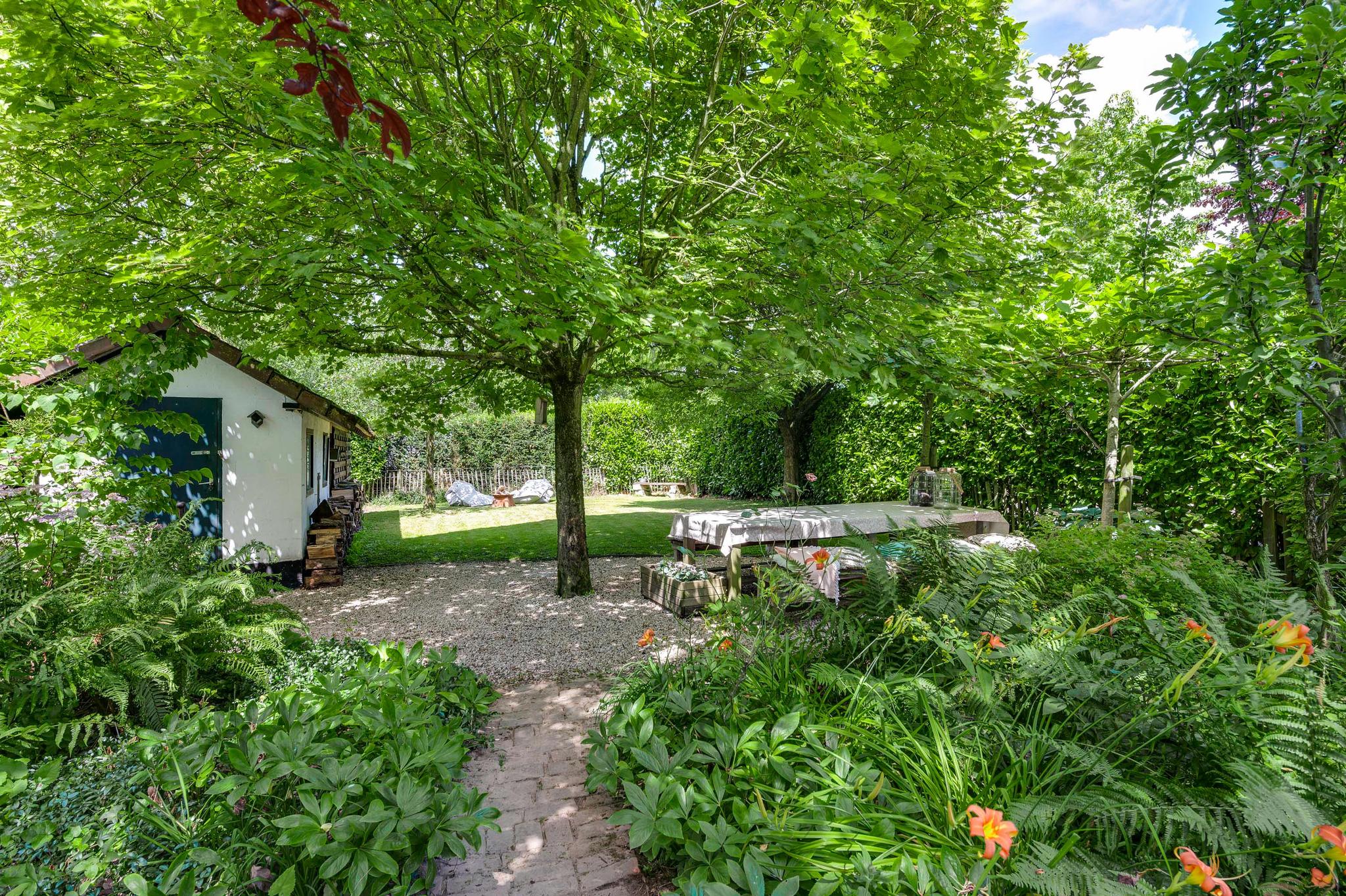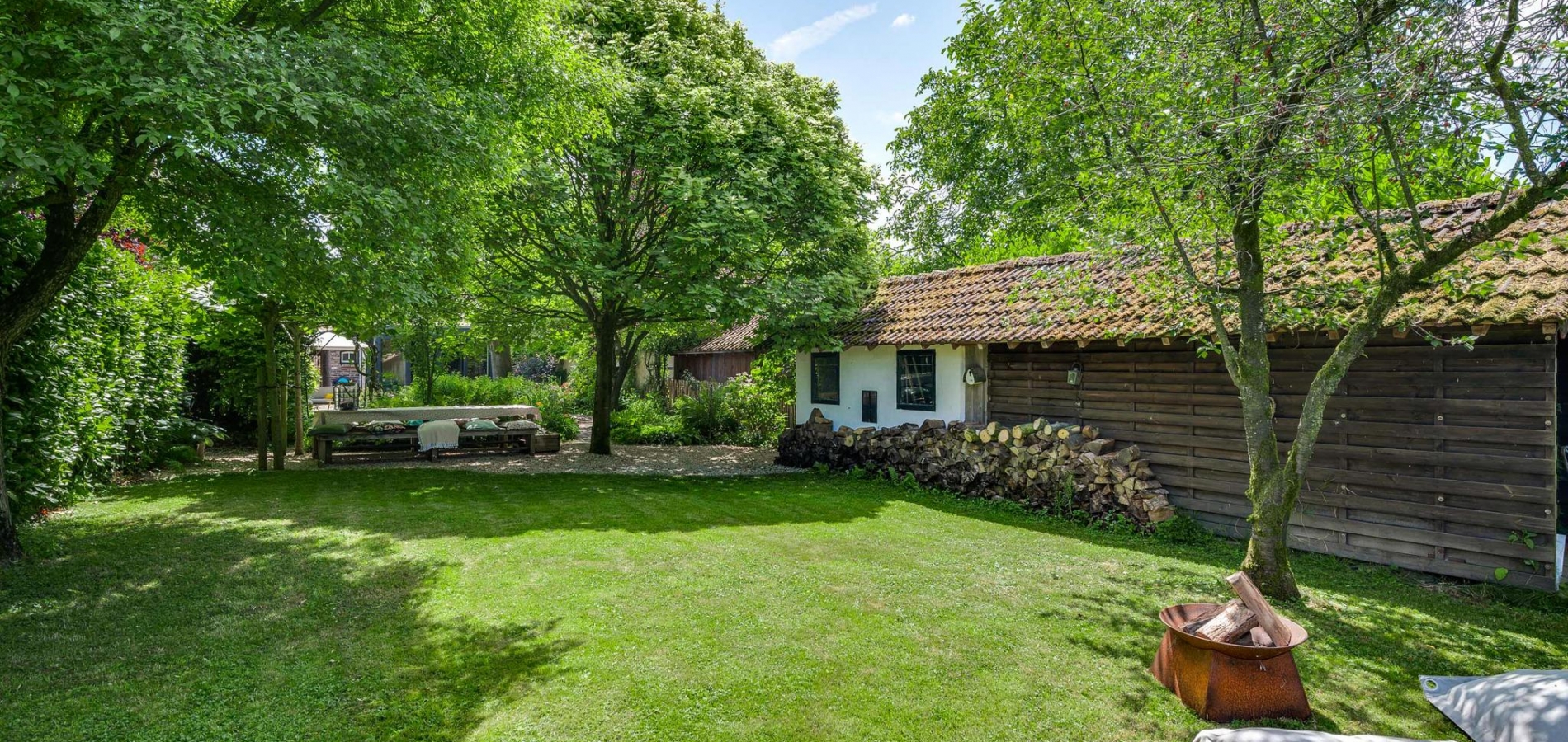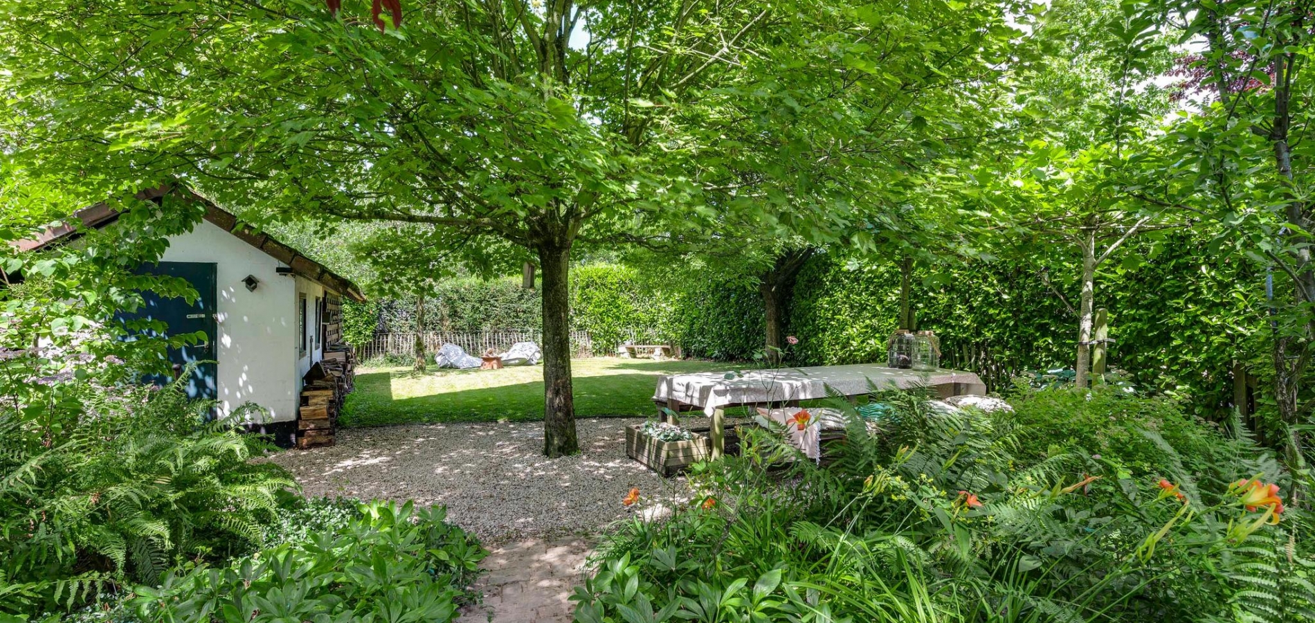 De diepe achtertuin is een oase van groen. Groene hagen, mooie bomen en borders met gevarieerde beplanting vormen een mooie compositie. Bij het grote terras ziet u een doorgang naar de sfeervolle voortuin met mooie hortensia’s. Volg het pad in de achtertuin naar het tweede terras, gesitueerd onder een hoge boom. Hier ziet u ook de schuur/hobbyruimte, die uit twee ruimtes bestaat. Ruimte I (3,37 x 2,12) is de voorste ruimte met ramen aan de tuinzijde. Ruimte II (4,72 x 2,22) is de grootste ruimte met openslaande deuren en een bergvliering. Perfect voor opslag, als hobbyruimte of wellicht heeft u een andere invulling?