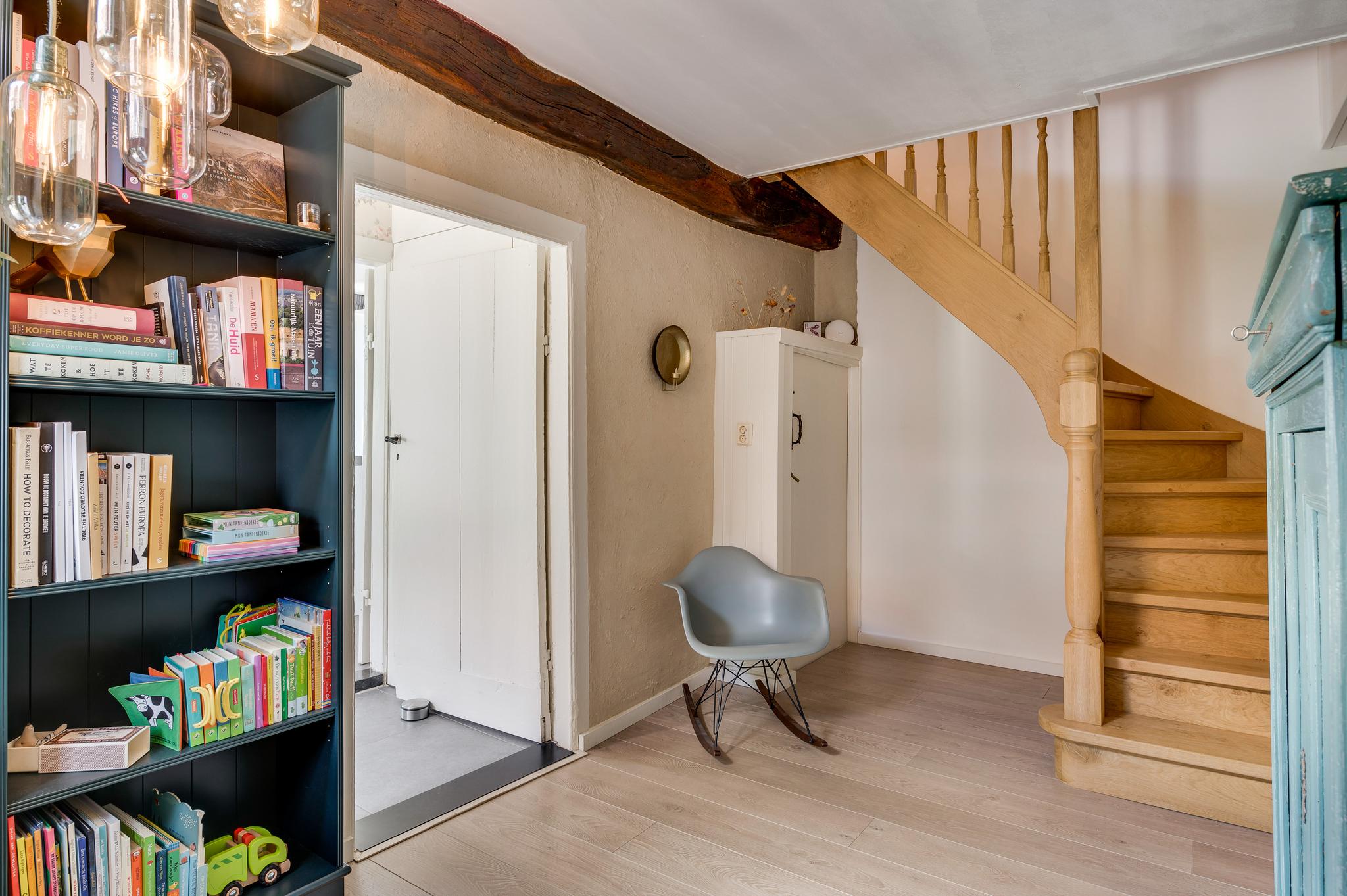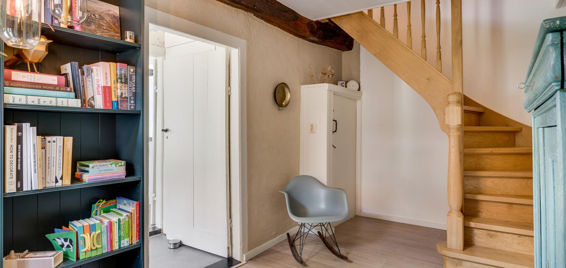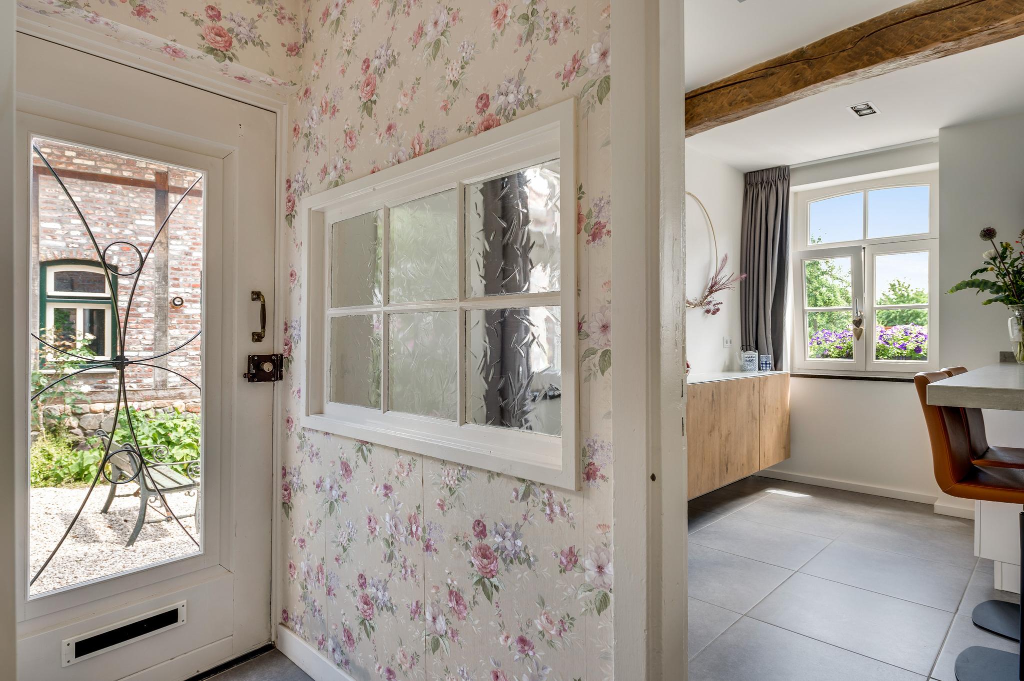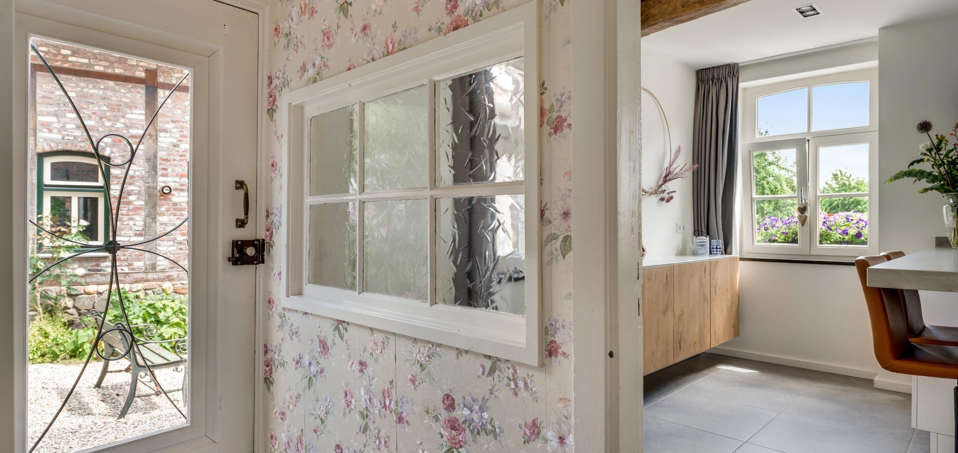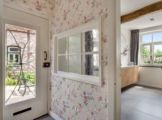 Loop over het grindpad naar de entree van dit fantastische woonhuis. De hal met sfeervol bloemenbehang staat in verbinding met de keuken, een inbouwkast en een tussenkamer met eikenhouten trap.